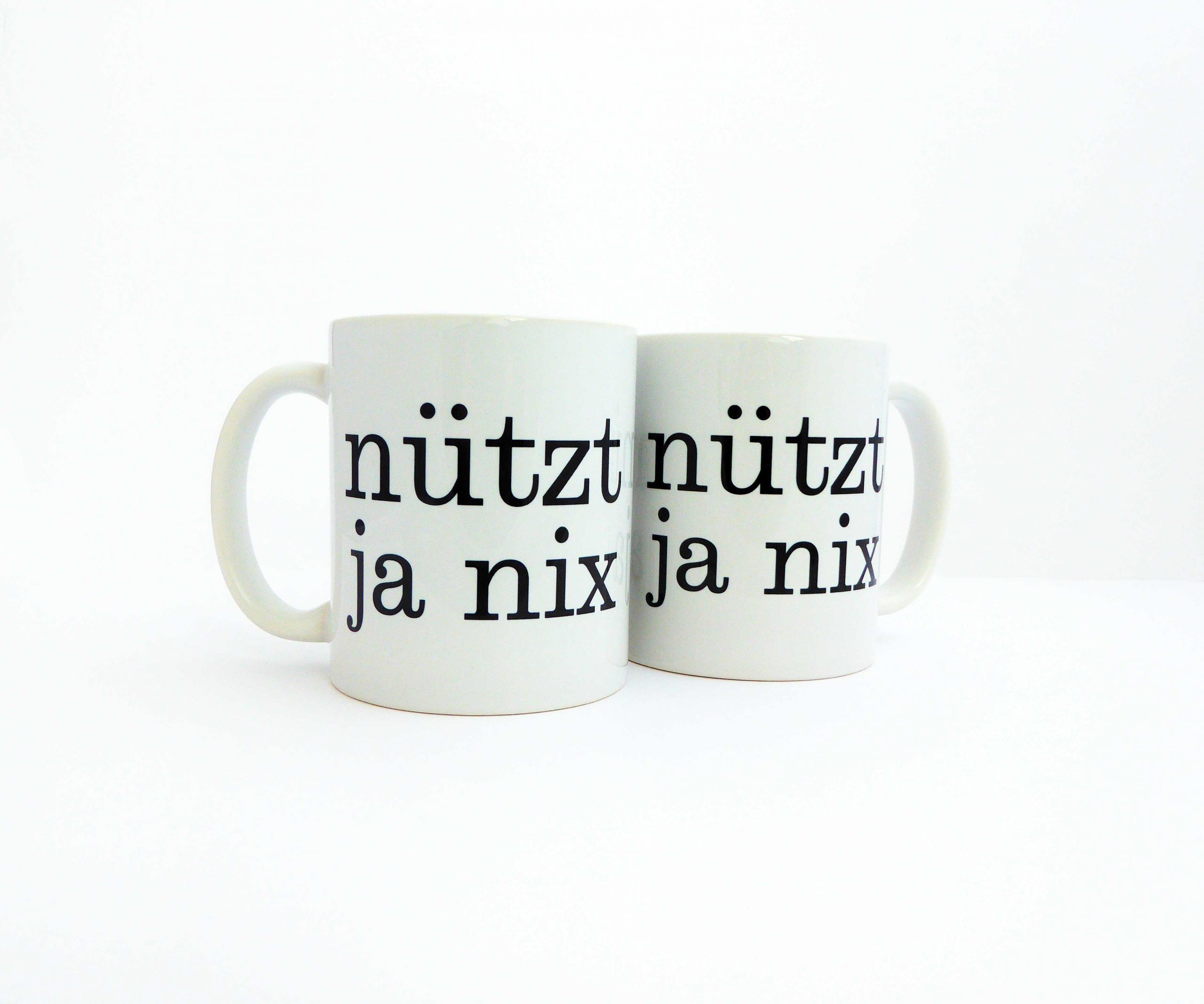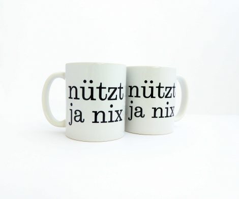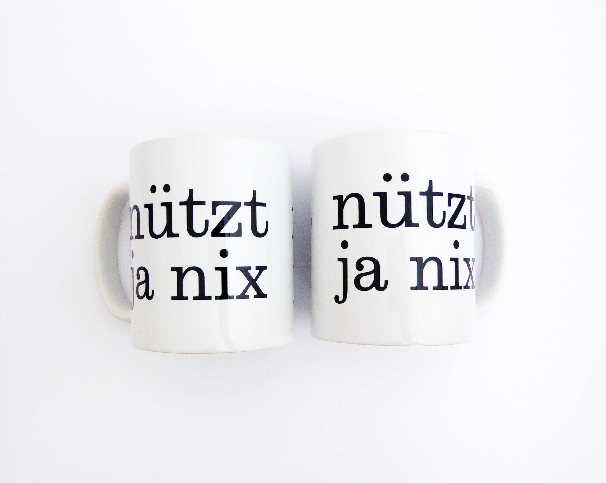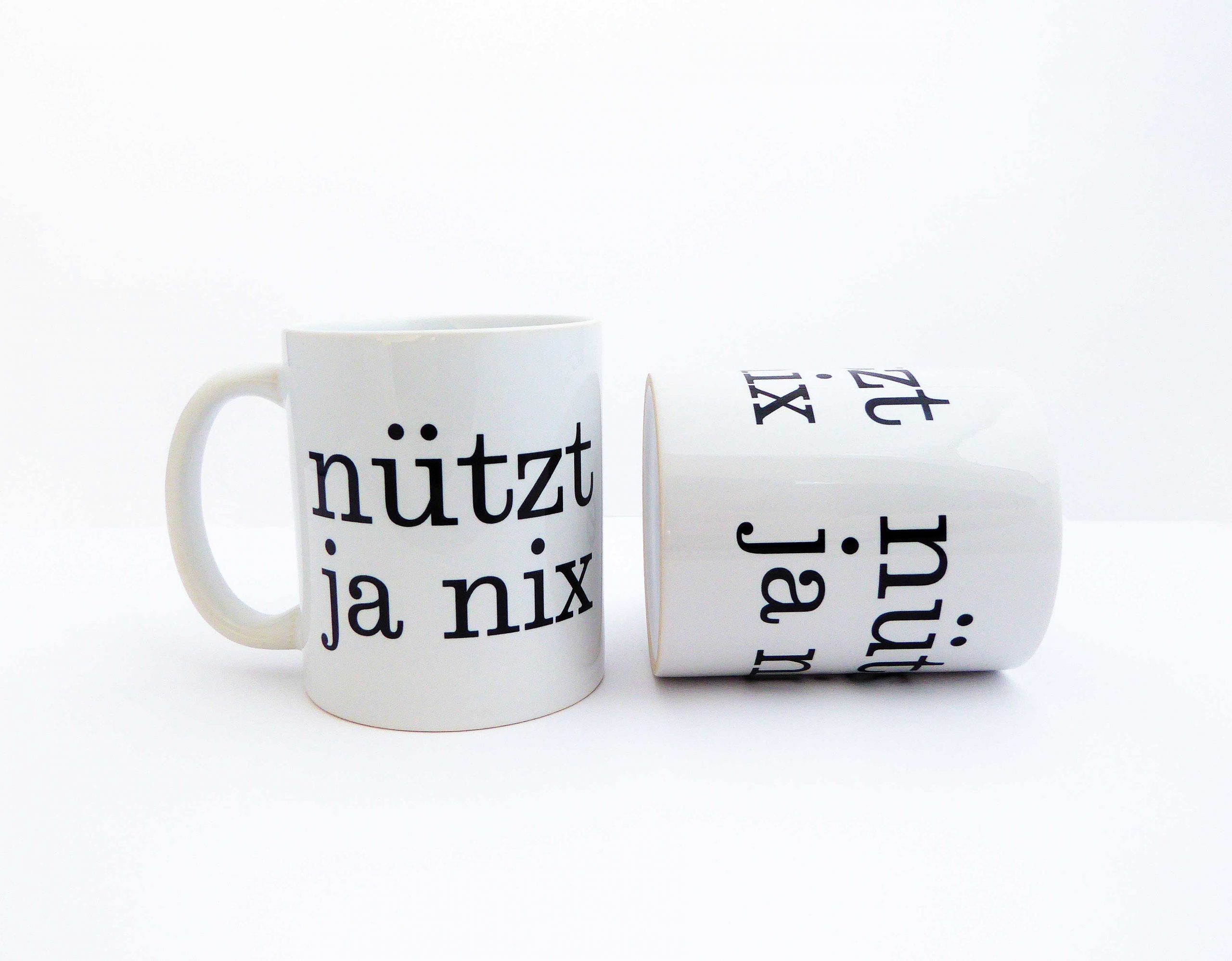Unsere Tasse mit unserem nützt ja nix Typo Druck ist ein schönes Stück für Deine Küche.
