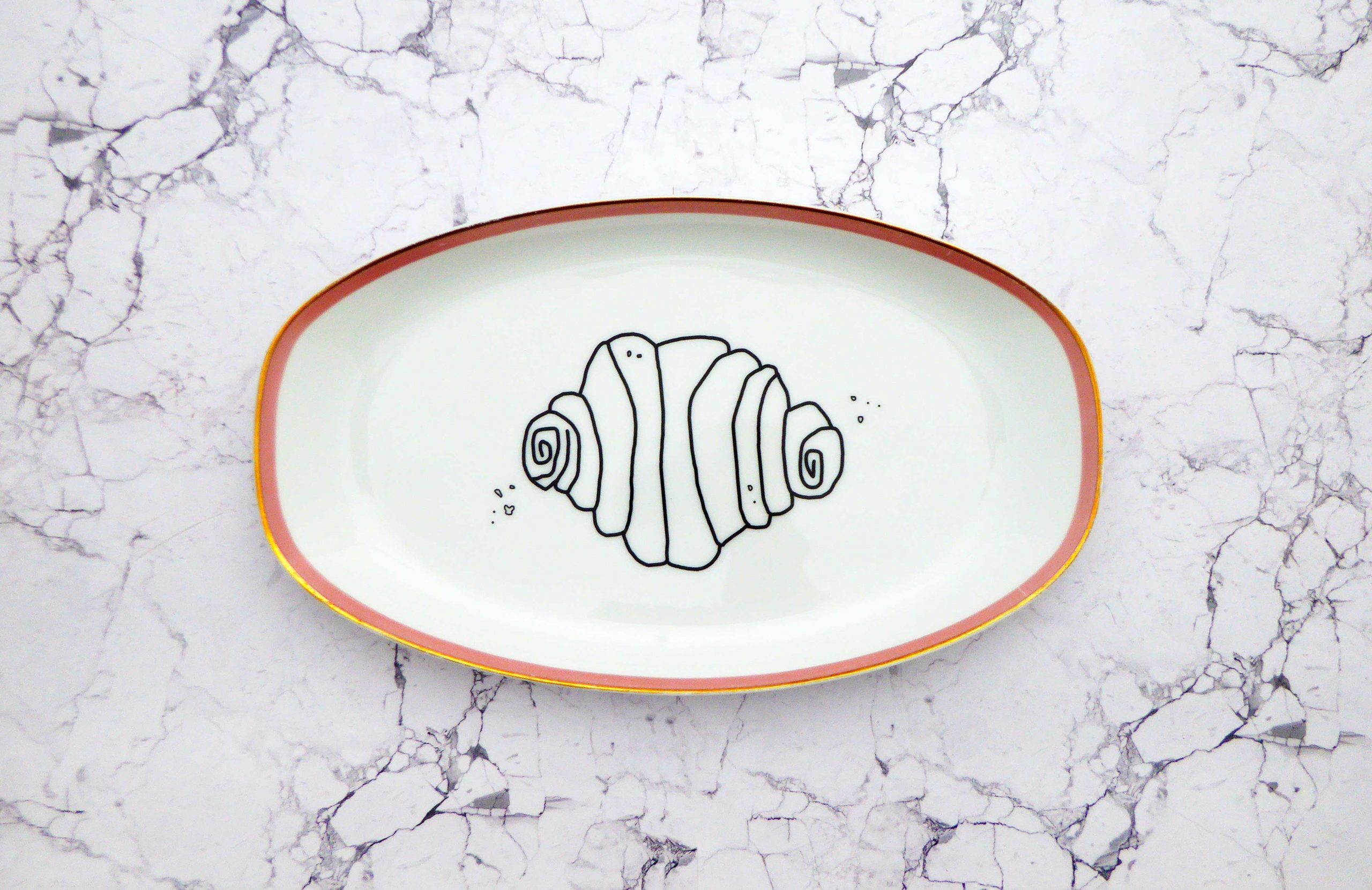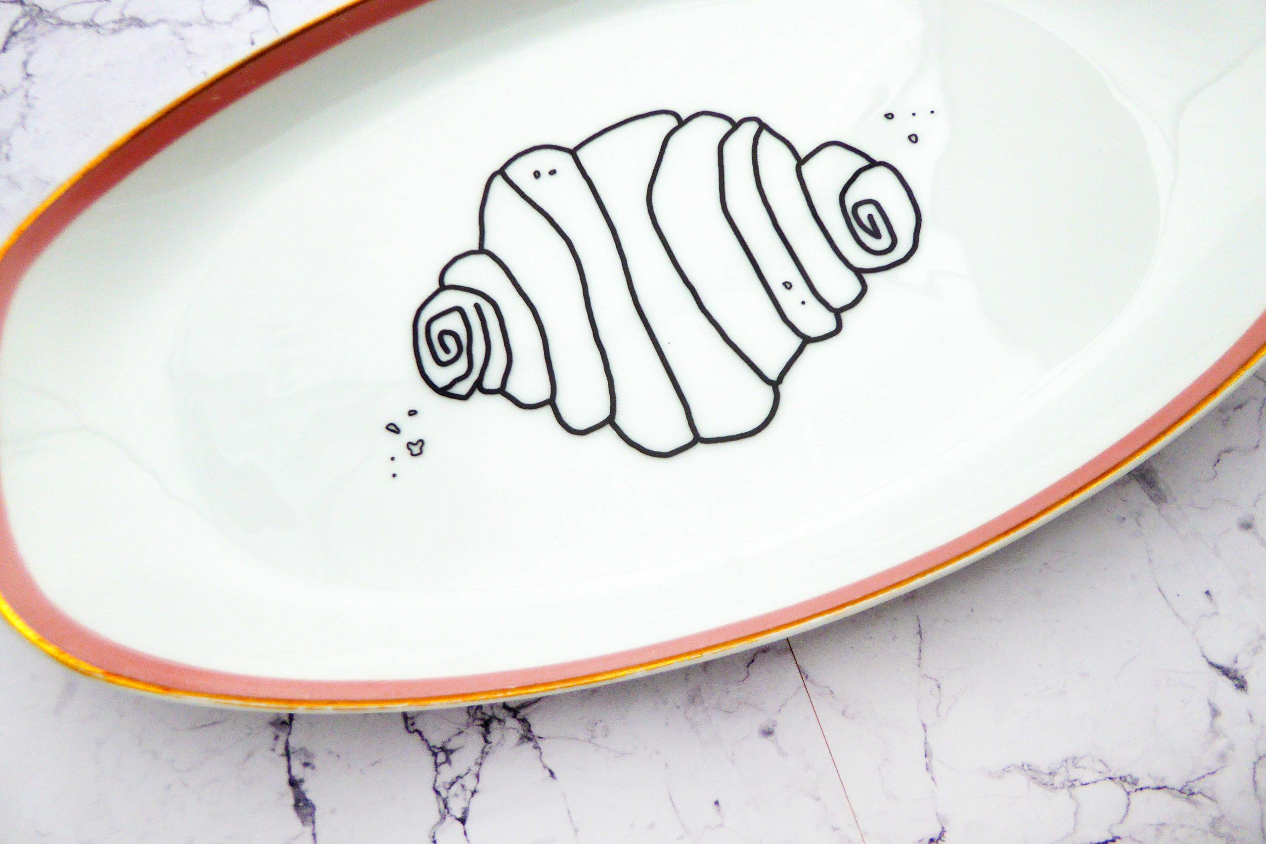 Jeder Wandteller wird handgefertigt und jeder der vintage Teller ist immer wieder ein Einzelstück. Dieser schöne Wandplatte/teller hat einen Rosa/Goldrand mit leicht eckigem Rand und mit unserem Franzbrötchen Motiv kann er für alle Dekozwecke genutz werden.