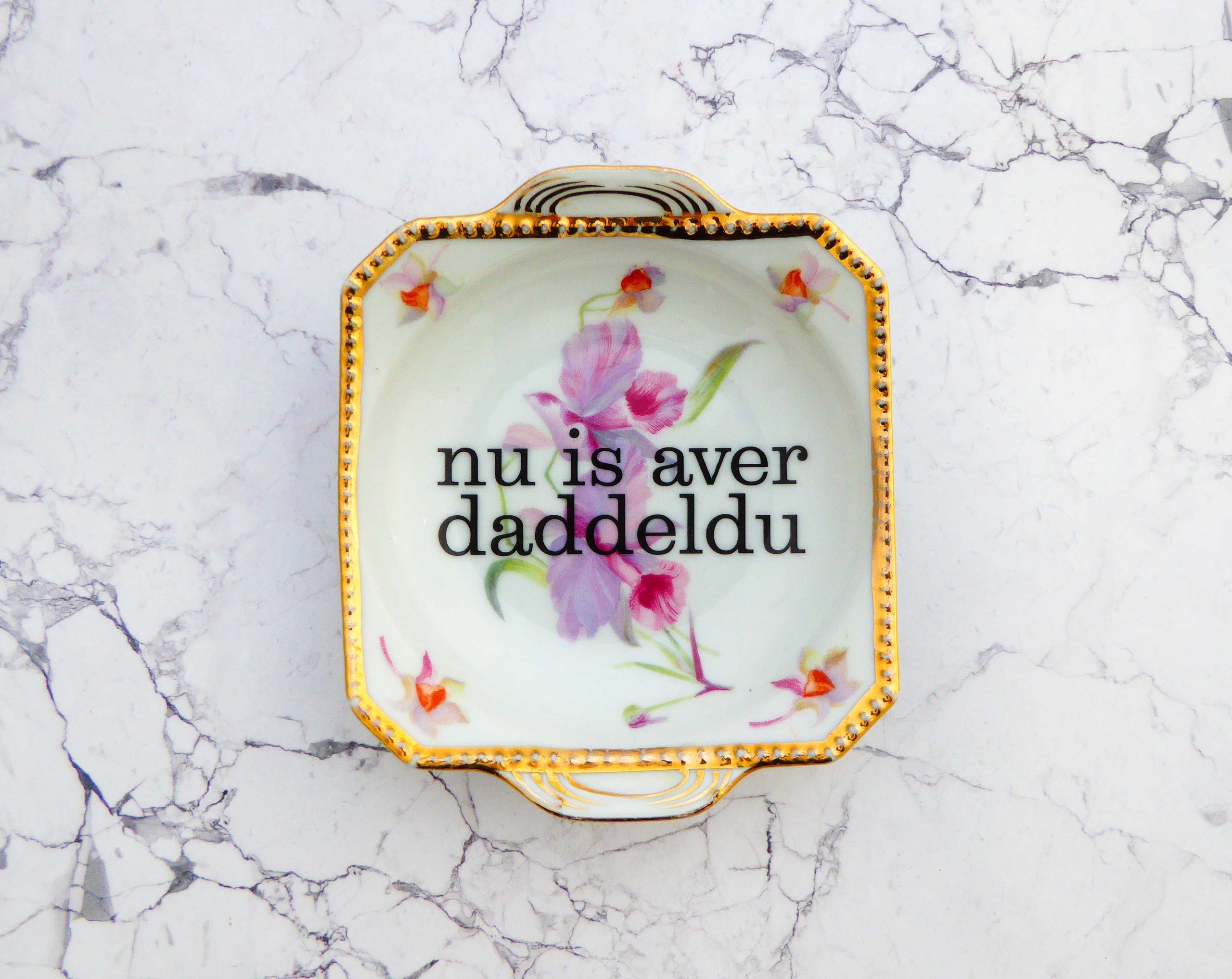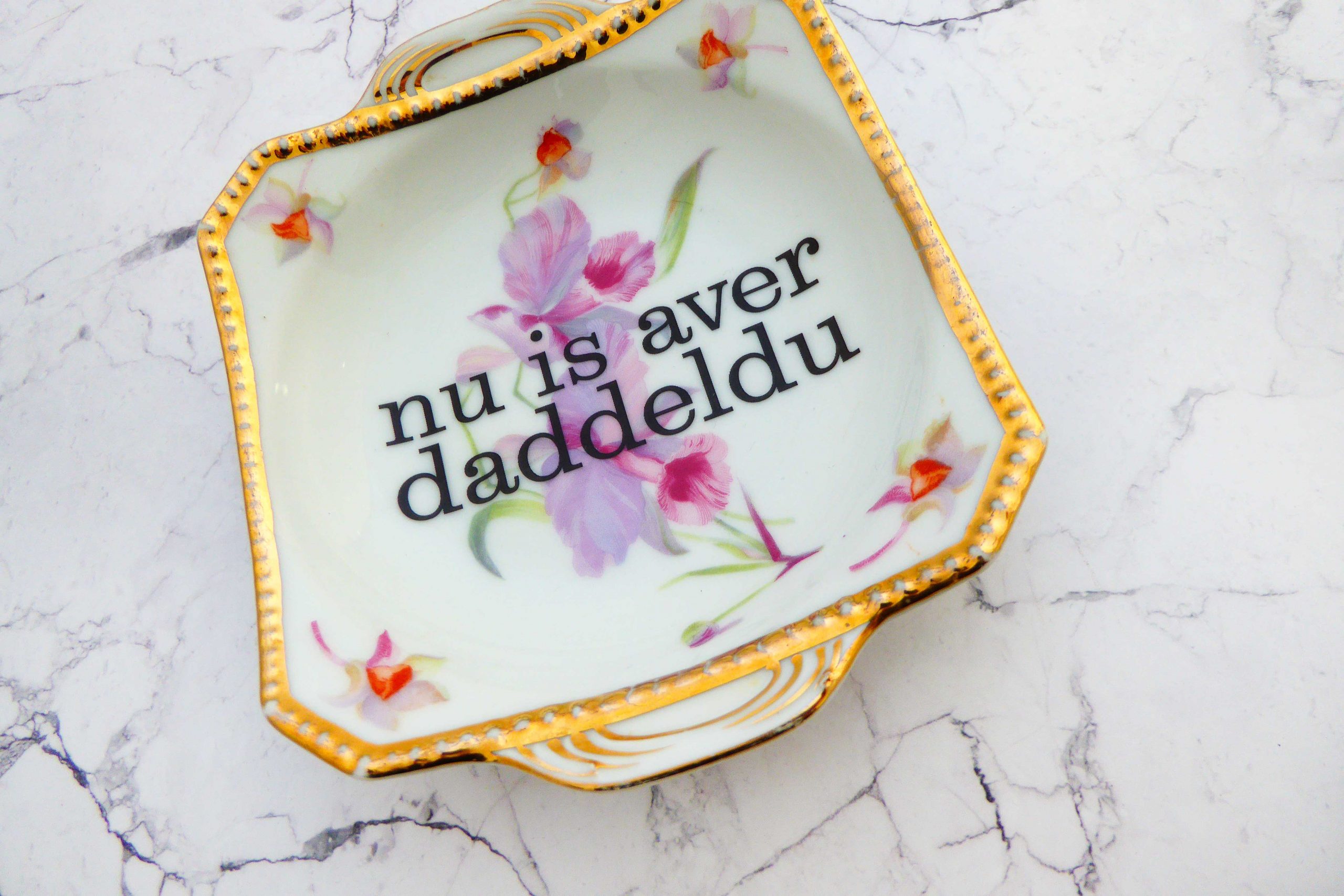 Dieser eckige Wandteller hat ein schönes Blumendecor, Goldrand und mit unserer daddeldu Typo kann er für alle Dekozwecke genutz werden.