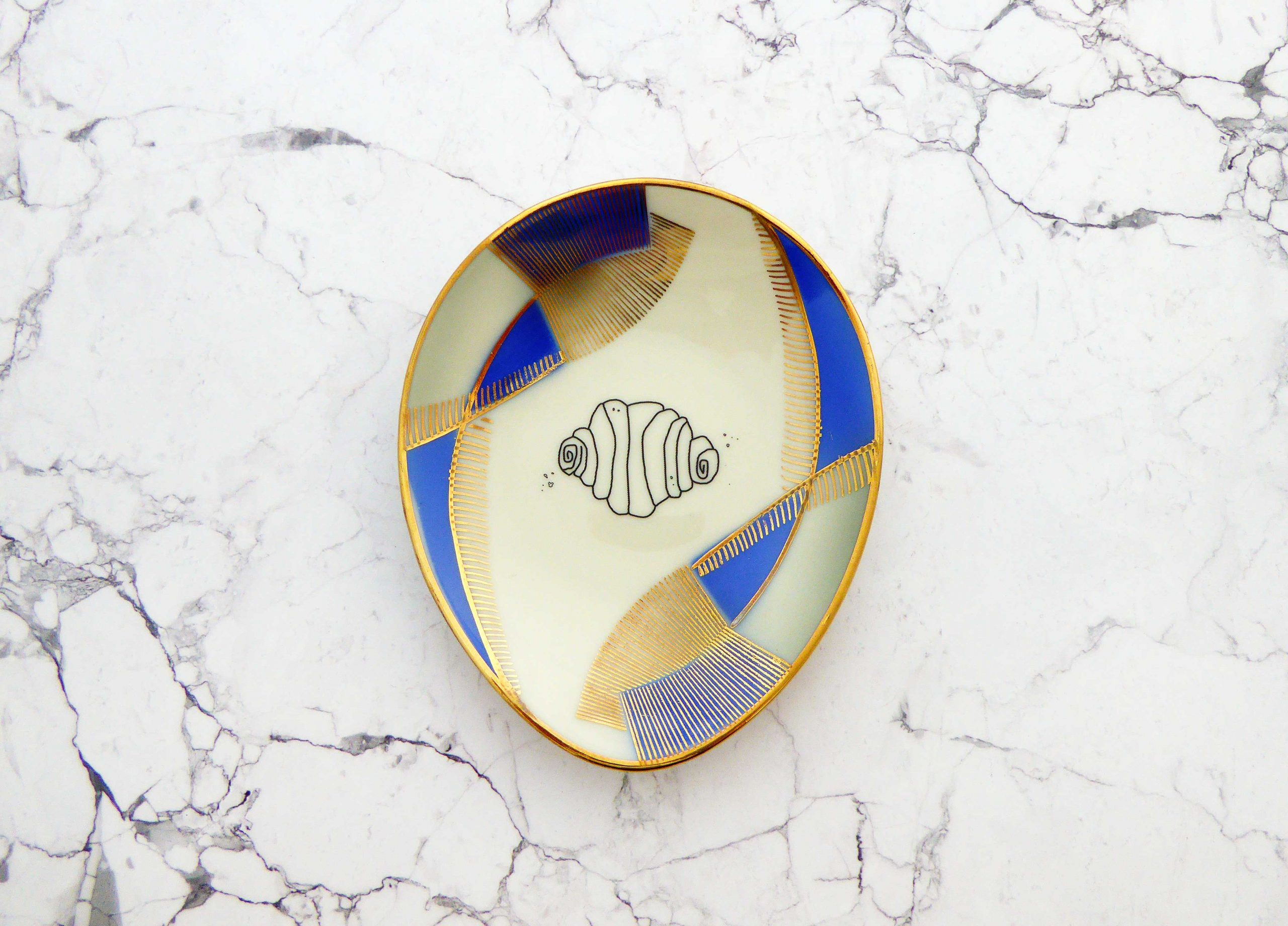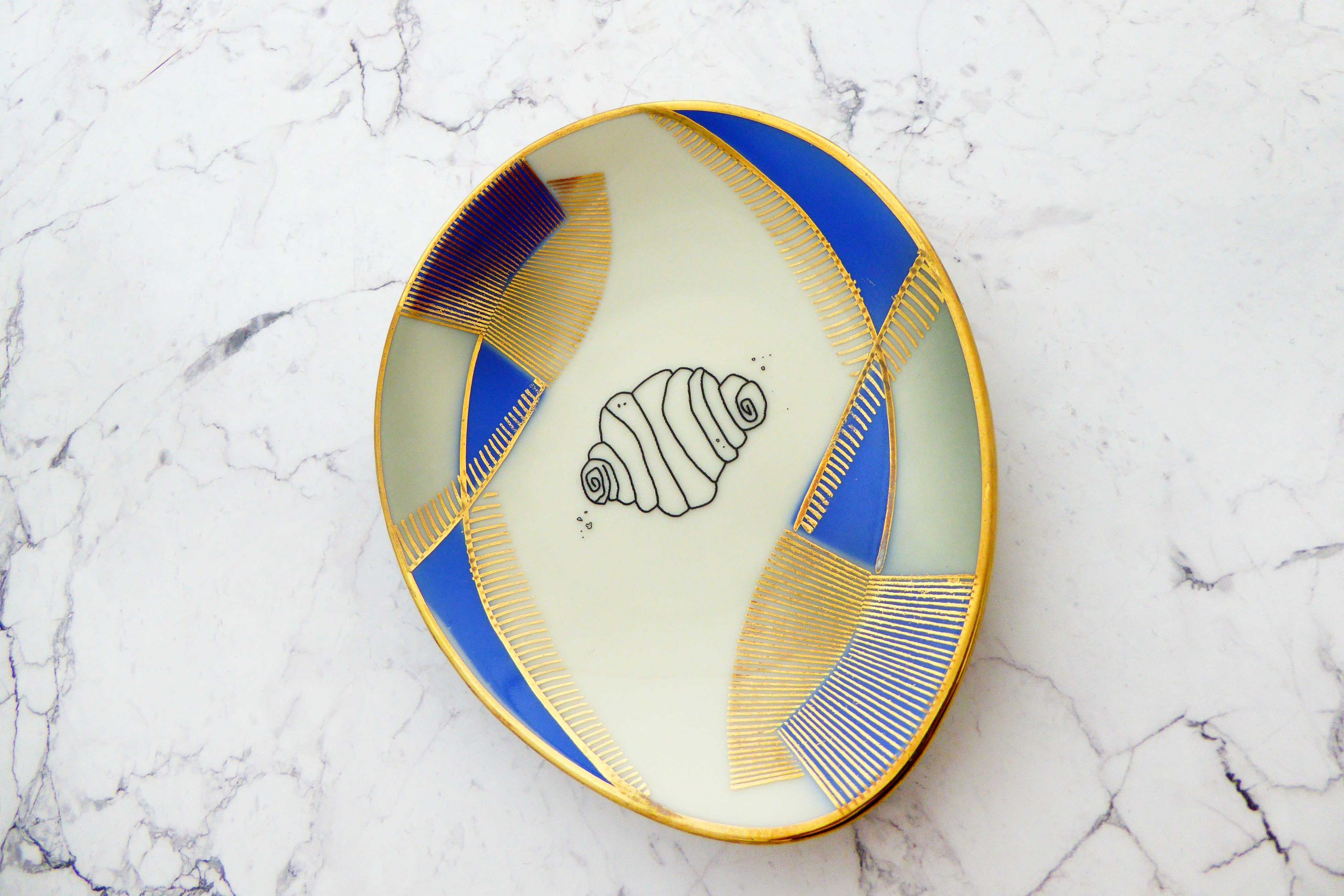 Jeder Wandteller wird handgefertigt und jeder der vintage Teller ist immer wieder ein Einzelstück. Dieser schöne Wandteller hat einen schönene Decor in blau/gold mit Muster und mit unserem Franzbrötchen Motiv kann er für alle Dekozwecke genutz werden.