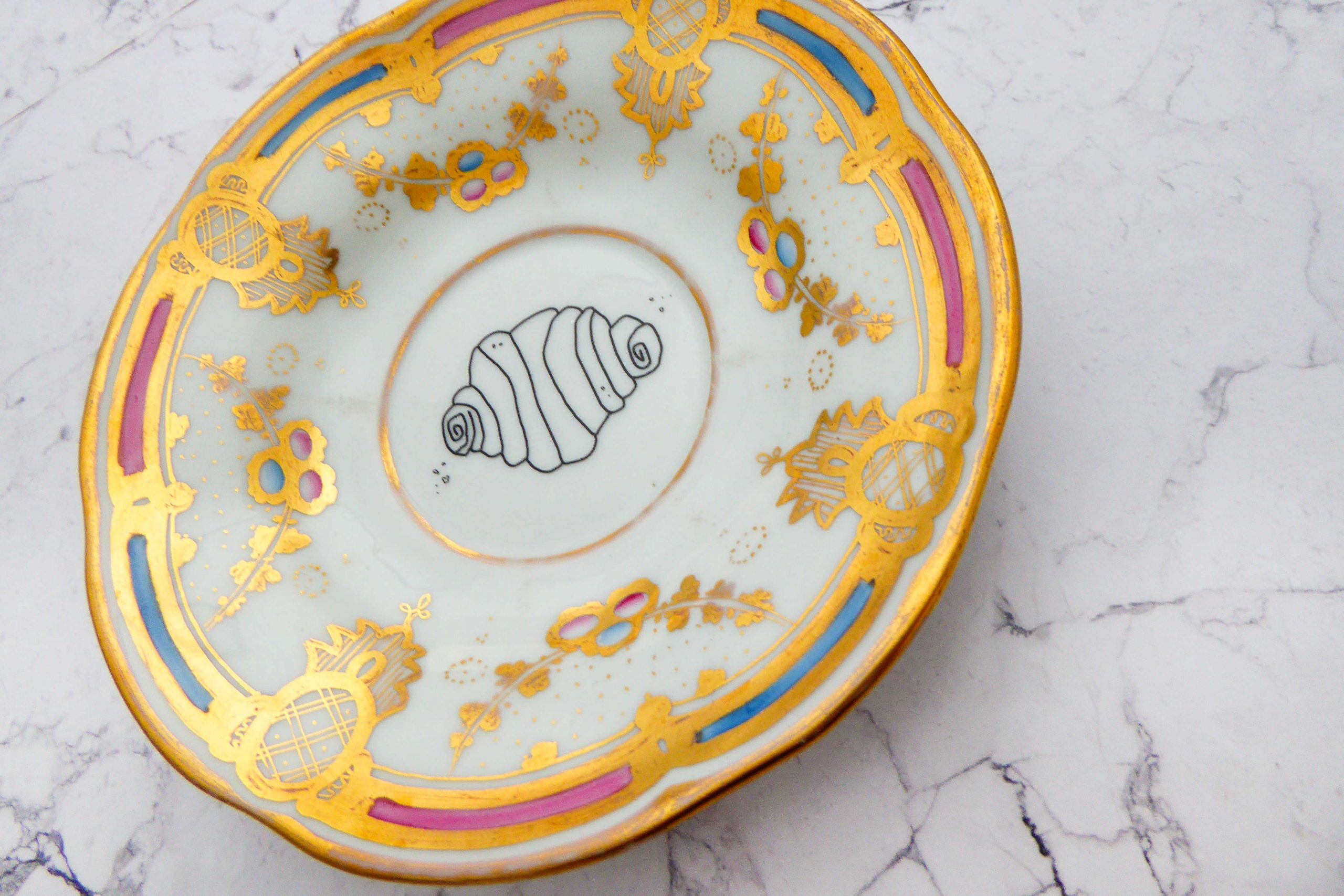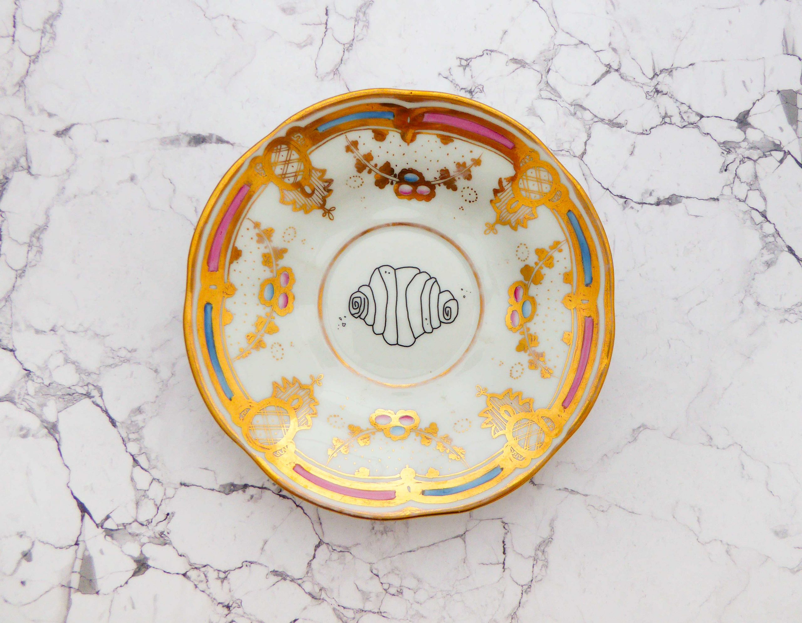 Jeder Wandteller wird handgefertigt und jeder der vintage Teller ist immer wieder ein Einzelstück. Dieser schöne Wandteller hat einen schönen Muster Goldrand in blau/rosa/gold und mit unserem Franzbrötchen Motiv kann er für alle Dekozwecke genutz werden.