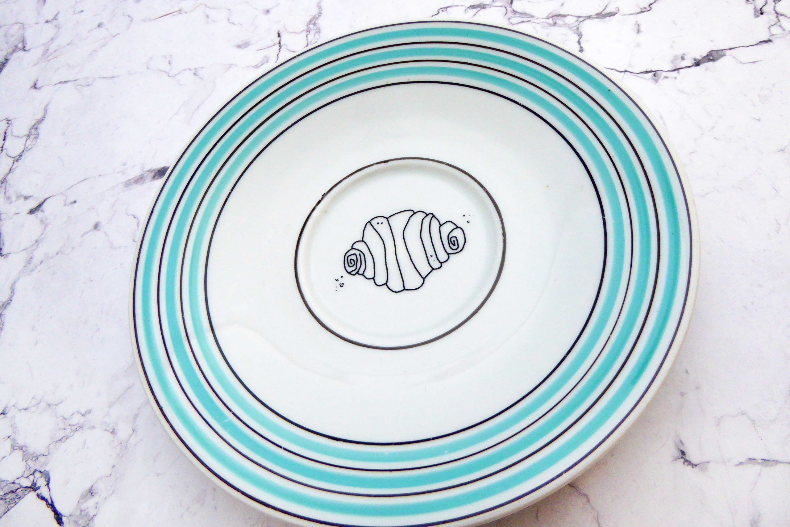 Jeder Wandteller wird handgefertigt und jeder der vintage Teller ist immer wieder ein Einzelstück. Dieser schöne Wandteller hat einen schönene Decor in mint/braun mit Ringe Muster und mit unserem Franzbrötchen Motiv kann er für alle Dekozwecke genutz werden.