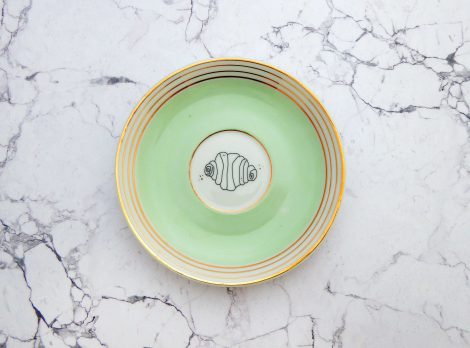 Jeder Wandteller wird handgefertigt und jeder der vintage Teller ist immer wieder ein Einzelstück. Dieser schöne Wandteller hat einen schönen Mint/Goldrand und mit unserem Franzbrötchen Motiv kann er für alle Dekozwecke genutz werden.