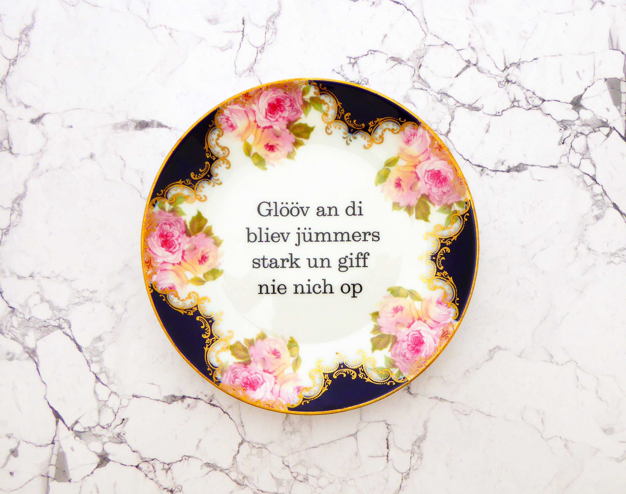 Wandteller Glööv Typo vintage Herr Fuchs Teller gold Blumen 17cm blau plattdeutsch