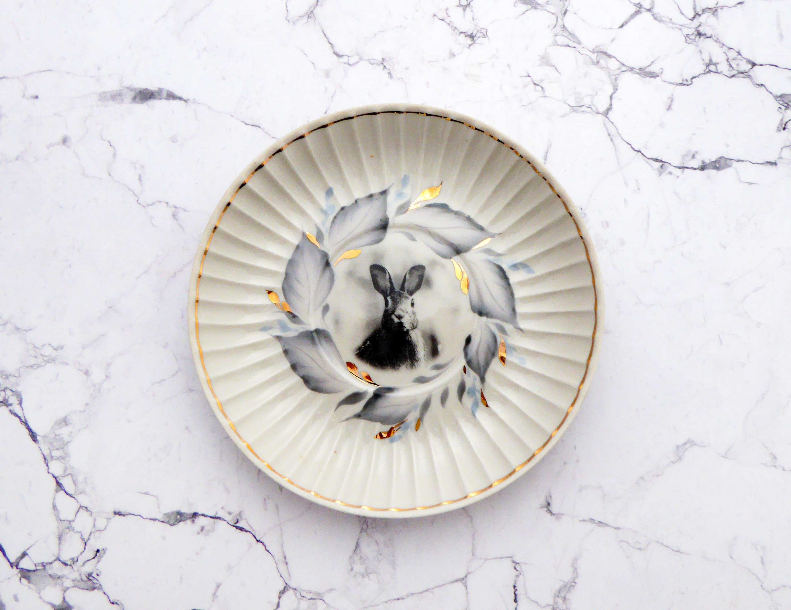 Jeder Wandteller wird handgefertigt und jeder der vintage Teller ist immer wieder ein Einzelstück. Dieser besondere Wandteller hat einen schönen golden Rand mit Muster und mit unserem Hase kann er für alle Dekozwecke genutz werden.