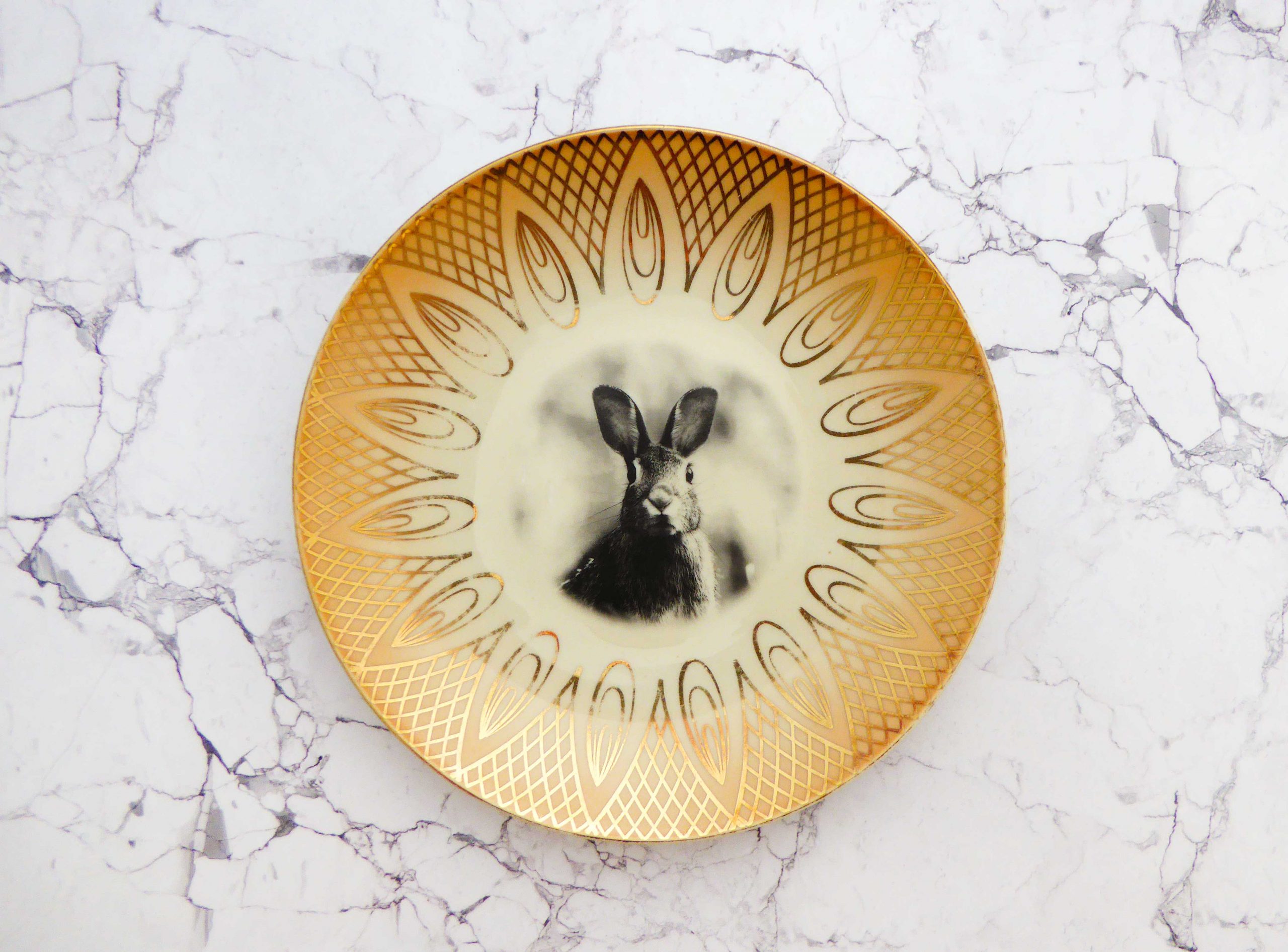 Dieser besondere Wandteller hat einen schönen Gold/Creme Rand mit Muster. Mit unserem Hasen Motiv kann er für alle Dekozwecke genutz werden.