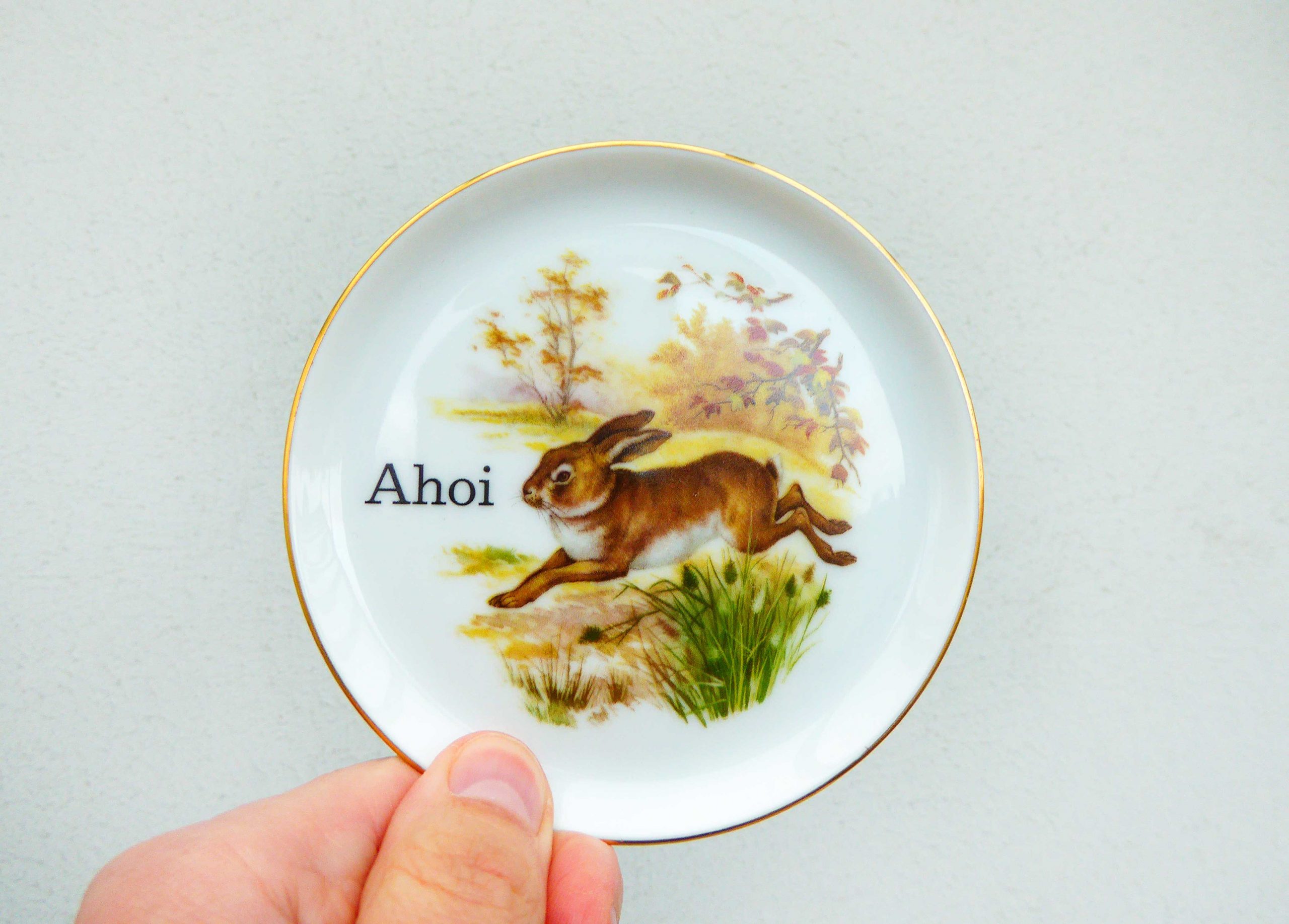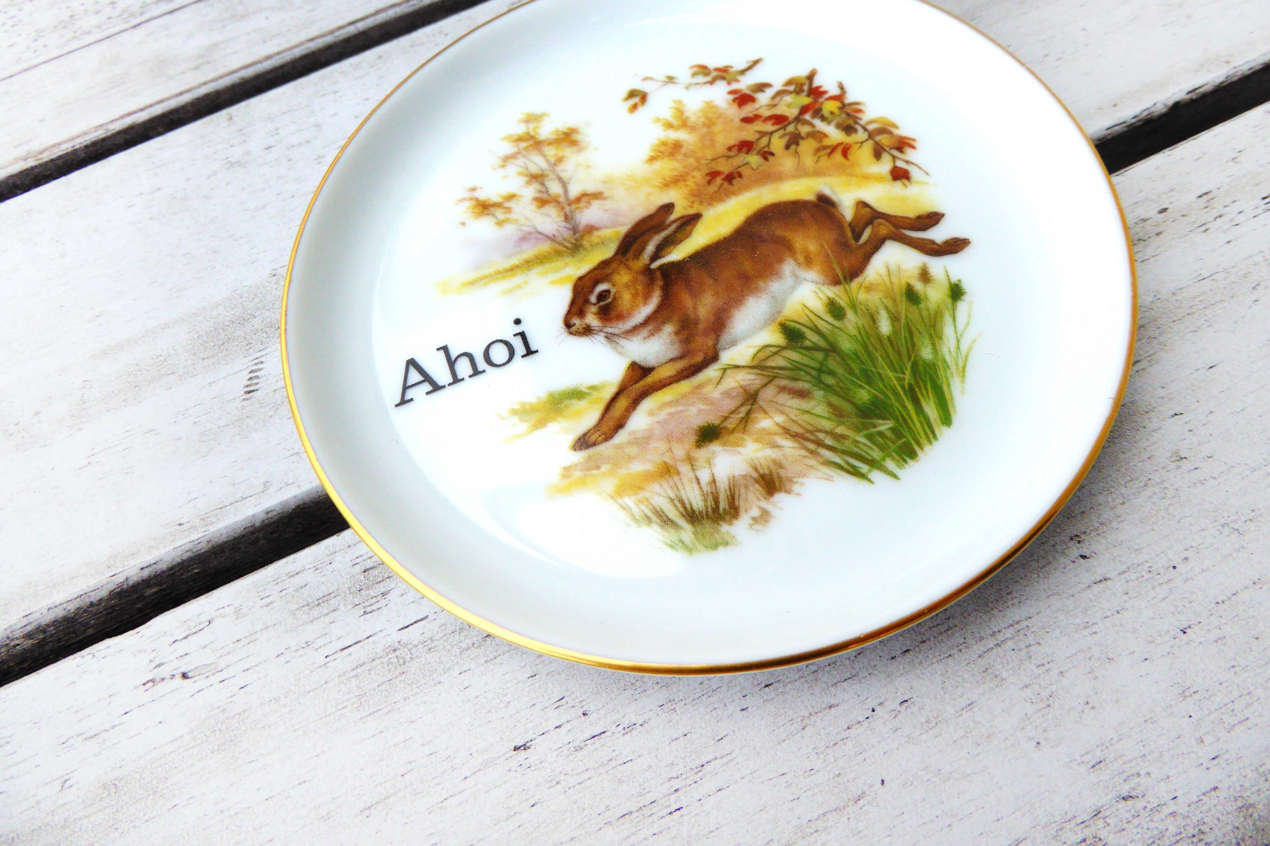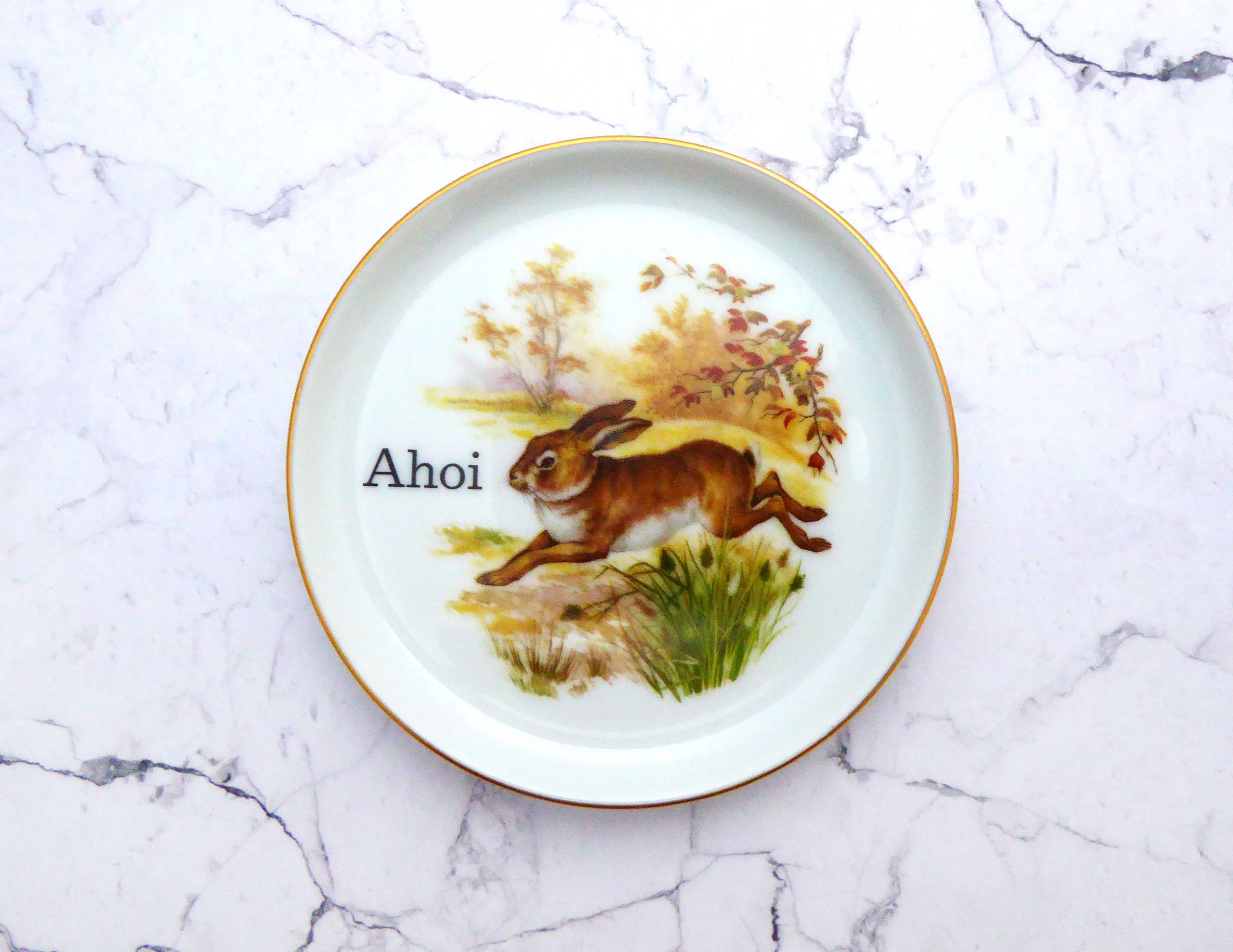 Jeder Wandteller wird handgefertigt. Dieser mini Wandteller hat ein schönes Hasen Decor und mit unserer Ahoi Typo kann er für alle Dekozwecke genutz werden.
