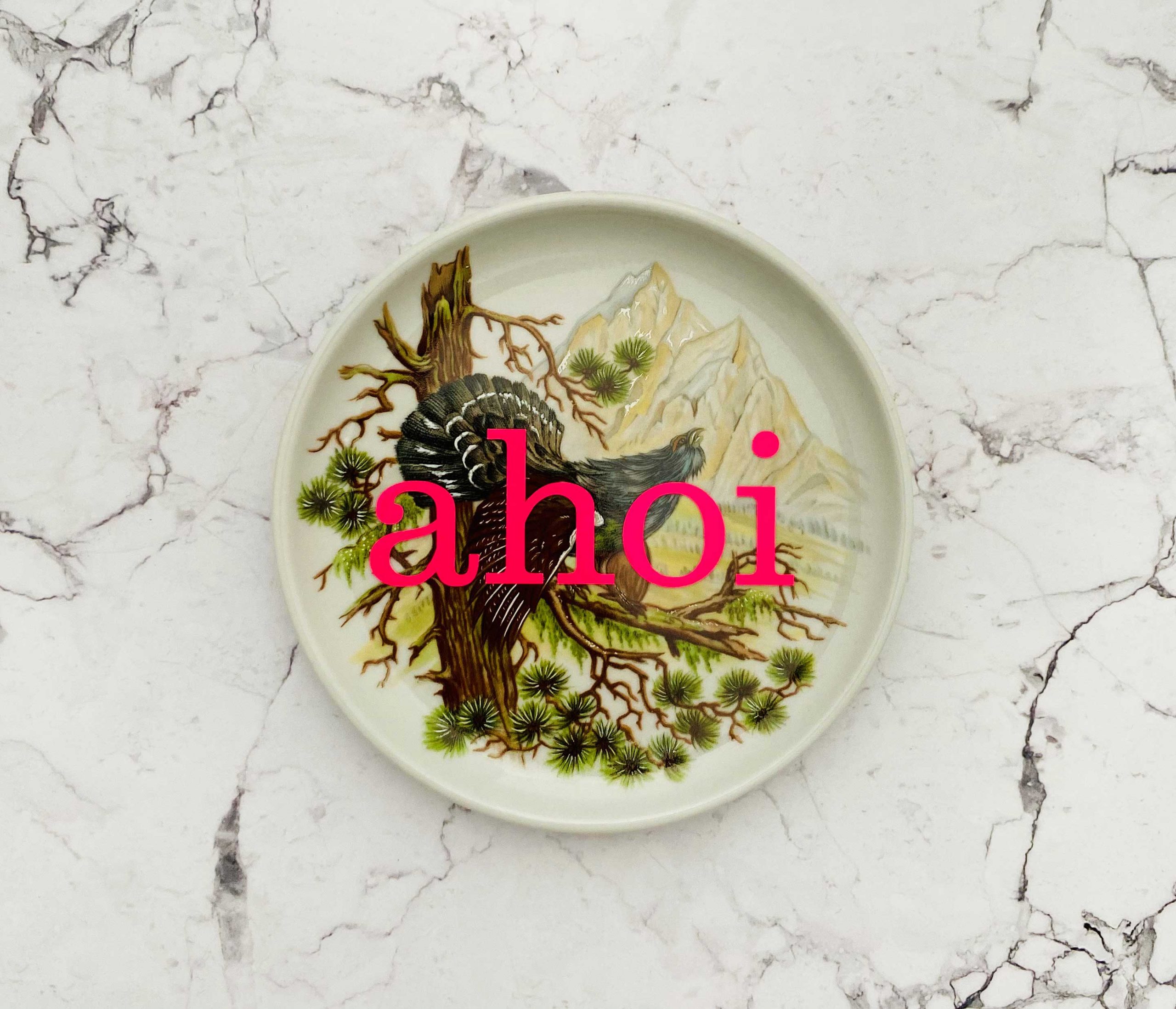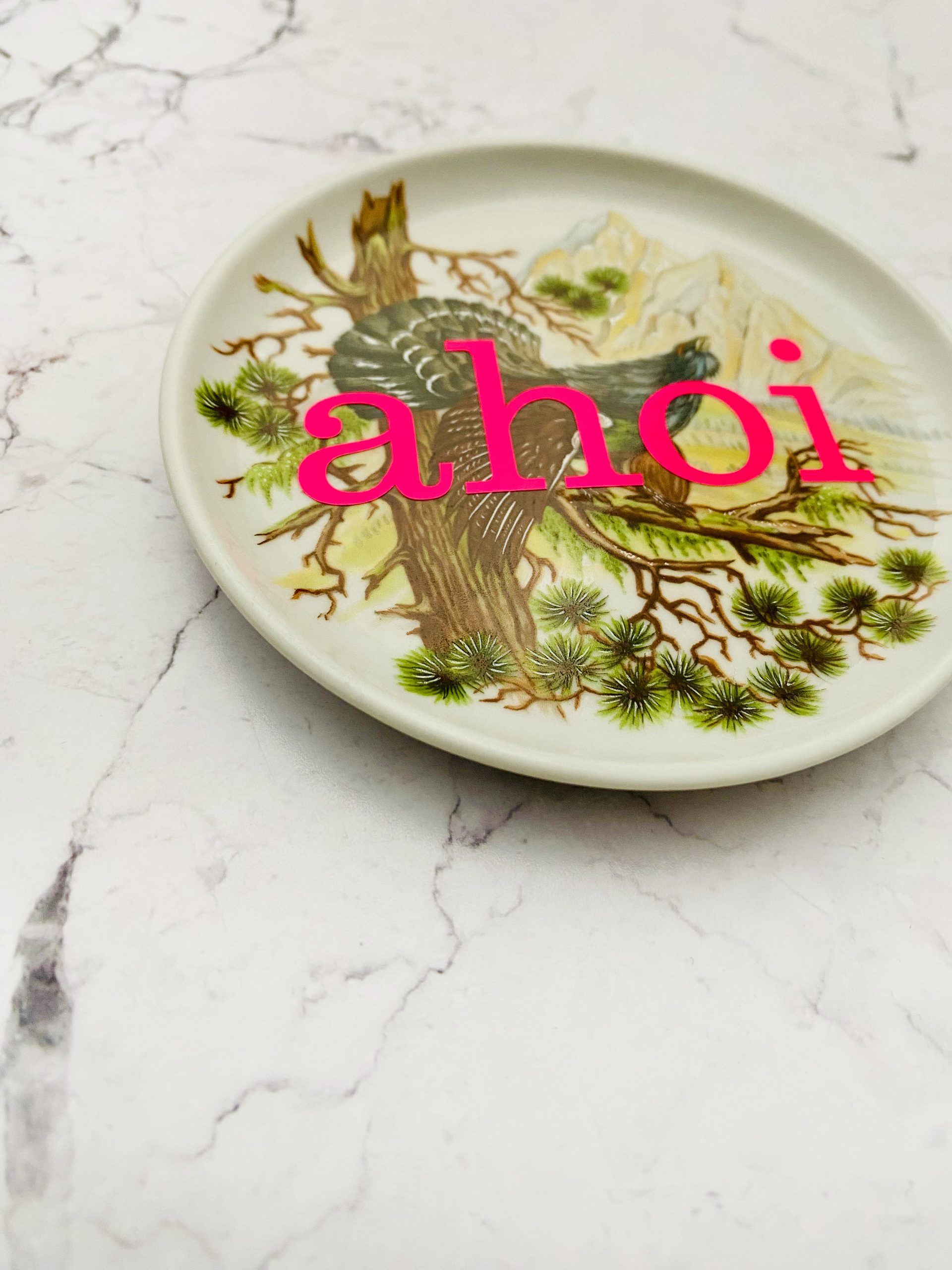 Jeder Wandteller wird handgefertigt und jeder der vintage Teller ist immer wieder ein Einzelstück. Dieser besondere Wandteller hat ein schönes Vögel/Auerhahn Decor und mit unserer moin. Typo in neonpink ( super knallig, deutlich mehr als wir auf den Fotos abbilden können :)kann er für alle Dekozwecke genutz werden.