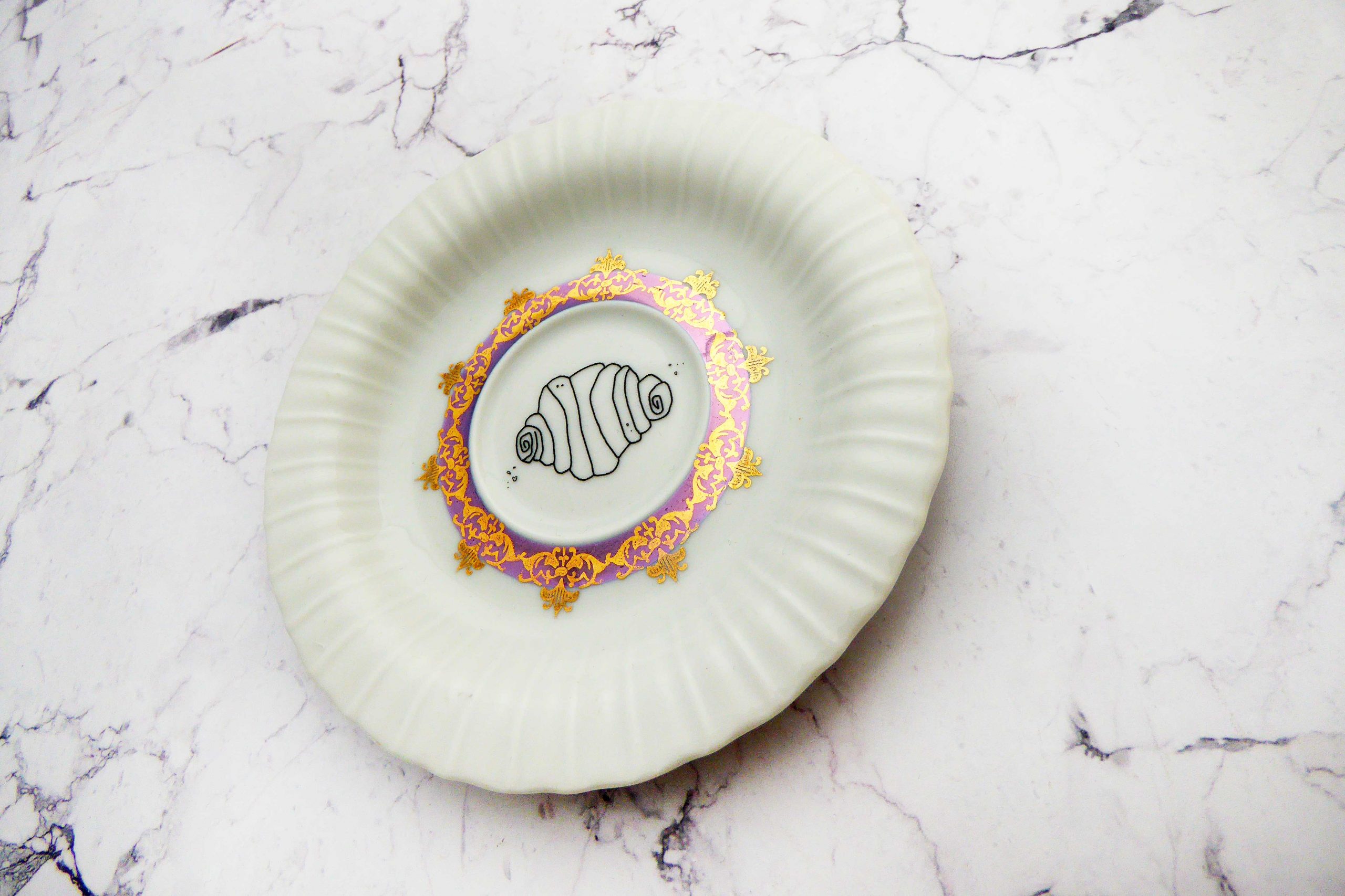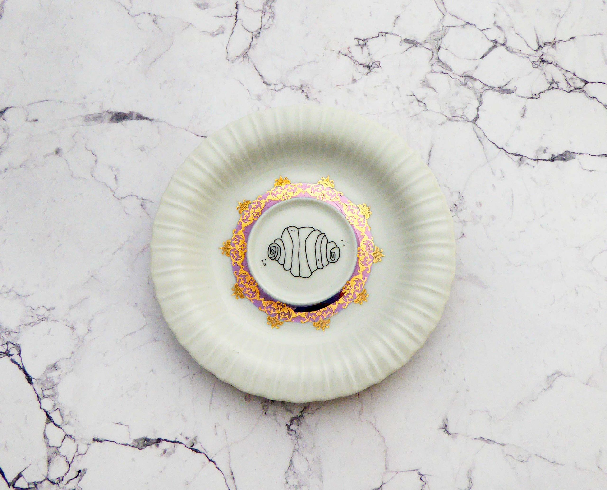 Jeder Wandteller wird handgefertigt und jeder der vintage Teller ist immer wieder ein Einzelstück. Dieser besondere Wandteller hat ein lila/gold Decor und mit unserem Franzbrötchen kann er für alle Dekozwecke genutz werden.