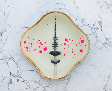 Jeder Wandeller wird handgefertigt. Dieser eckige Wandteller hat ein besonders schönes Kleckse Muster in Neonpink mit unserem Hamburger Fernsehturm kann er für alle Dekozwecke genutz werden.