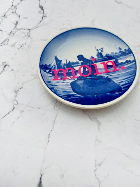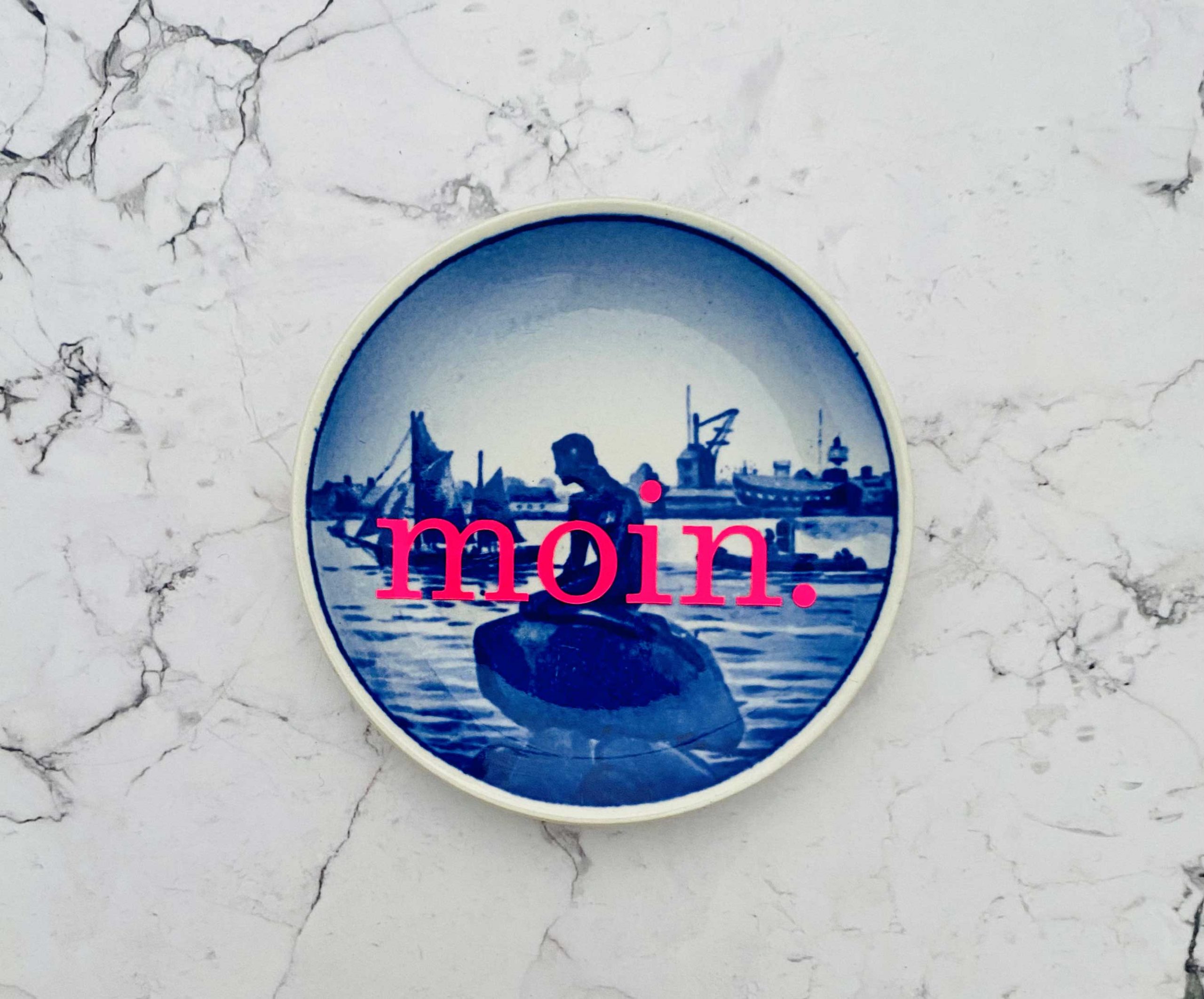 Jeder Wandteller wird handgefertigt. Dieser Wandteller hat ein besonderes Decor mit Kopenhagen Meerjungfrau und mit unsere moin. Typo in neonpink ( super knallig, deutlich mehr als wir auf den Fotos abbilden können :)kann er für alle Dekozwecke genutz werden.