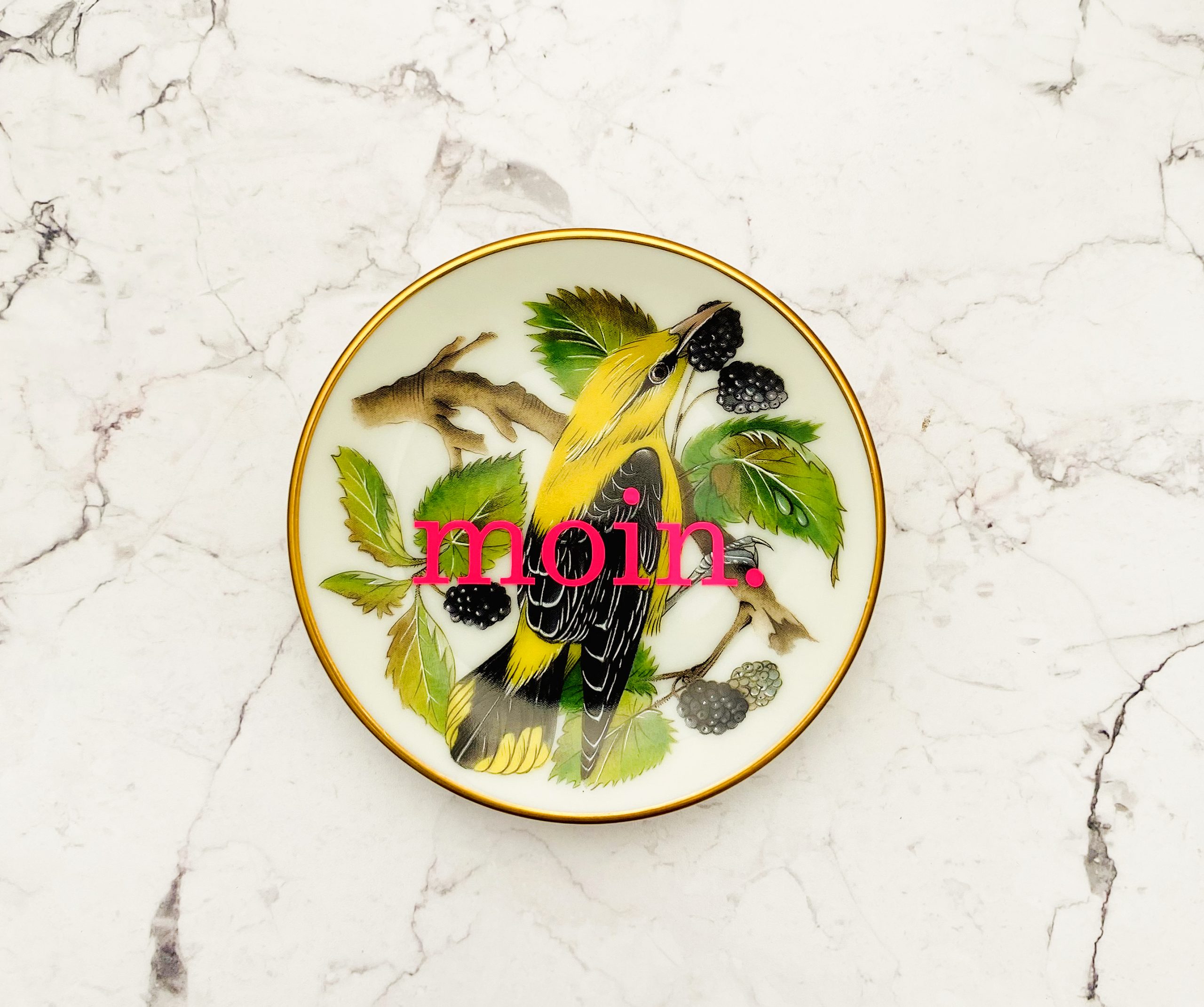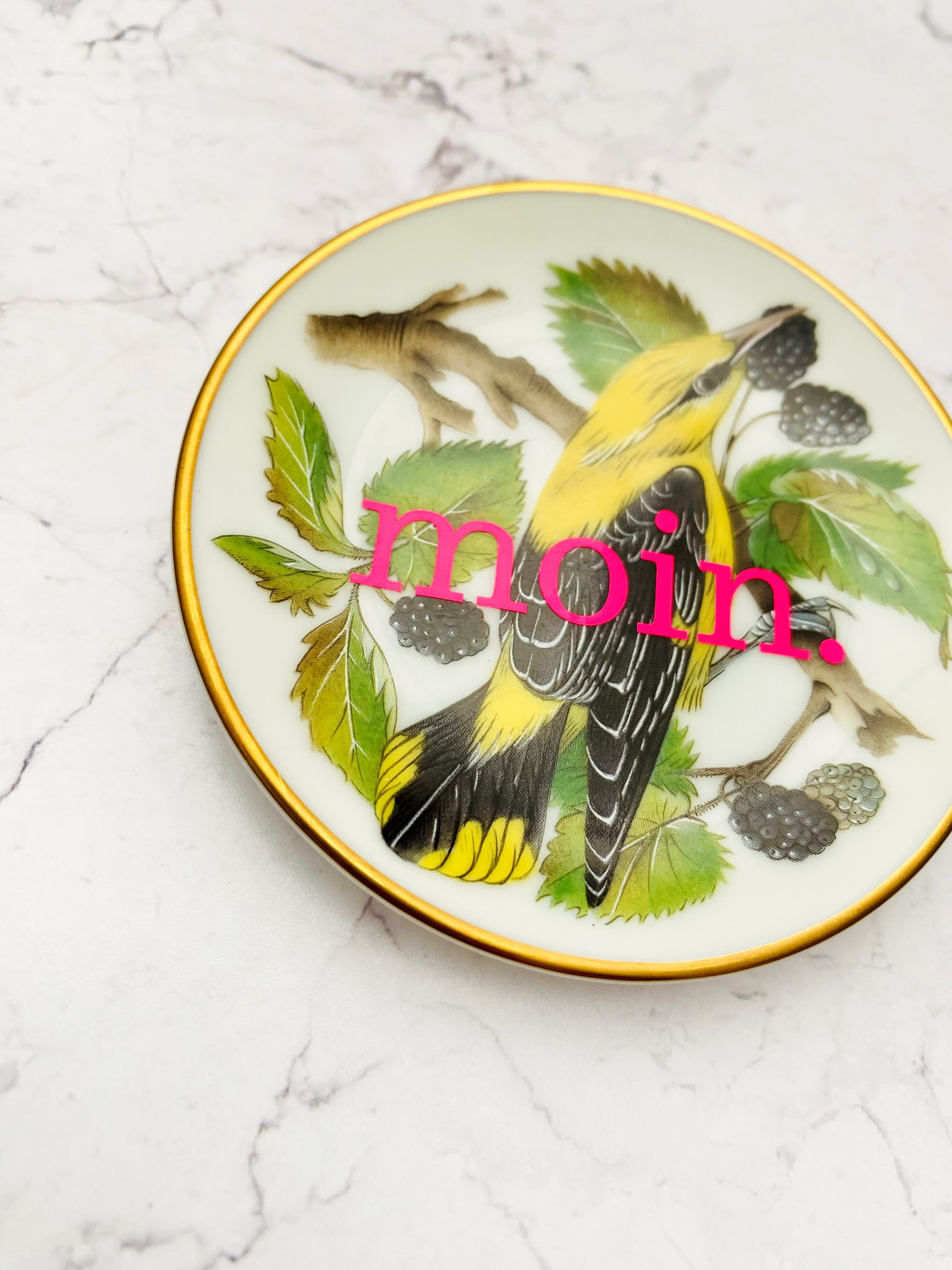 Jeder Wandteller wird handgefertigt und jeder der vintage Teller ist immer wieder ein Einzelstück. Dieser besondere Wandteller hat ein schönes Vögel Decor und mit unserer moin. Typo in neonpink ( super knallig, deutlich mehr als wir auf den Fotos abbilden können :)kann er für alle Dekozwecke genutz werden.