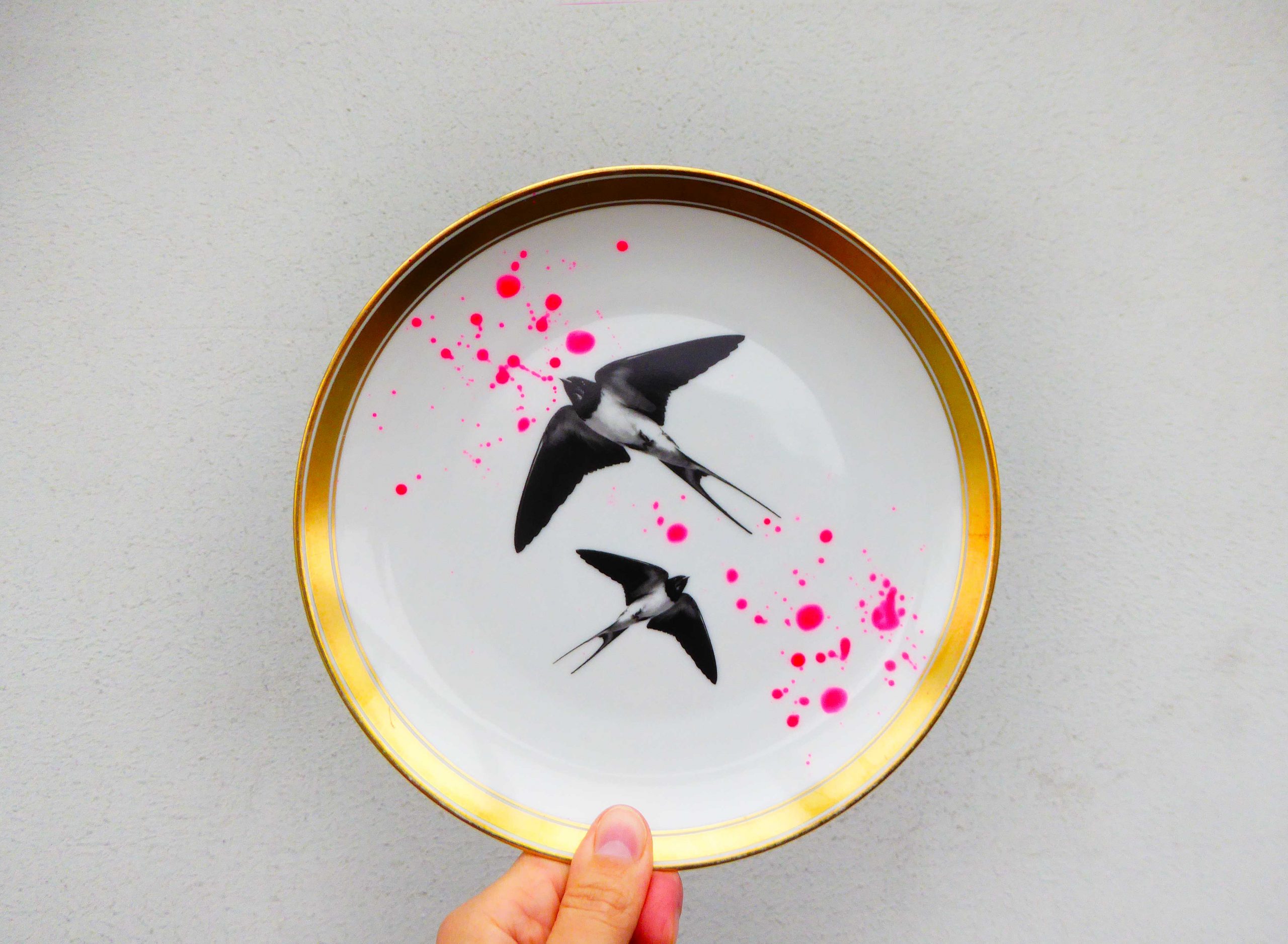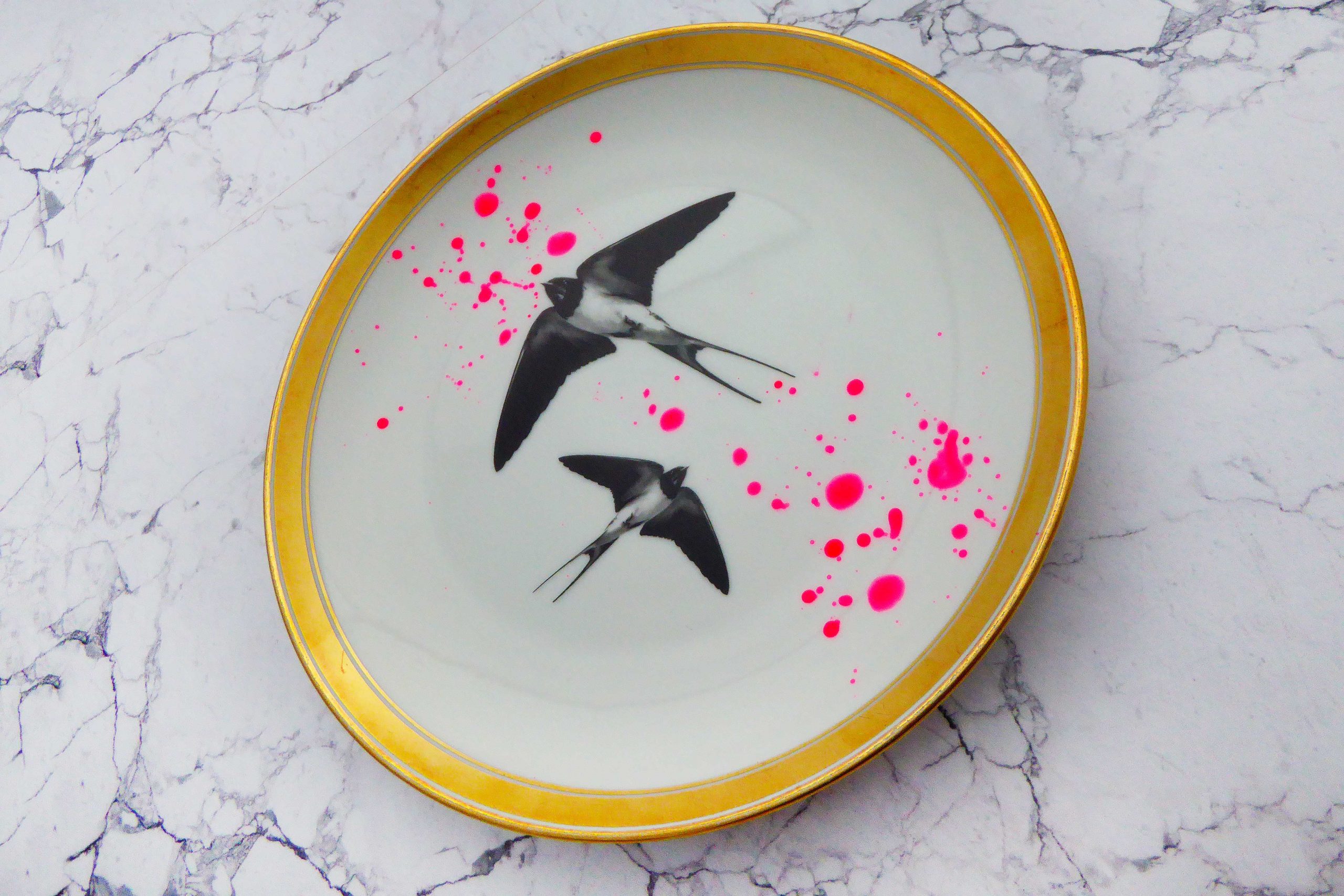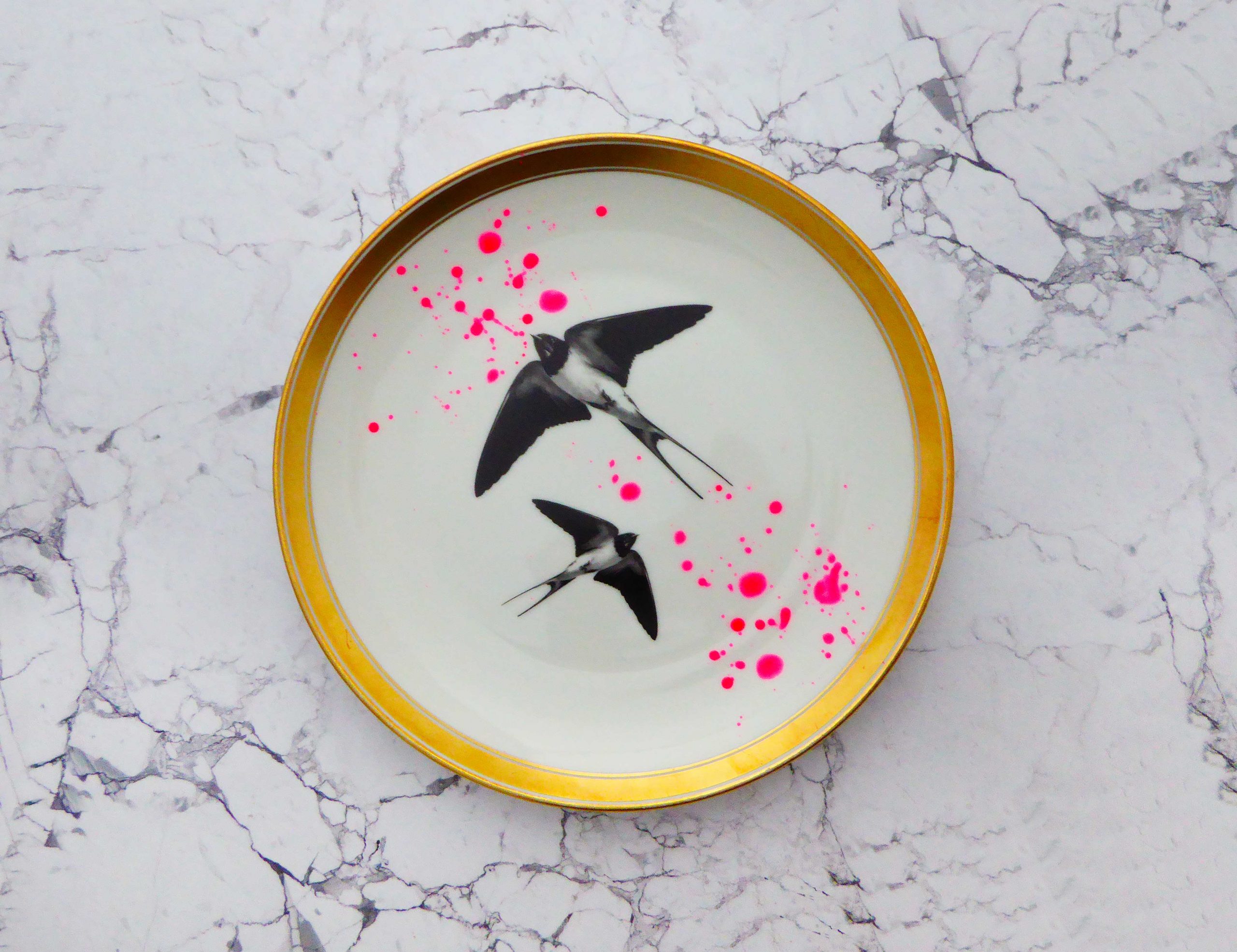 Wandteller Herr Fuchs Schwalbe gold 19cm neonpink Kleckse vintage