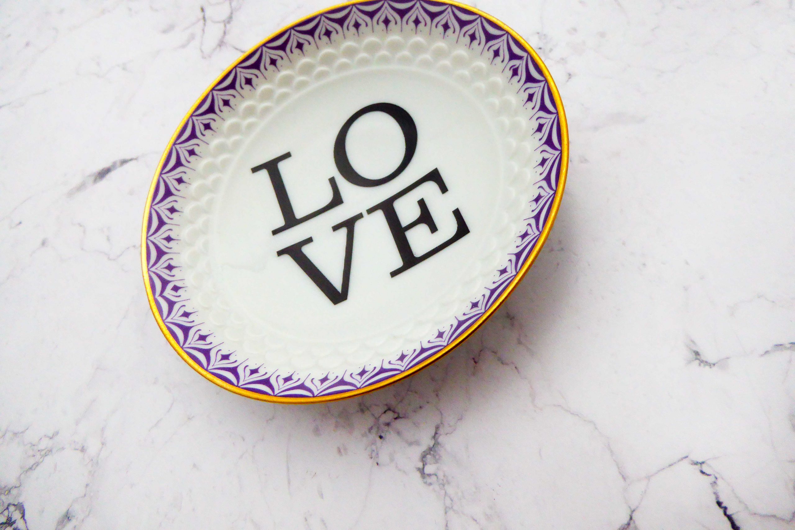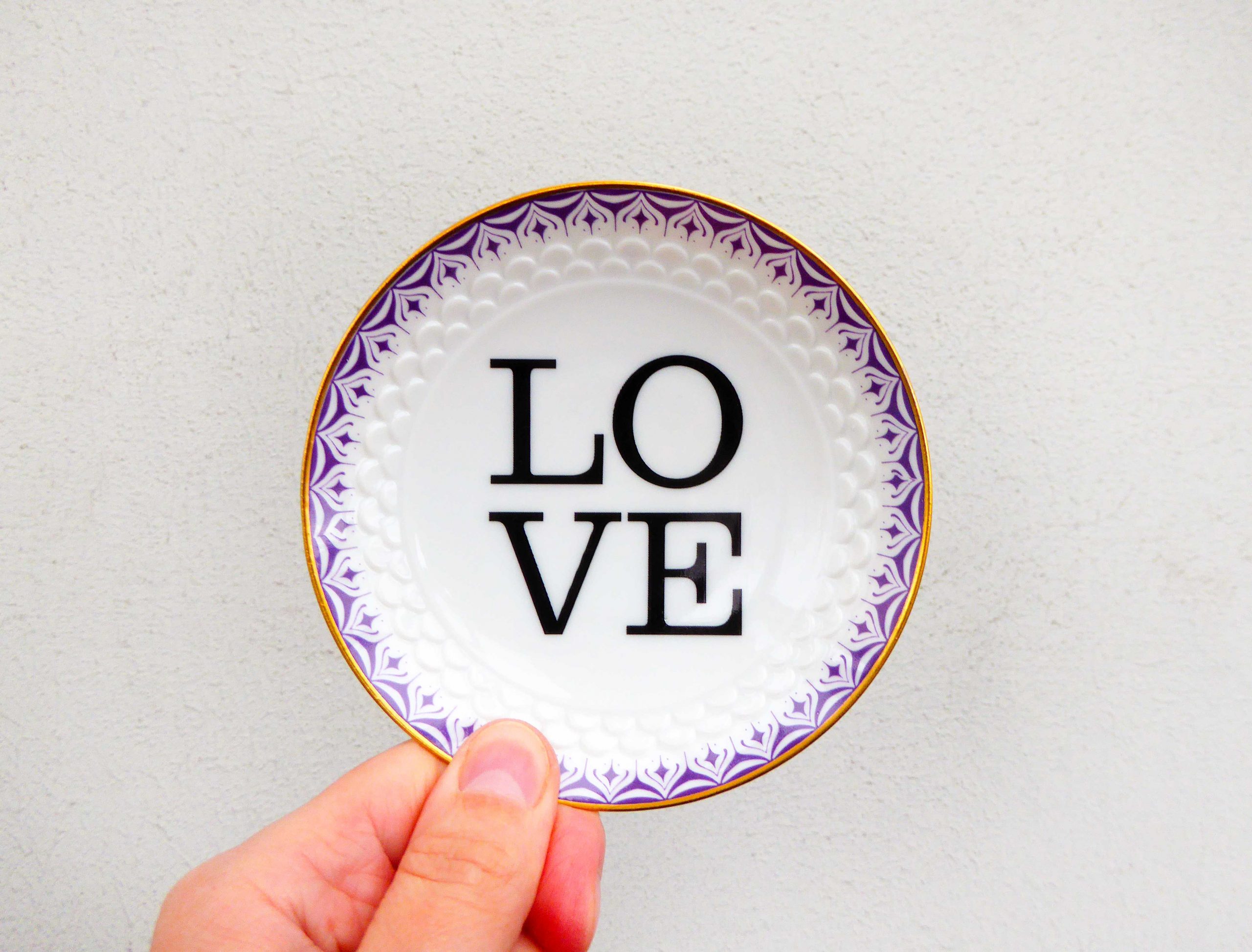 Jeder Wandteller wird handgefertigt und jeder der vintage Teller ist immer wieder ein Einzelstück. Dieser besondere Wandteller hat ein schönen Lila/Goldrand mit Muster und mit unserer Typo Love kann er für alle Dekozwecke genutz werden.