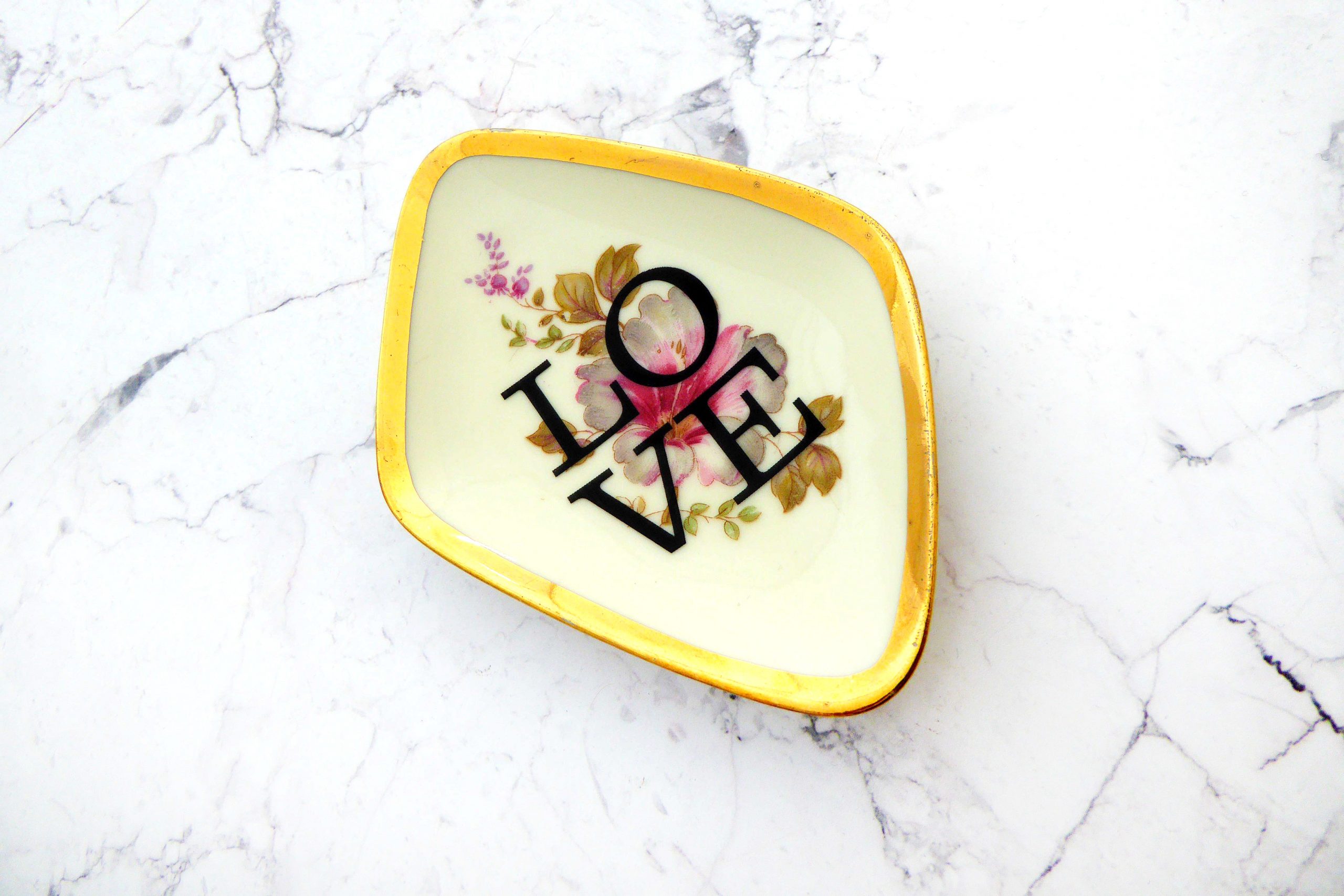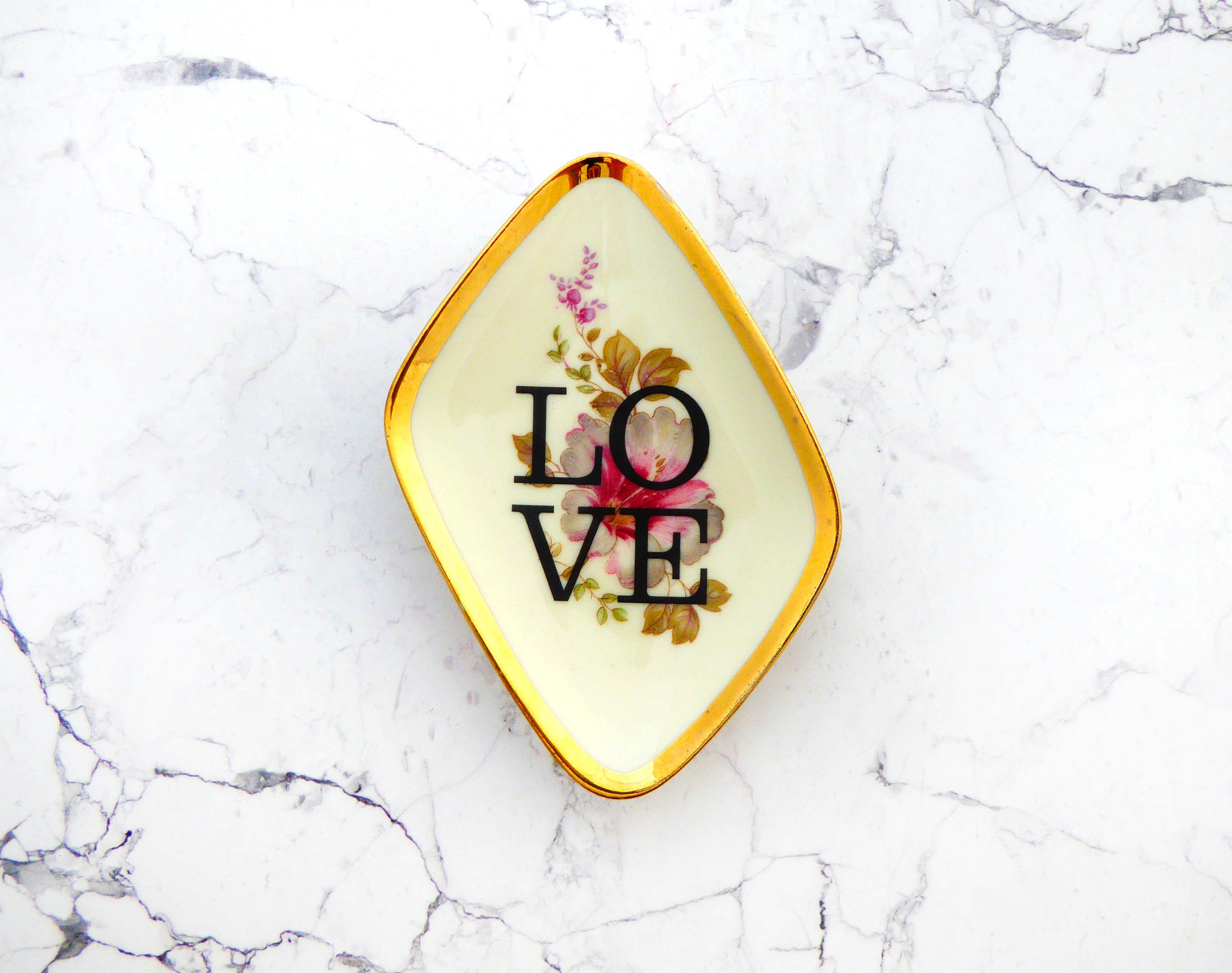 Jeder Wandteller wird handgefertigt und jeder der vintage Teller ist immer wieder ein Einzelstück. Dieser besondere eckige Wandteller hat ein schönen Goldrand, ein Blumenmuster in rosa mit unserer Typo Love kann er für alle Dekozwecke genutz werden.