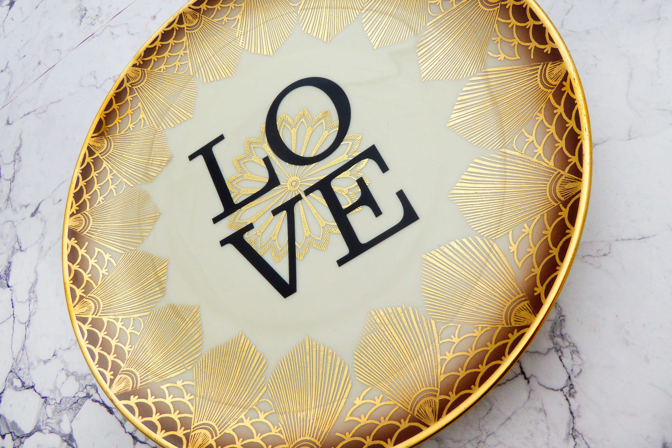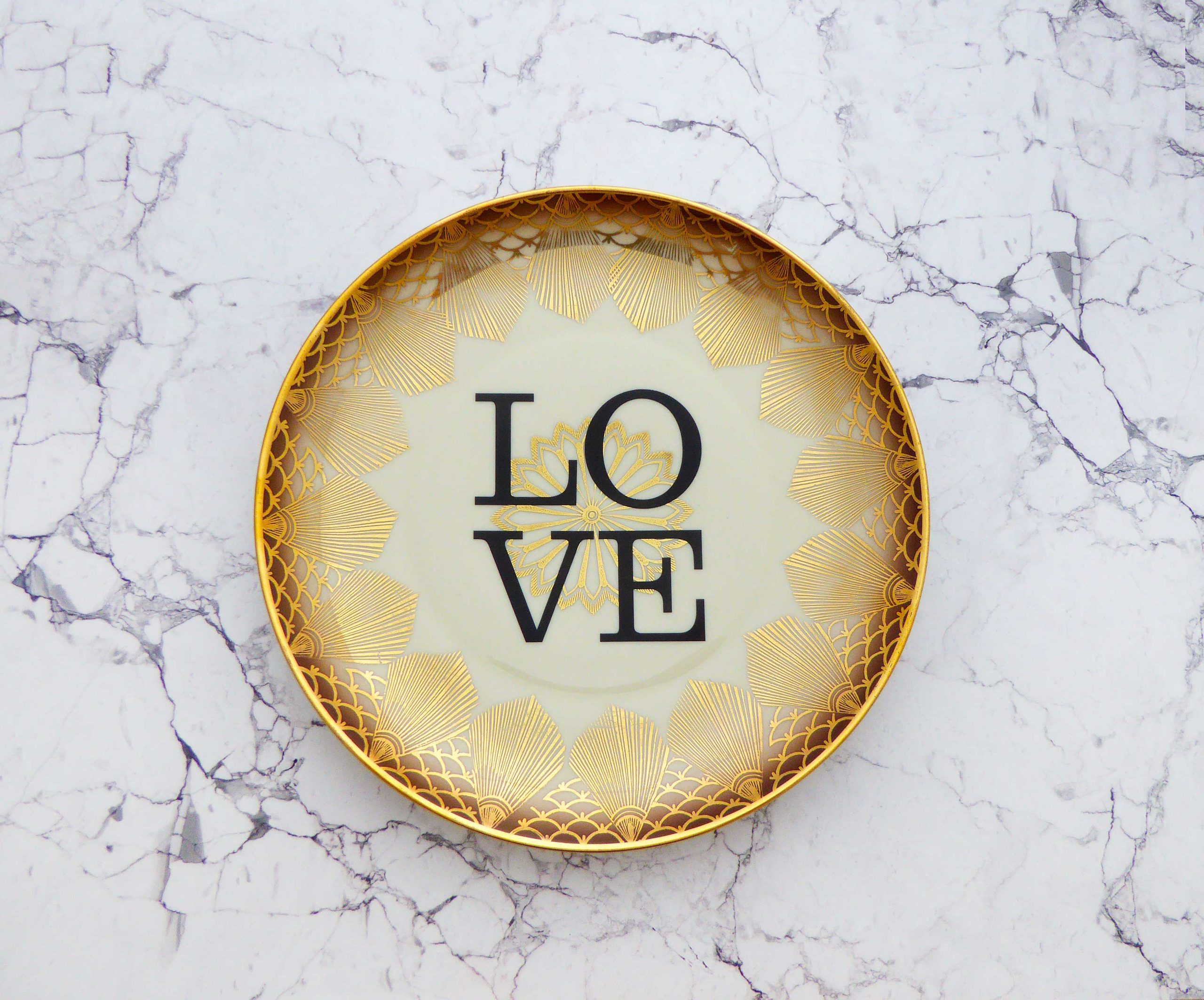 Jeder Wandteller wird handgefertigt und jeder der vintage Teller ist immer wieder ein Einzelstück. Dieser besondere Wandteller hat ein Muster in gold und mit unserer Typo Love kann er für alle Dekozwecke genutz werden.