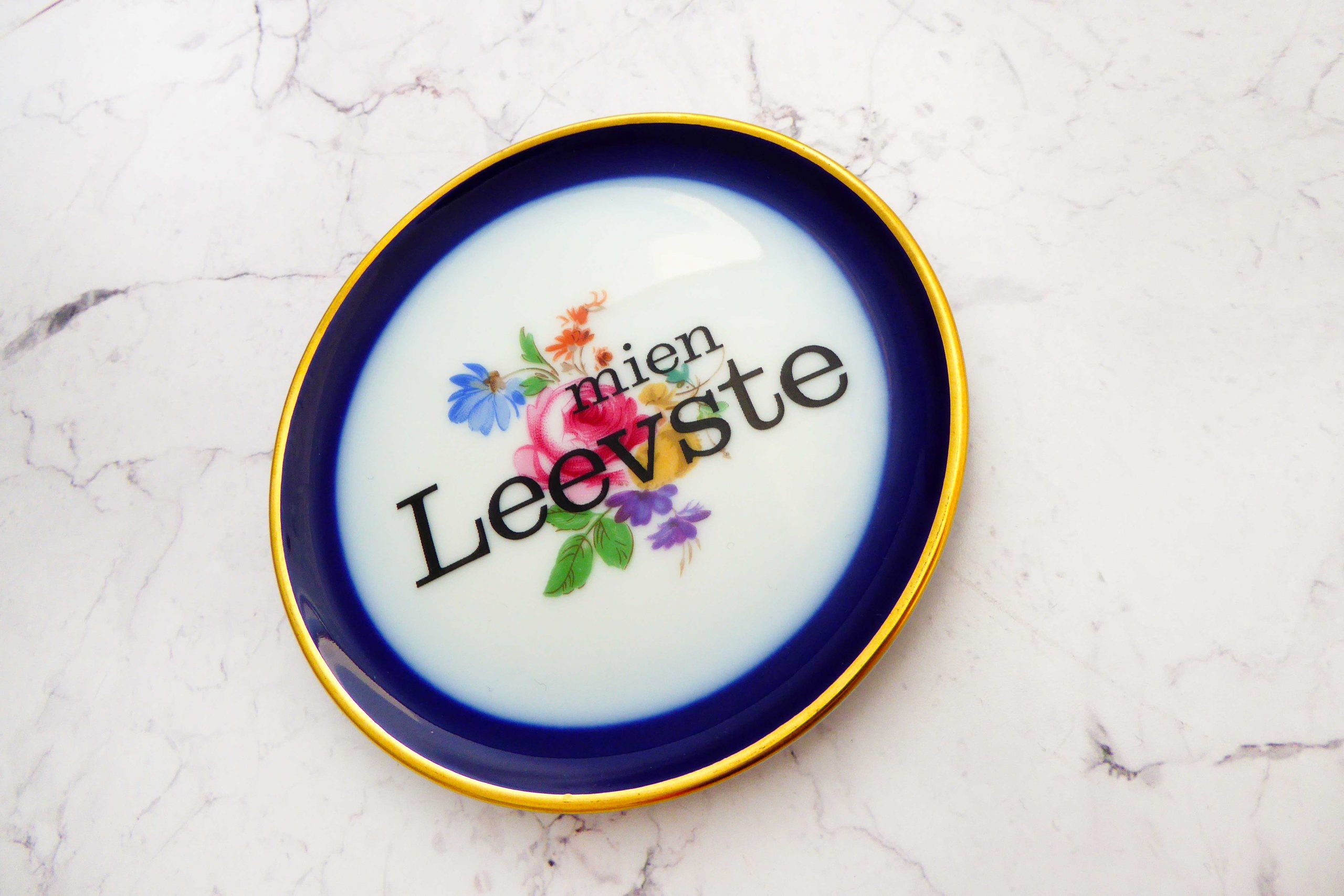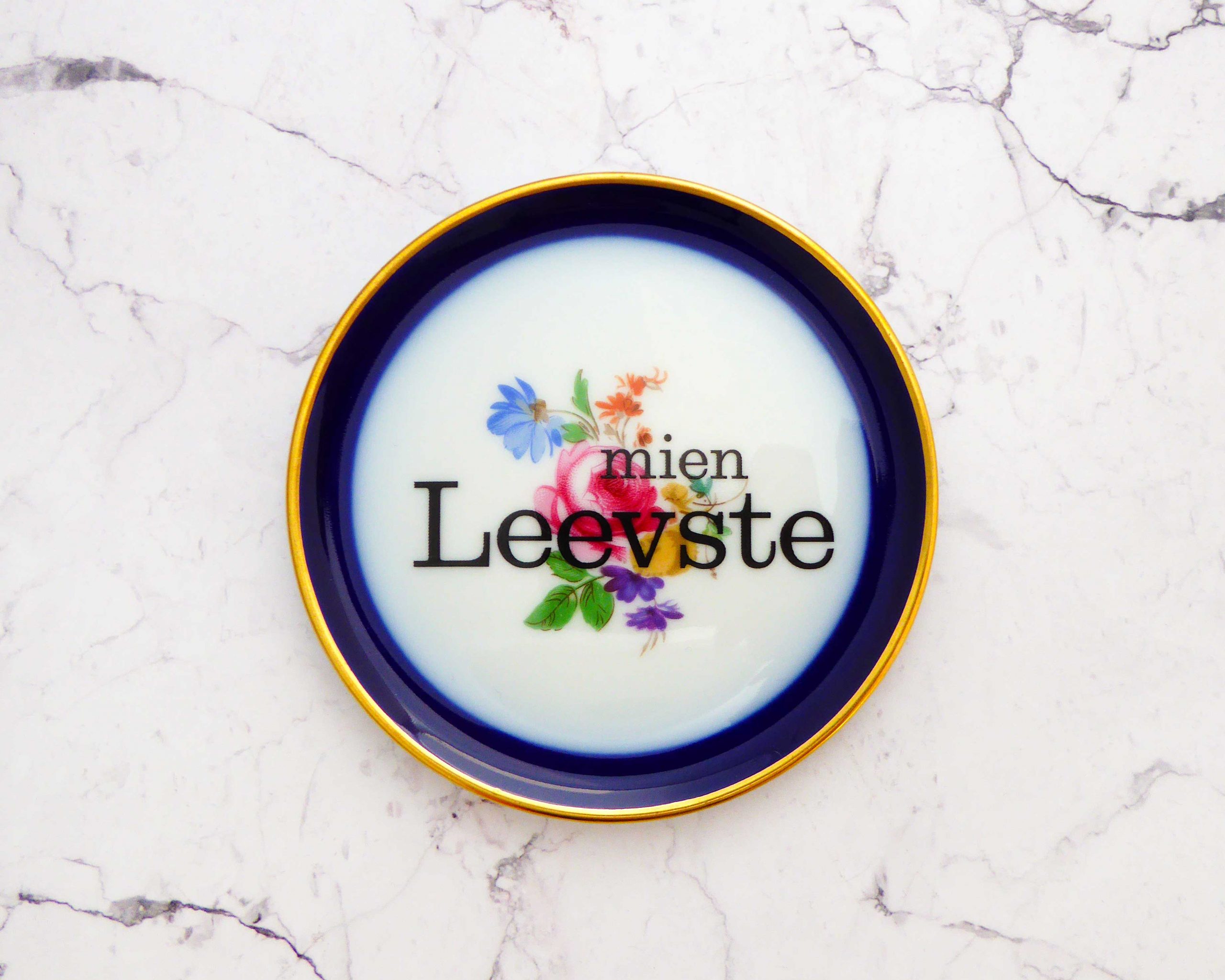 Jeder Wandteller wird handgefertigt. Dieser kleine Wandteller hat eine besonderes Blumen Decor und er hat ein schönen Blau/Gold Rand mit unserer Typo mien Leevste kann er für alle Dekozwecke genutz werden.