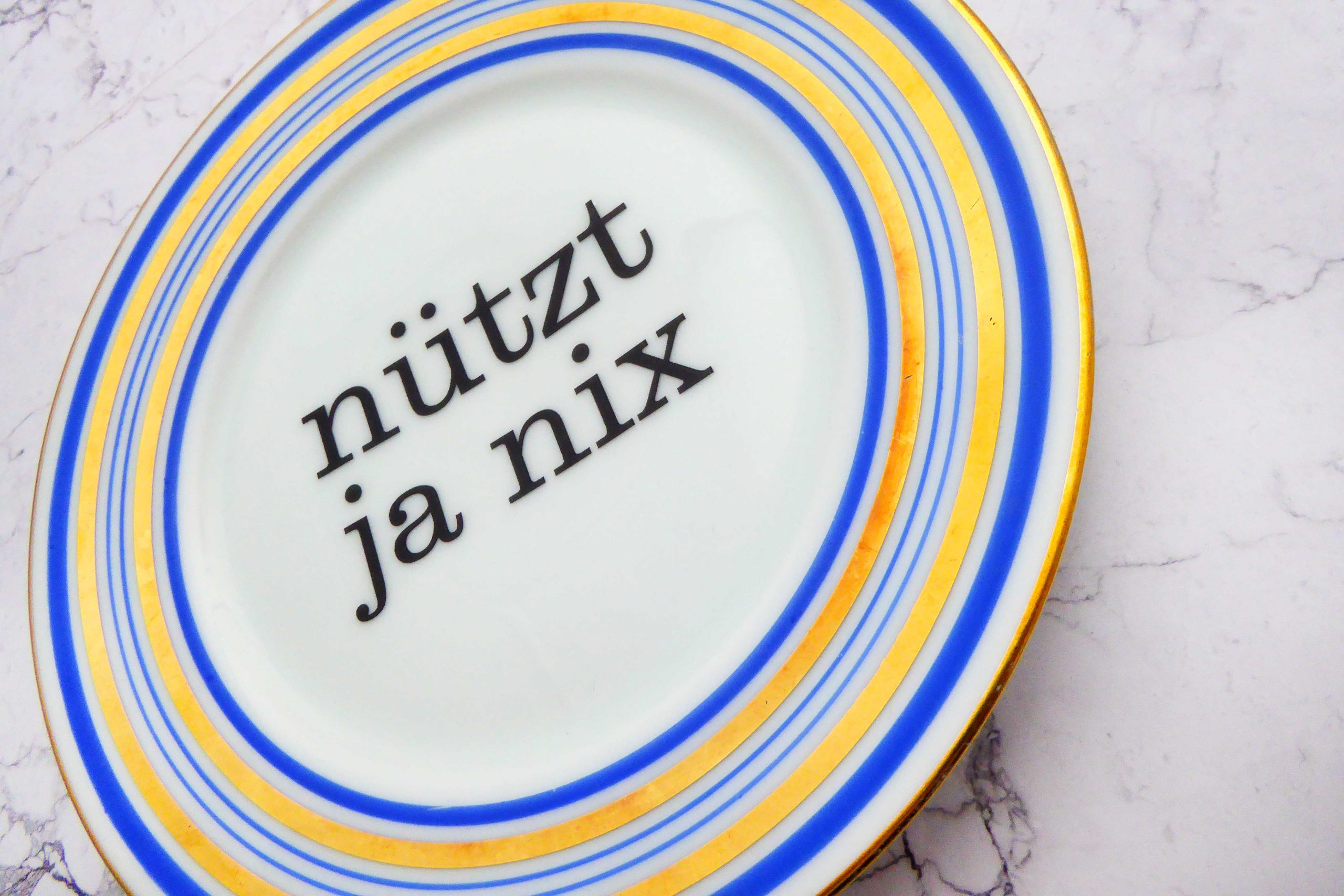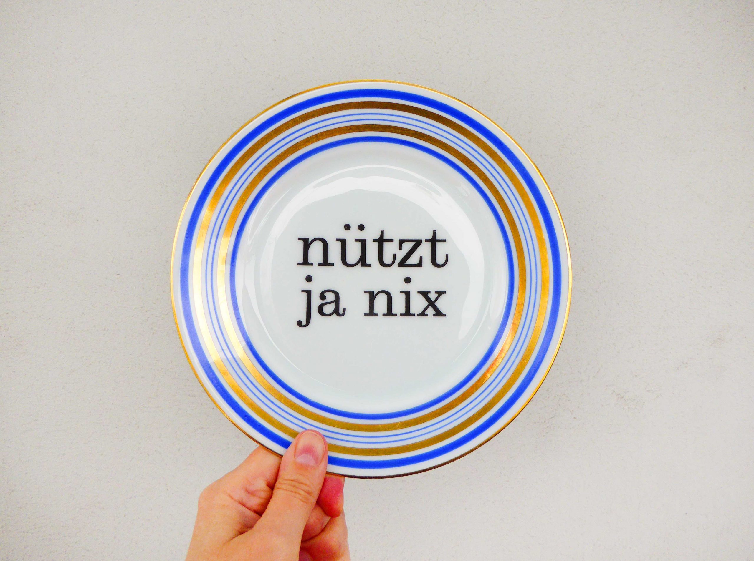Jeder Wandteller wird handgefertigt und jeder der vintage Teller ist immer wieder ein Einzelstück. Dieser schöne Wandteller hat ein schönes Ringemuster in blau/gold und mit unserer Typo Nützt ja nix kann er für alle Dekozwecke genutz werden.