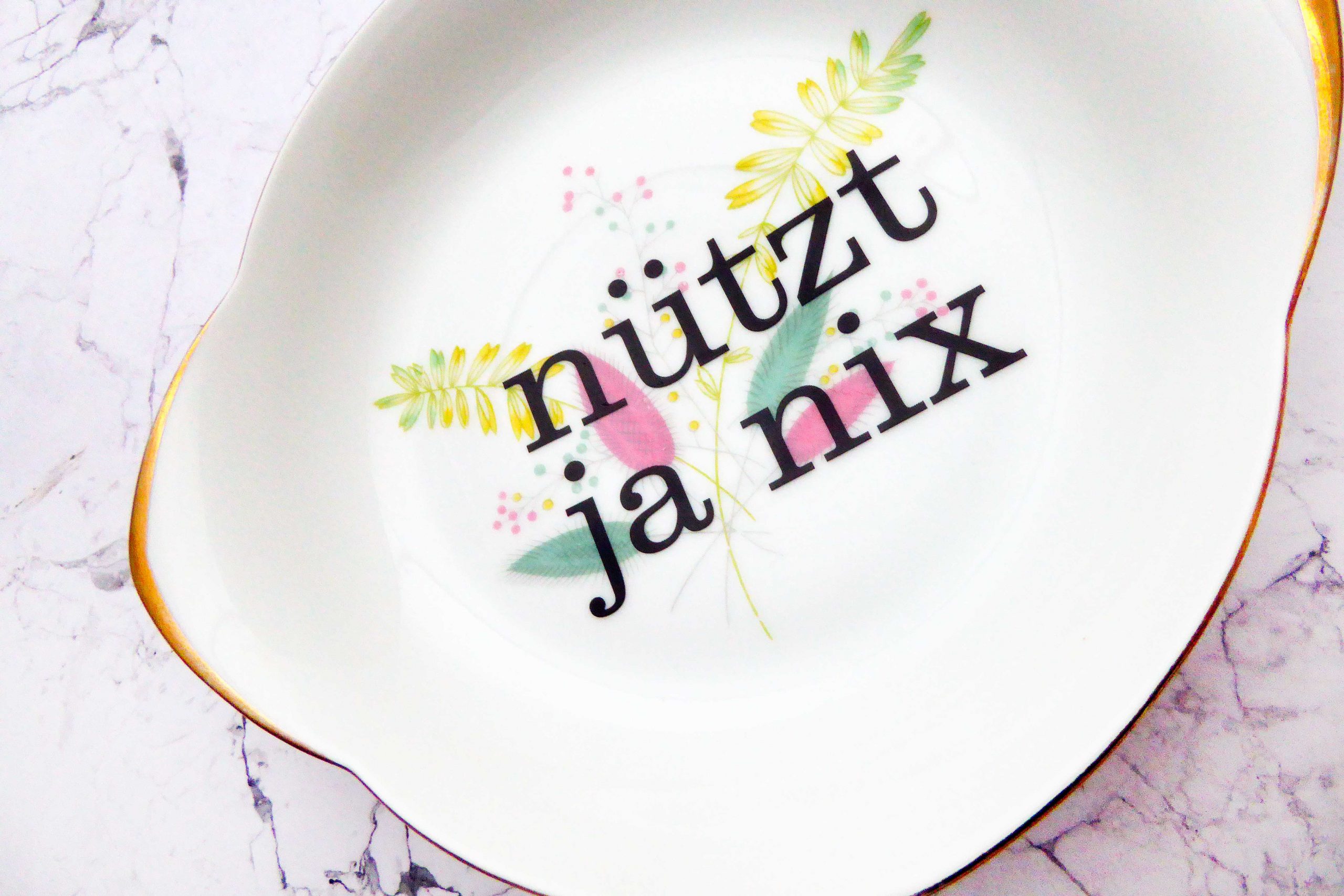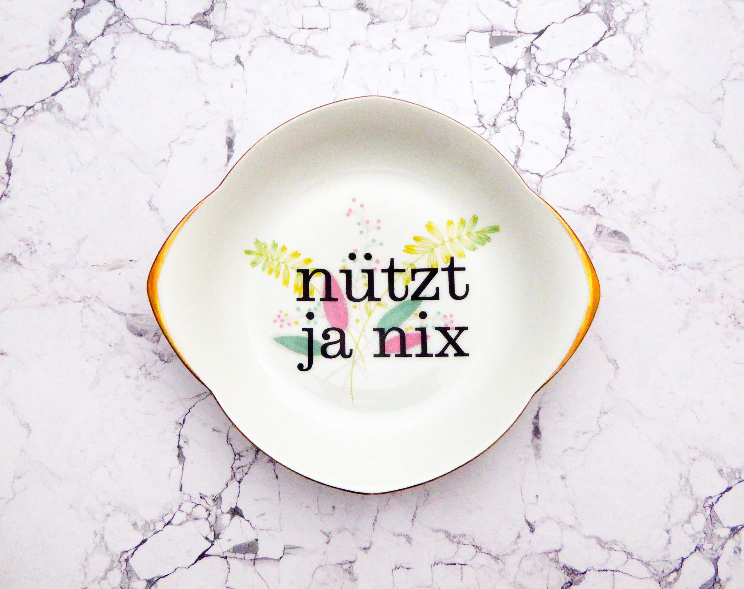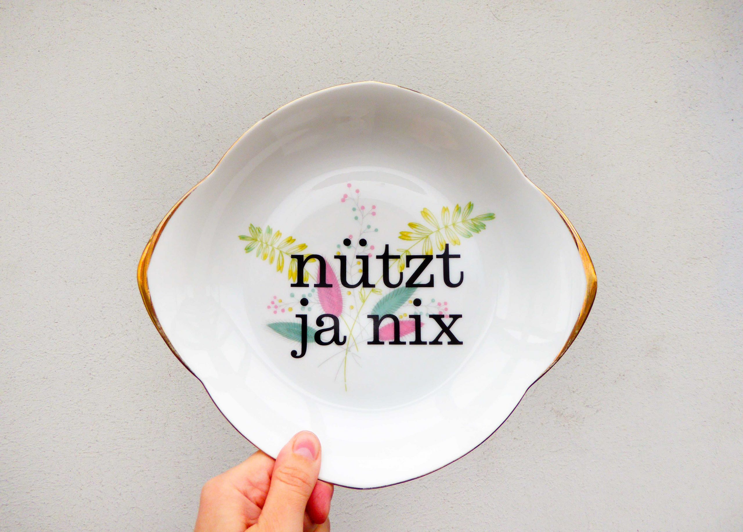 Unser Vintage Wandteller mit unserem Typo Nützt ja nix ist ein besonderes Stück für Dein Zuhause.