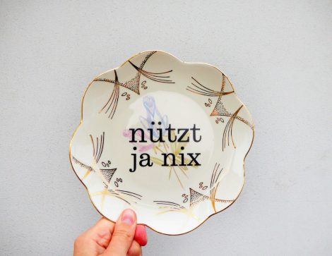 Unser Vintage Wandteller mit unserem Typo Nützt ja nix ist ein besonderes Stück für Dein Zuhause.