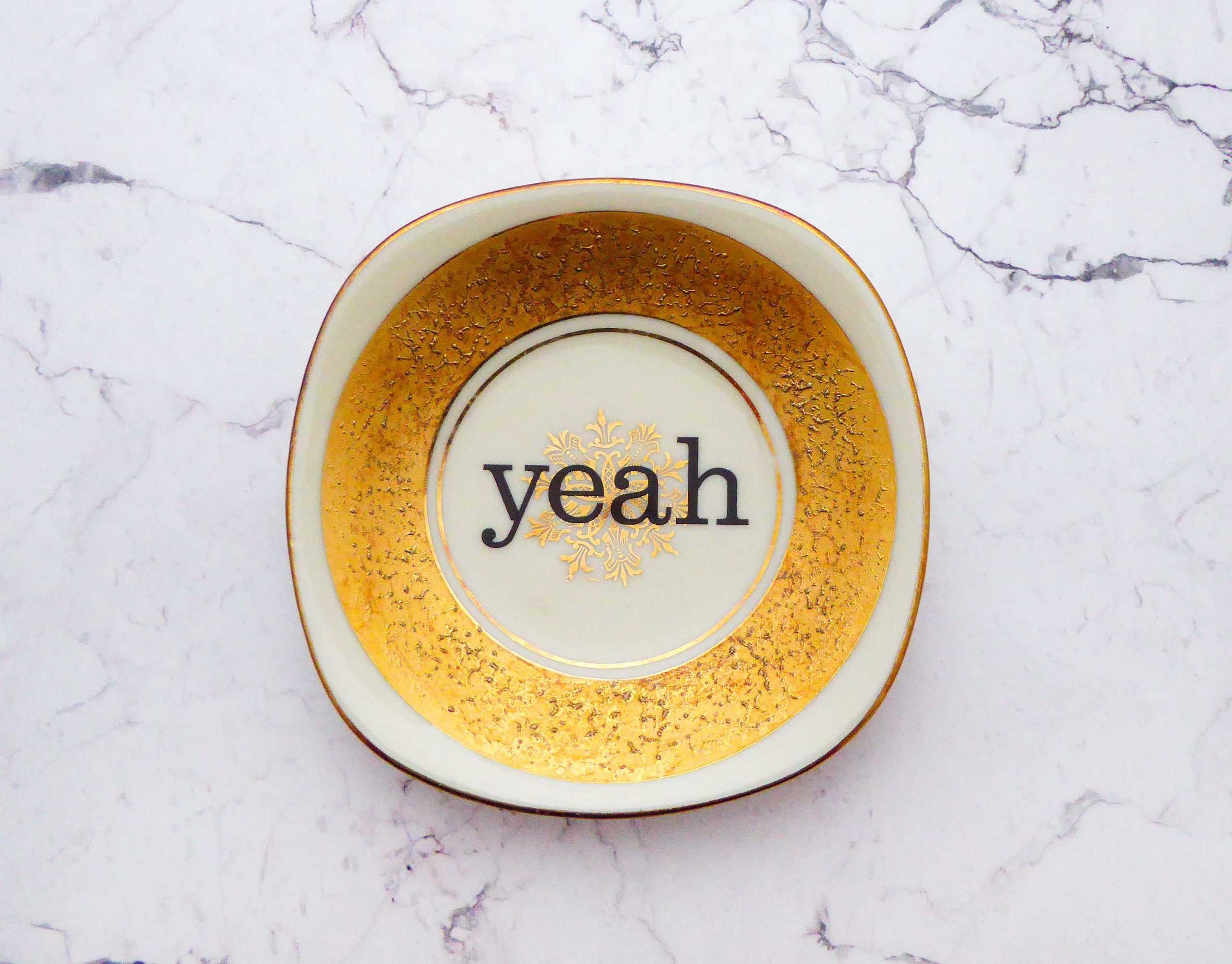Jeder Wandteller wird handgefertigt und jeder der vintage Teller ist immer wieder ein Einzelstück. Dieser besondere Wandteller hat ein schönen breiten Goldrand mit unserer Typo yeah kann er für alle Dekozwecke genutz werden.