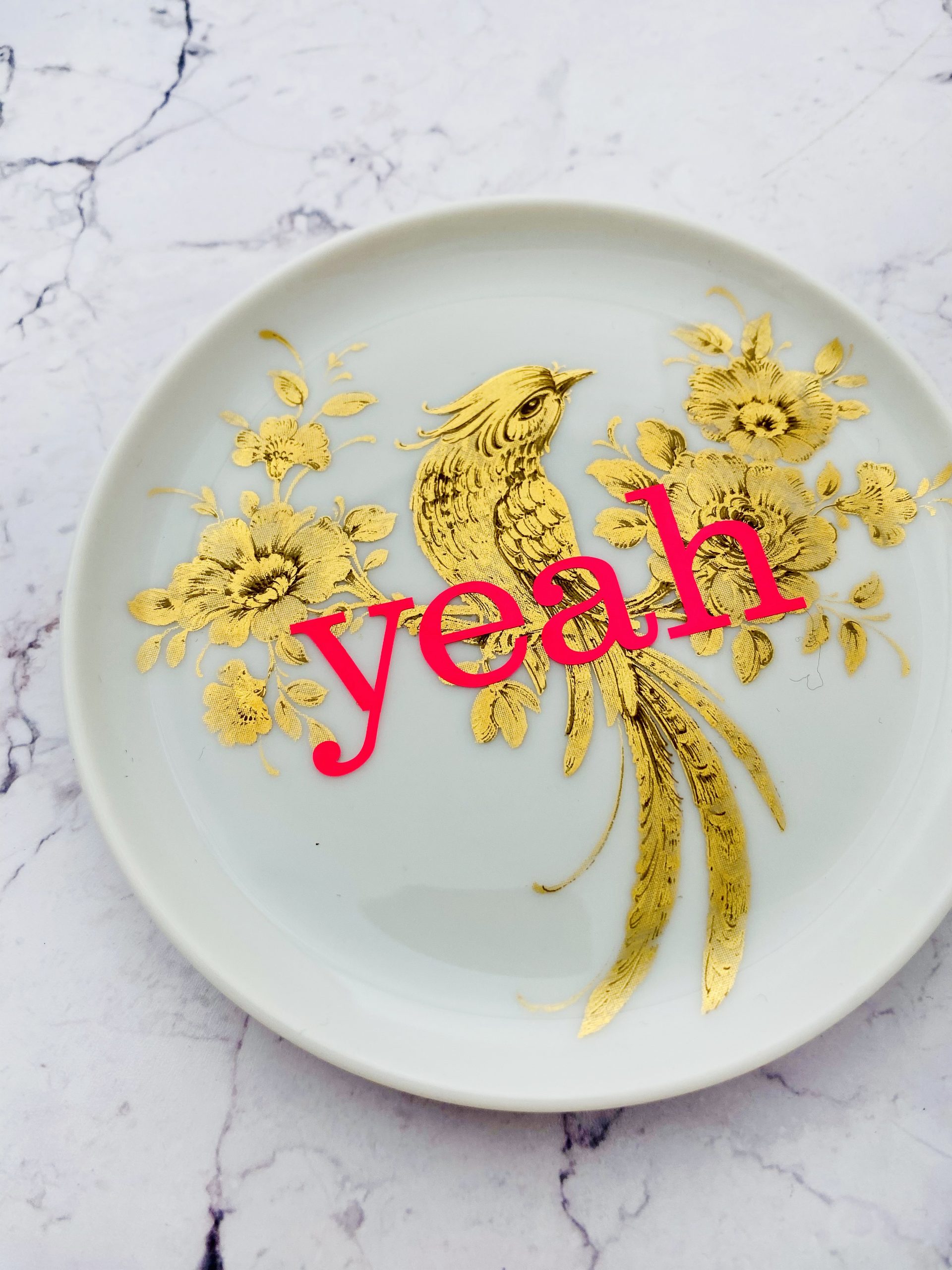 Jeder Wandteller wird handgefertigt. Dieser kleine Wandteller hat ein schönes Vogel Muster in Gold mit unserer yeah Typo in