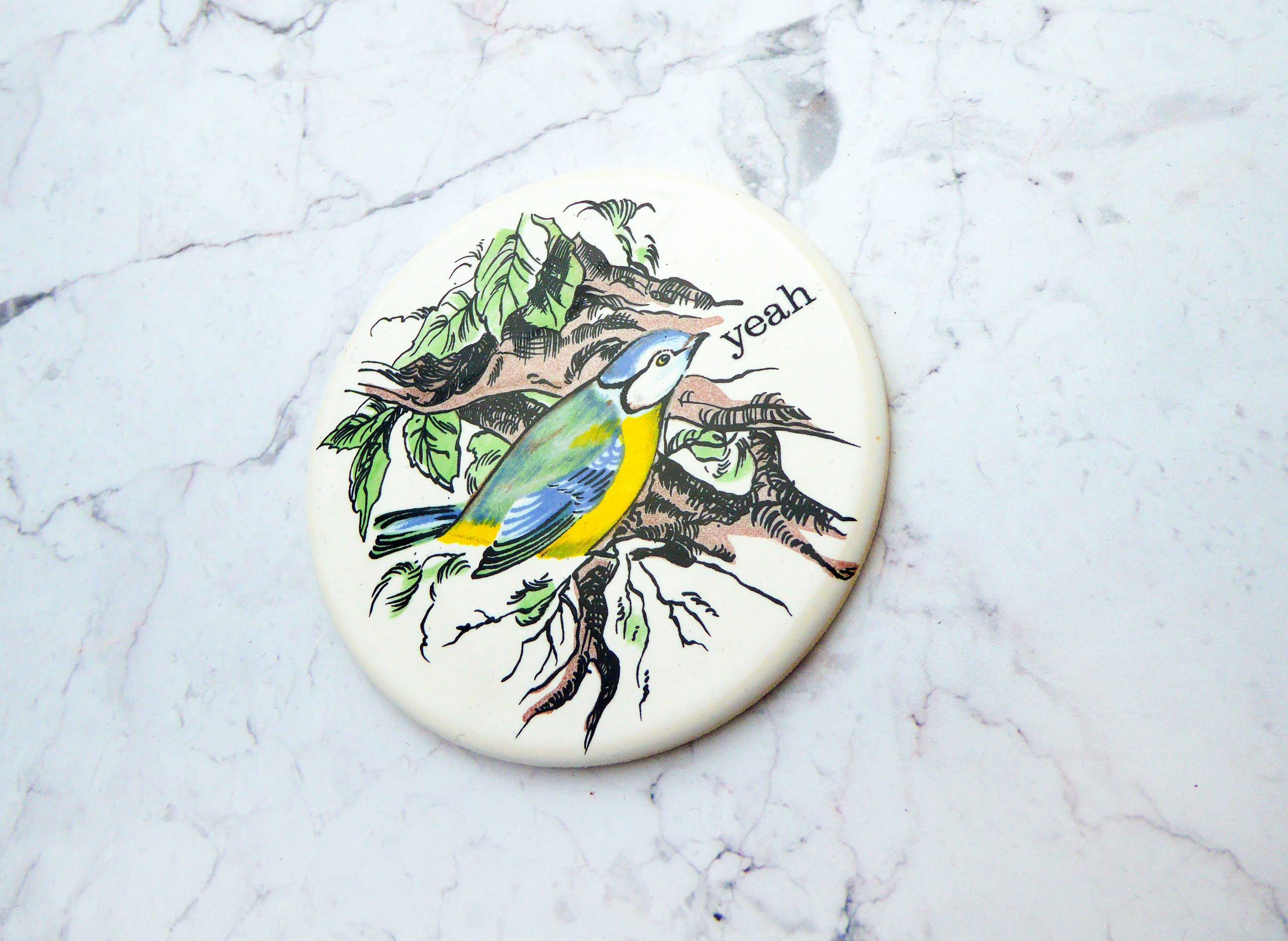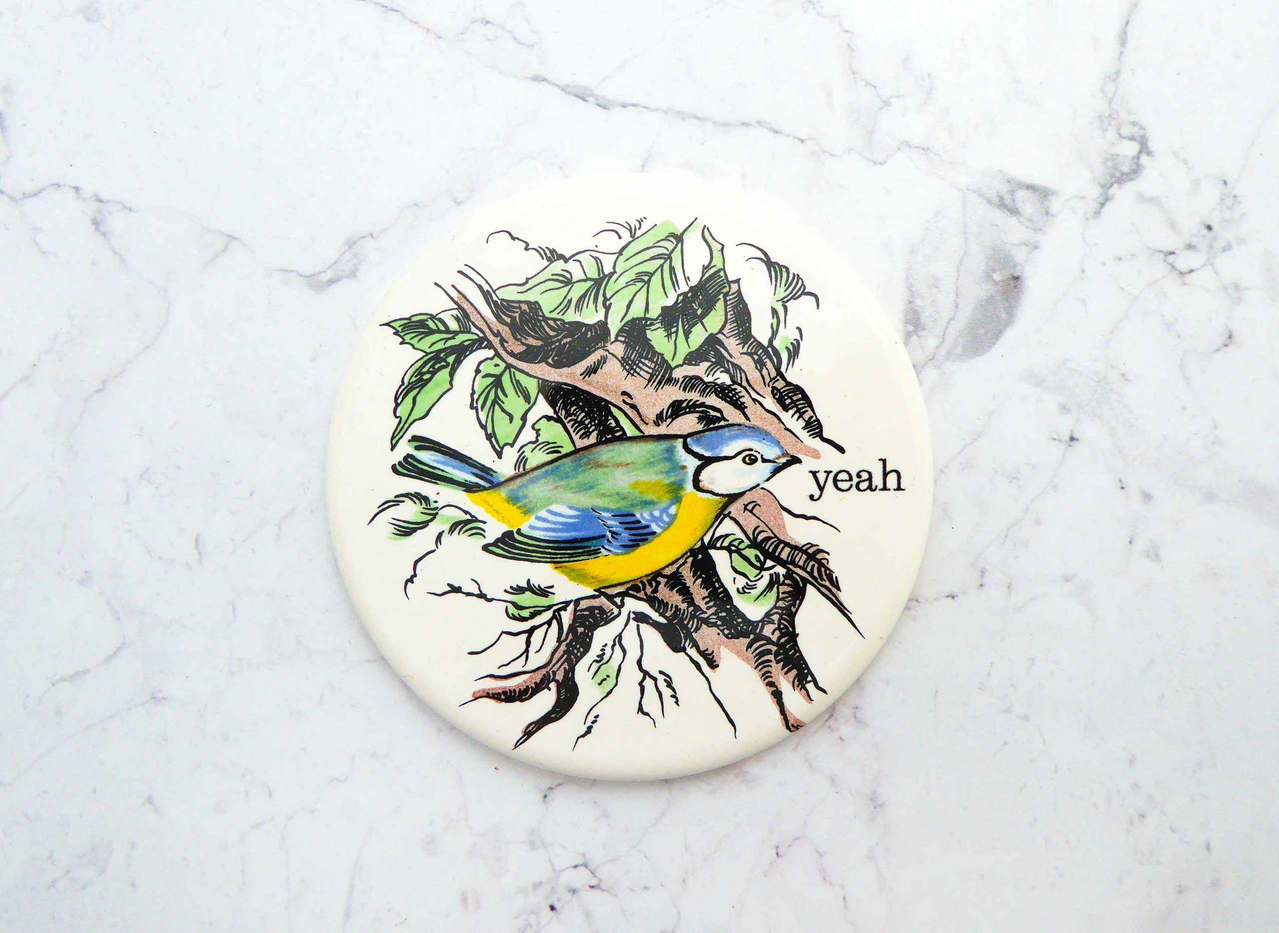 Jeder Wandteller wird handgefertigt. Dieser Wandteller mit einer kleinen Blaumeise und mit unserer Typo yeah kann er für alle Dekozwecke genutz werden.