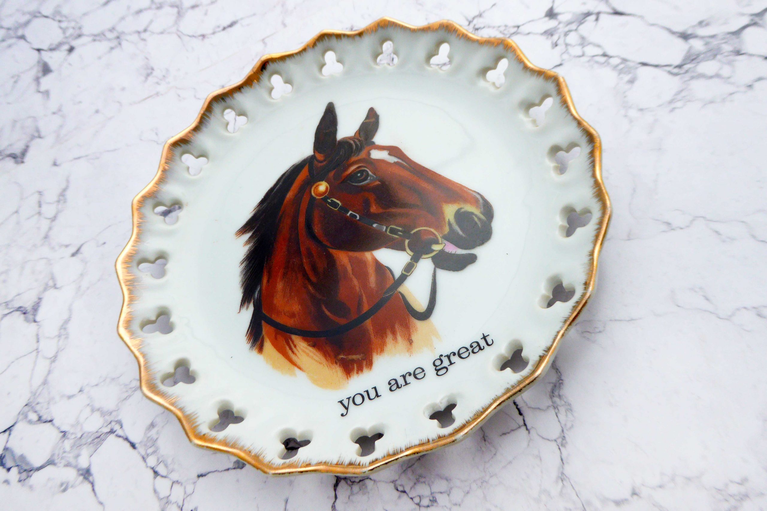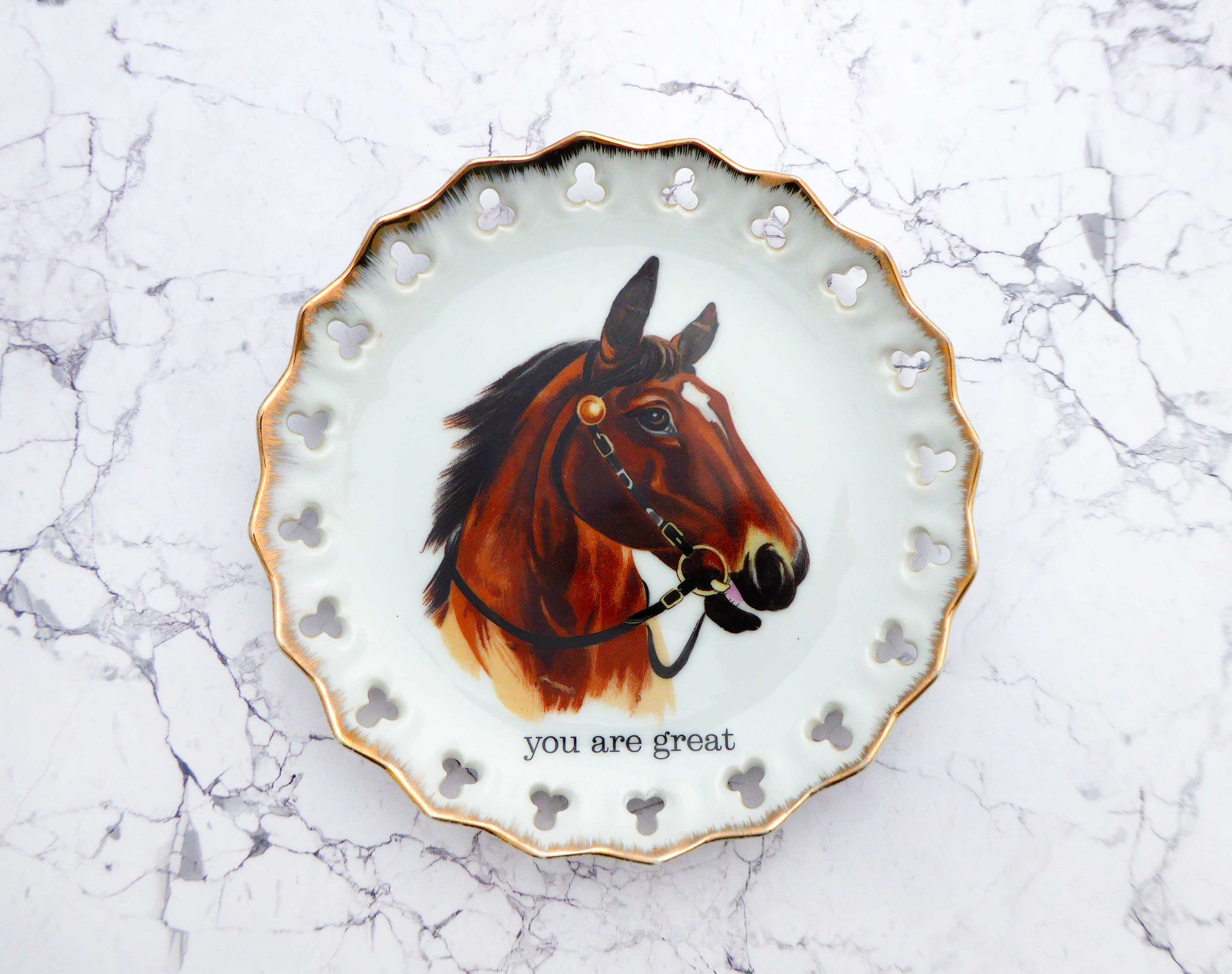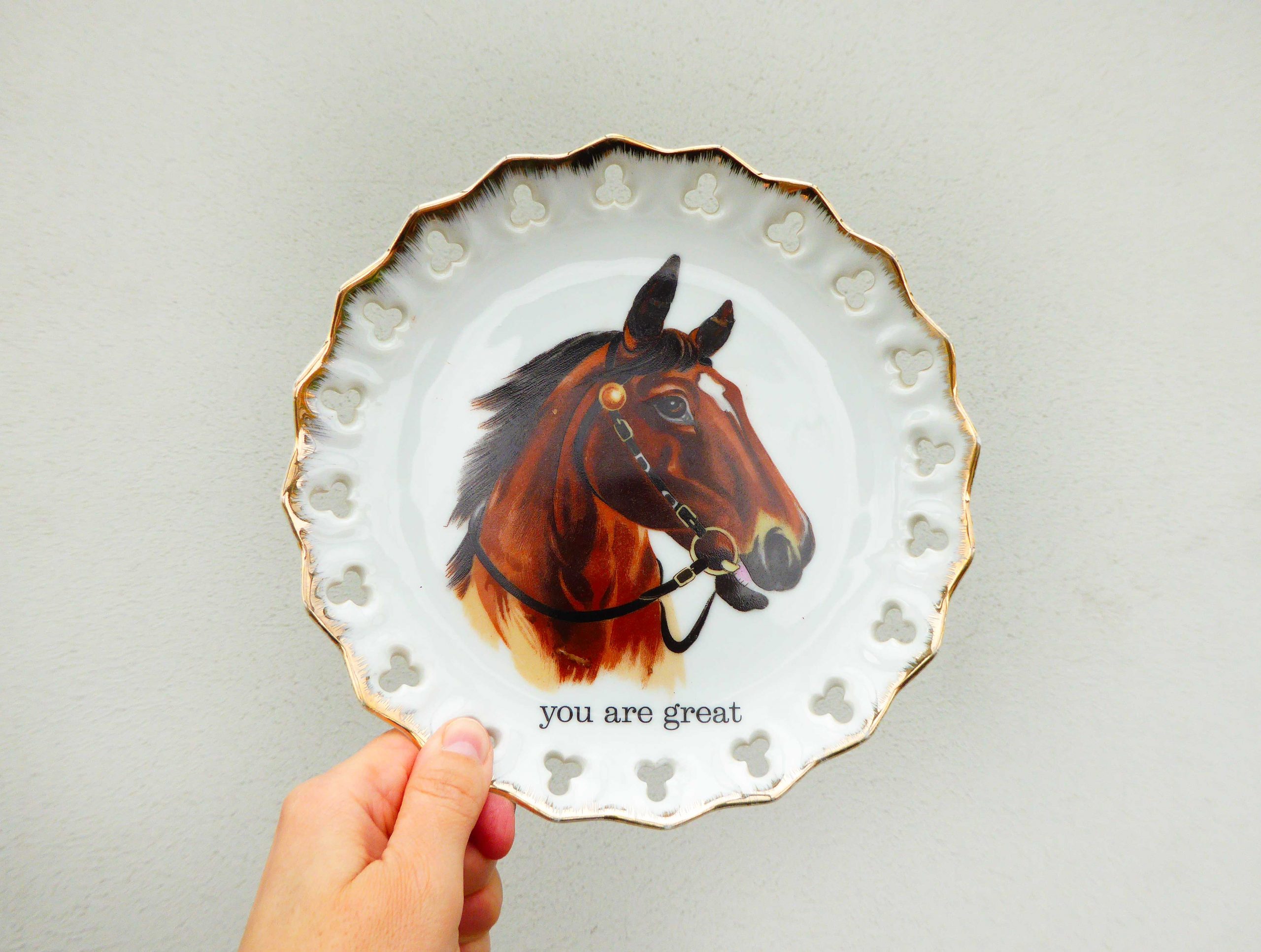 Jeder Wandteller wird handgefertigt. Dieser Wandteller hat ein Pferd Decor, einen Durchbruchrand und mit unserer Typo you are great kann er für alle Dekozwecke genutz werden.