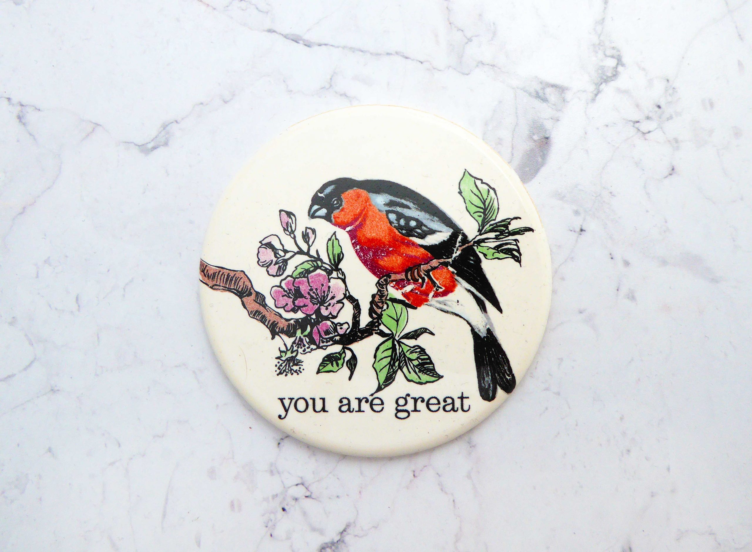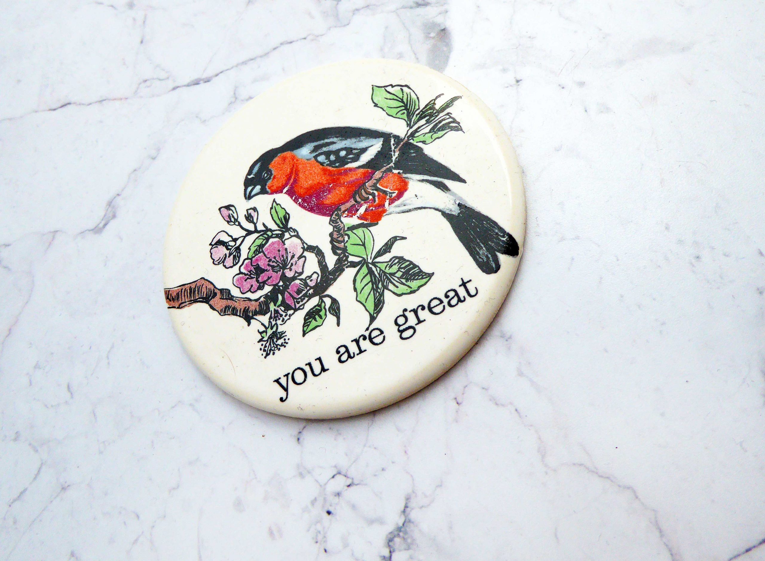 Jeder Wandteller wird handgefertigt. Dieser Wandteller mit einem kleinen Dompfaff und mit unserer Typo you are great kann er für alle Dekozwecke genutz werden.