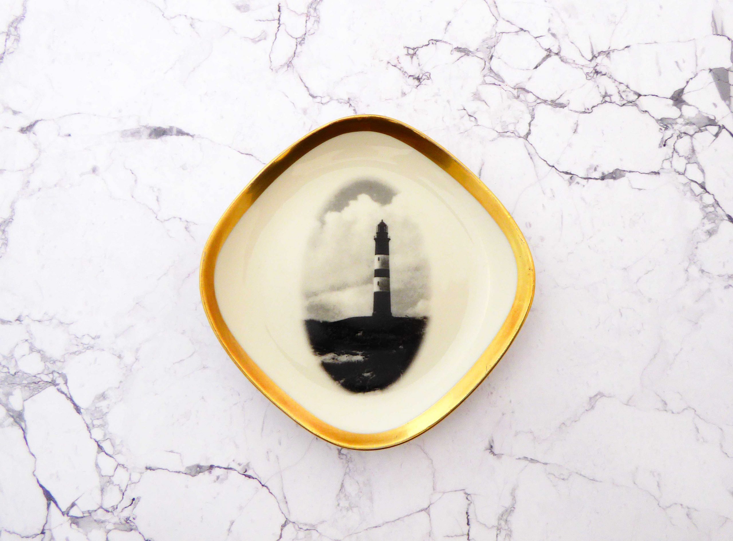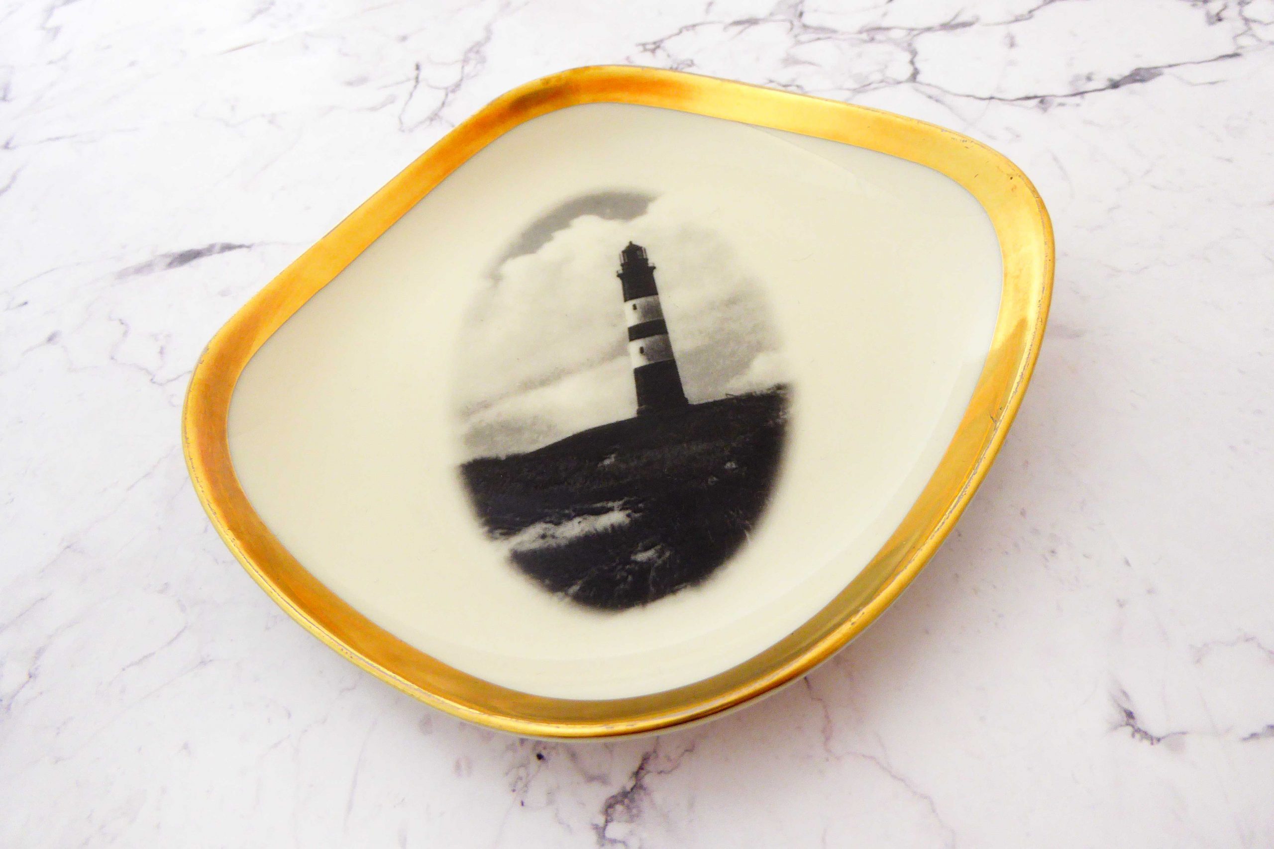 Jeder Wandteller wird handgefertigt und jeder der vintage Teller ist immer wieder ein Einzelstück. Dieser schöne Miniteller ist eckig/oval. Diese besondere Wandteller hat einen schönen breiten goldenen Rand und mit unserem Leuchtturm kann er für alle Dekozwecke genutz werden.
