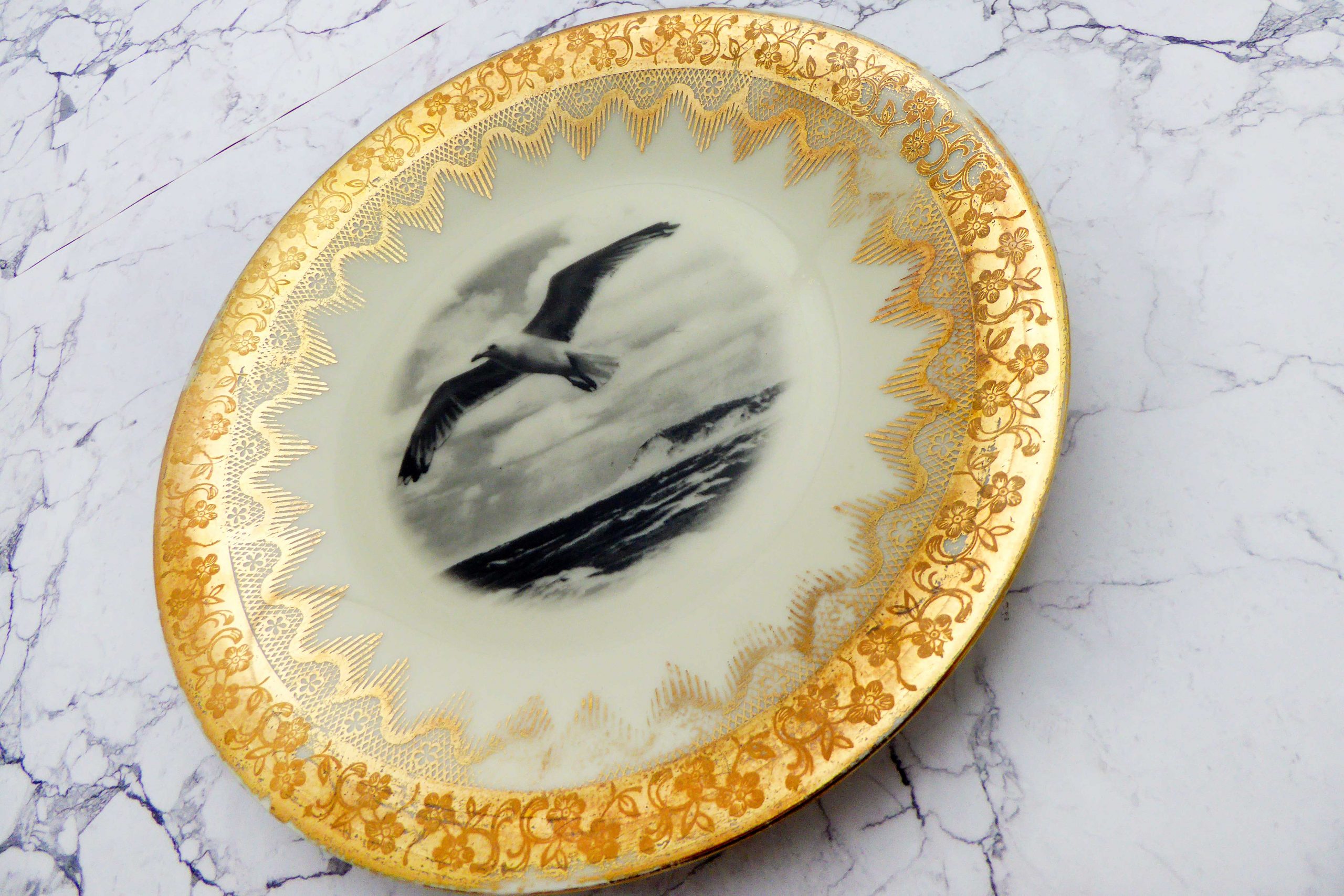 Jeder Wandteller wird handgefertigt und jeder der vintage Teller ist immer wieder ein Einzelstück. Dieser schöne Wandteller hat einen schönen Rand mit goldenen Muster. Mit unserer Möwe kann er für alle Dekozwecke genutz werden.