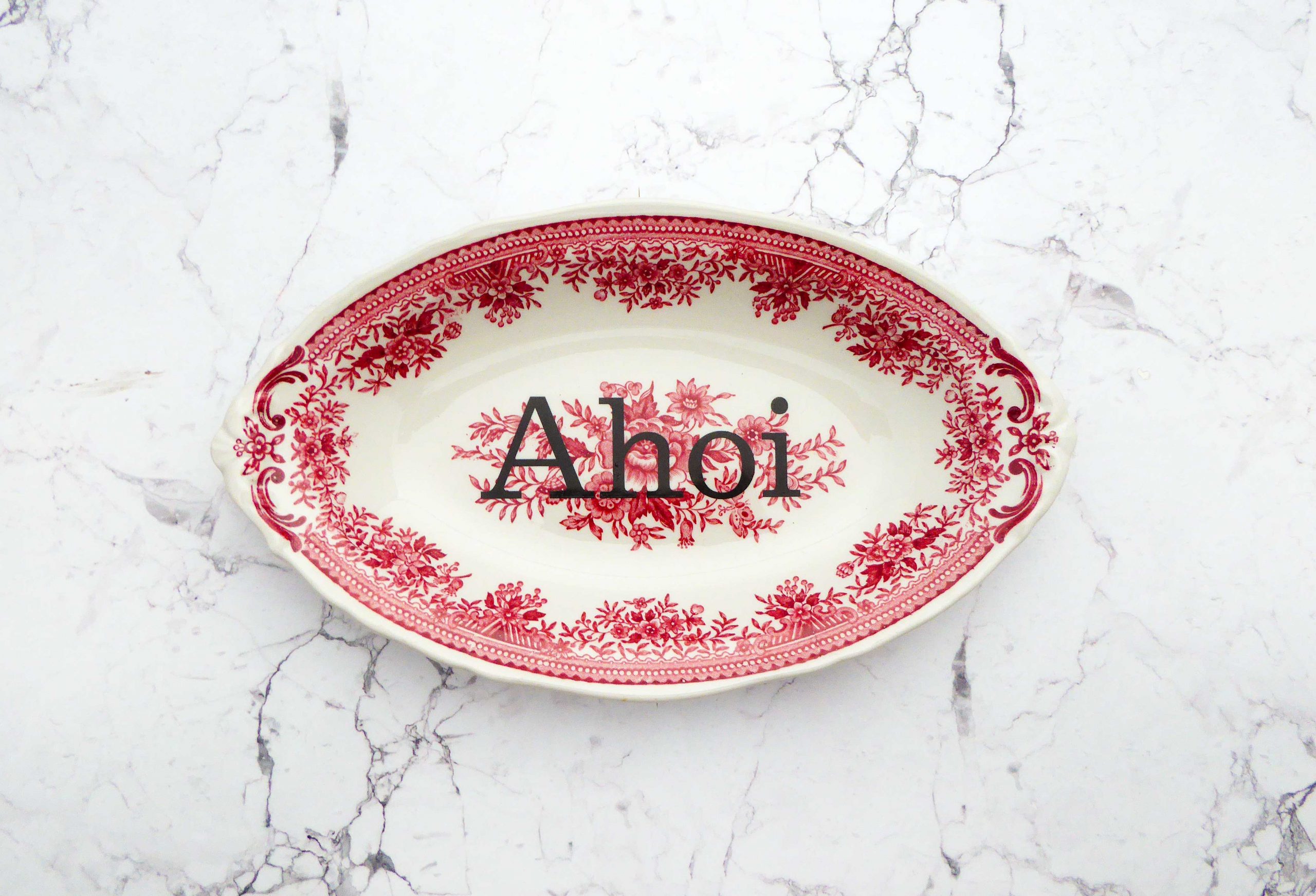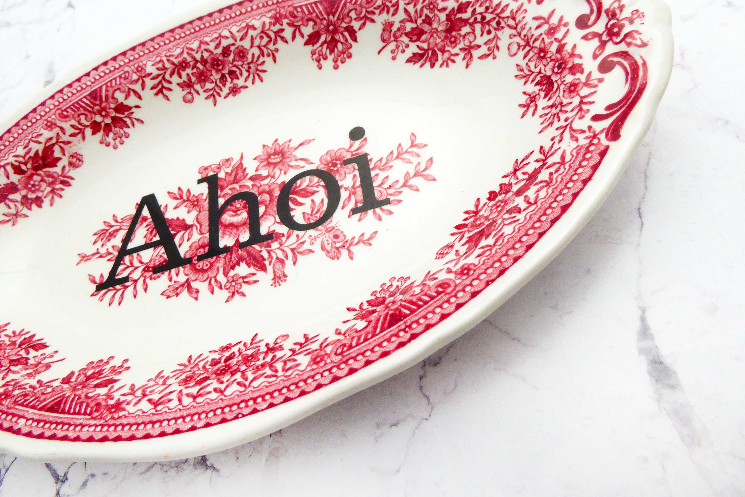 Jeder Wandteller wird handgefertigt und jeder der Teller ist immer wieder ein Einzelstück. Diese besondere Wandplatte ist länglich und hat einen wunderschönes rot/lila/rosa Blumenmuster mit unsere Typo Ahoi kann er für alle Dekozwecke genutz werden.