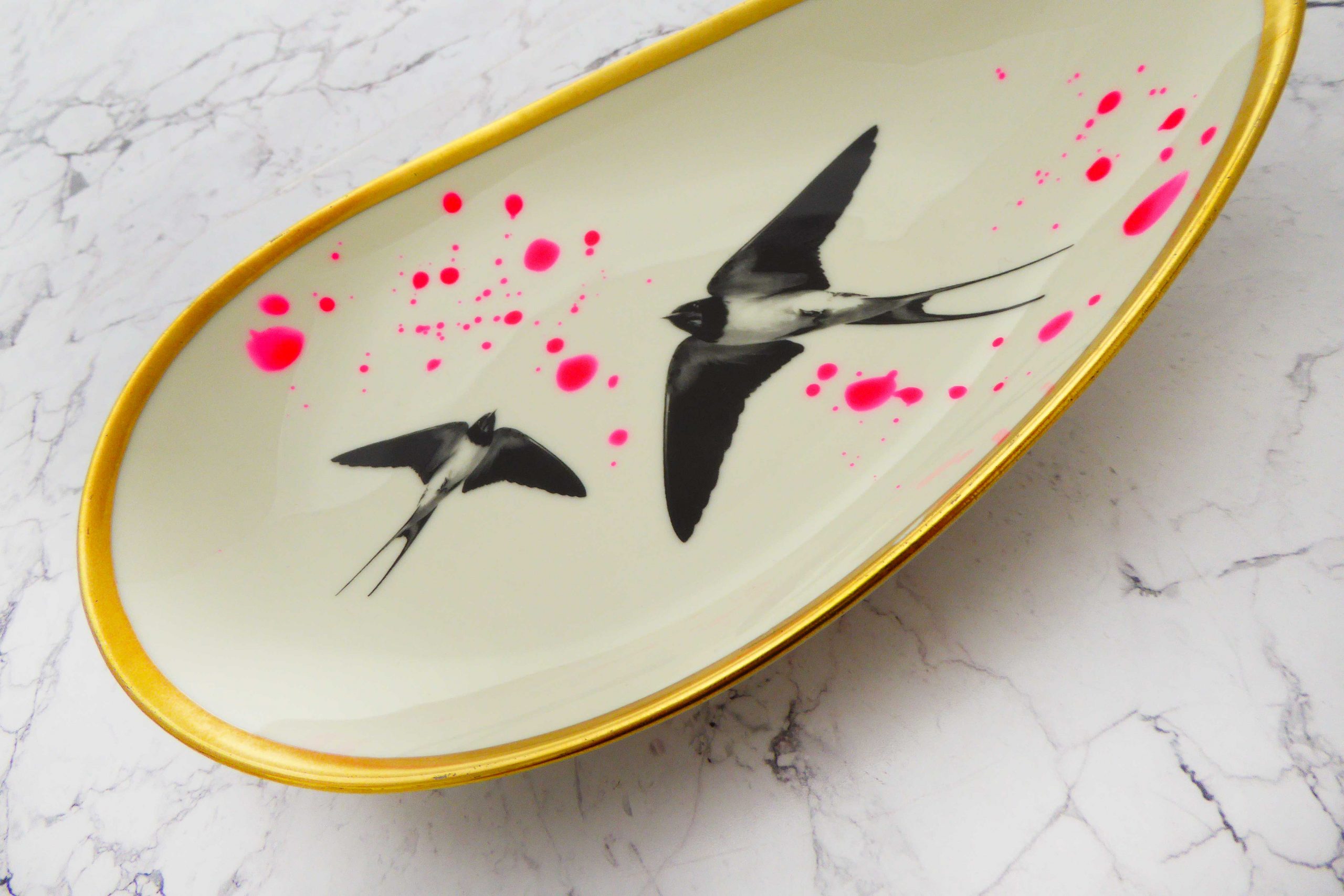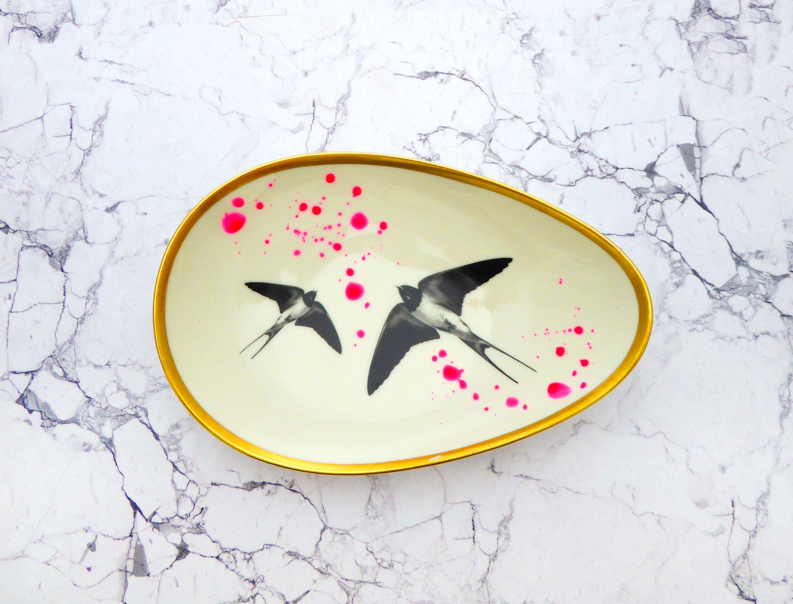 Jeder Wandteller wird handgefertigt und jeder der vintage Teller ist immer wieder ein Einzelstück. Diese Wandplatte ist oval/länglich und hat einen wunderschönen Goldrand, tolle neon Kleckse und mit unserm Motiv Schwalbe kann er für alle Dekozwecke genutz werden.