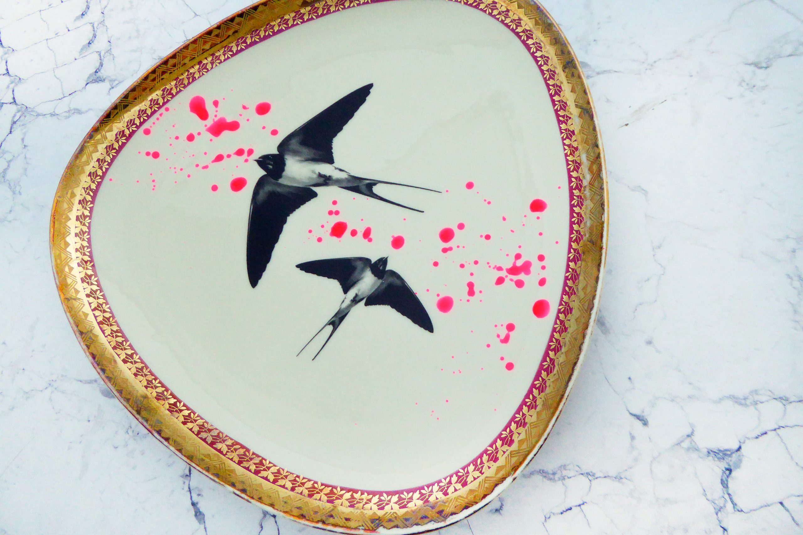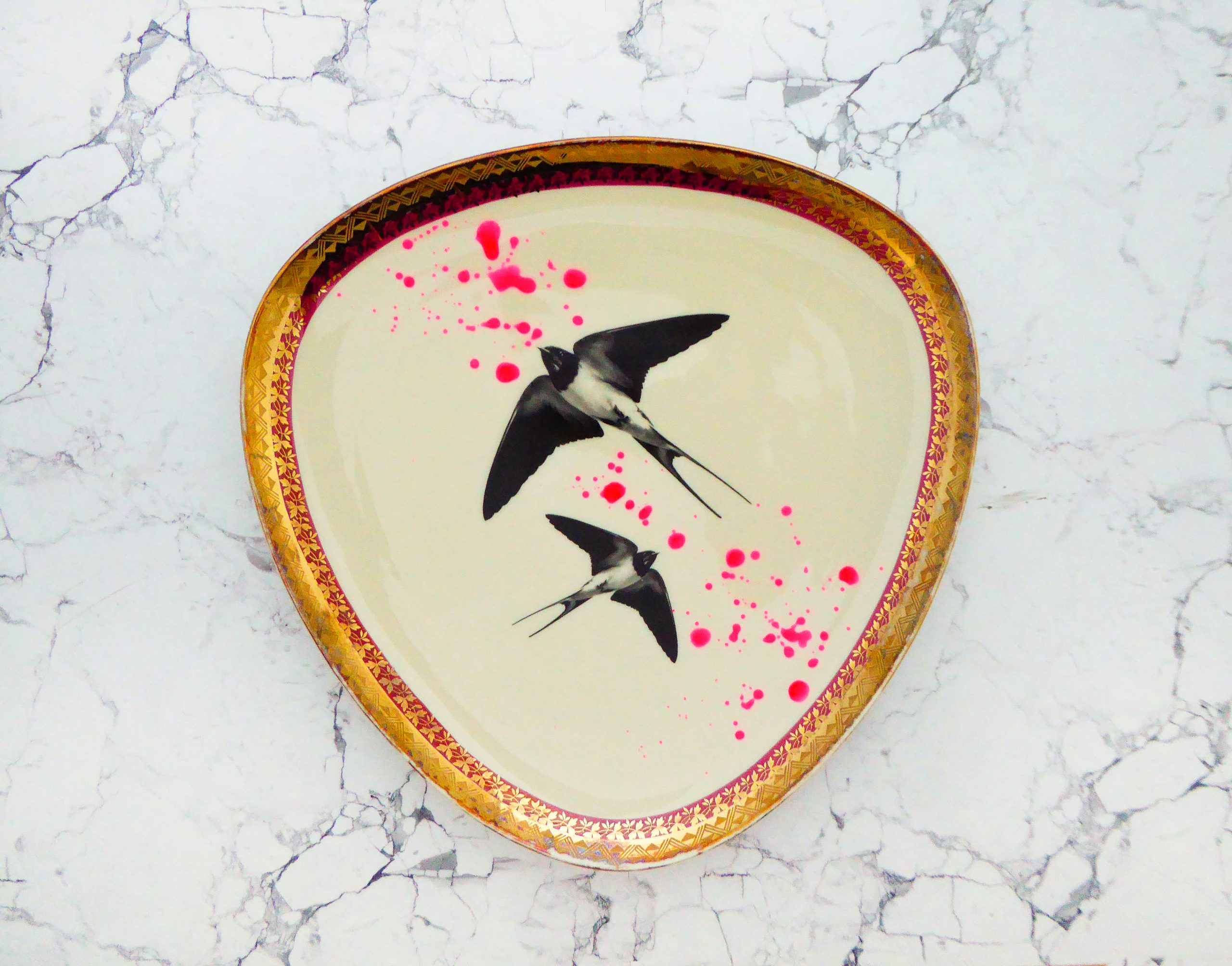 Jeder Wandteller wird handgefertigt und jeder der vintage Teller ist immer wieder ein Einzelstück. Diese Wandplatte ist eckig und hat einen wunderschönen Rot/Lila/Goldrand, tolle neon Kleckse und mit unserm Motiv Schwalbe kann er für alle Dekozwecke genutz werden.