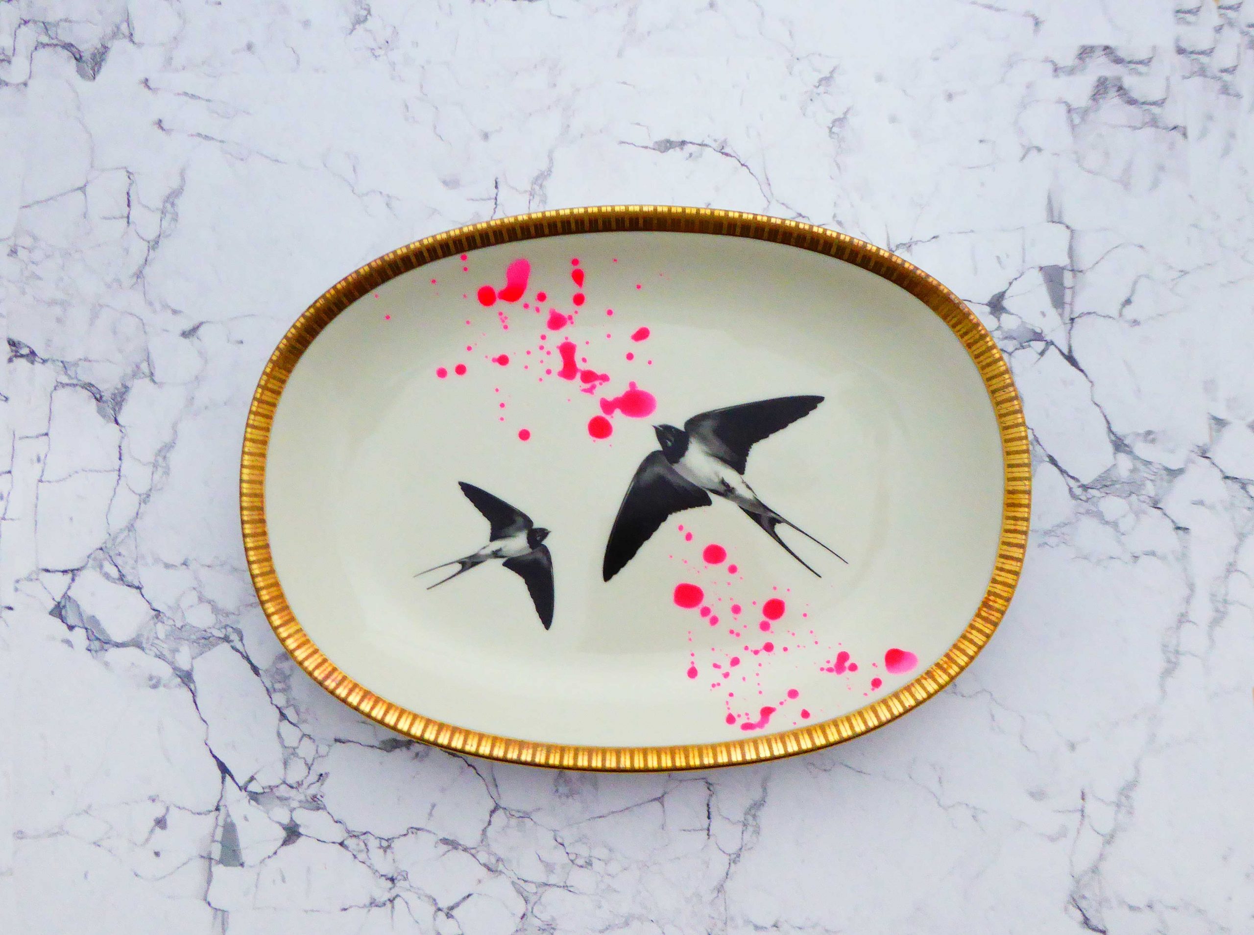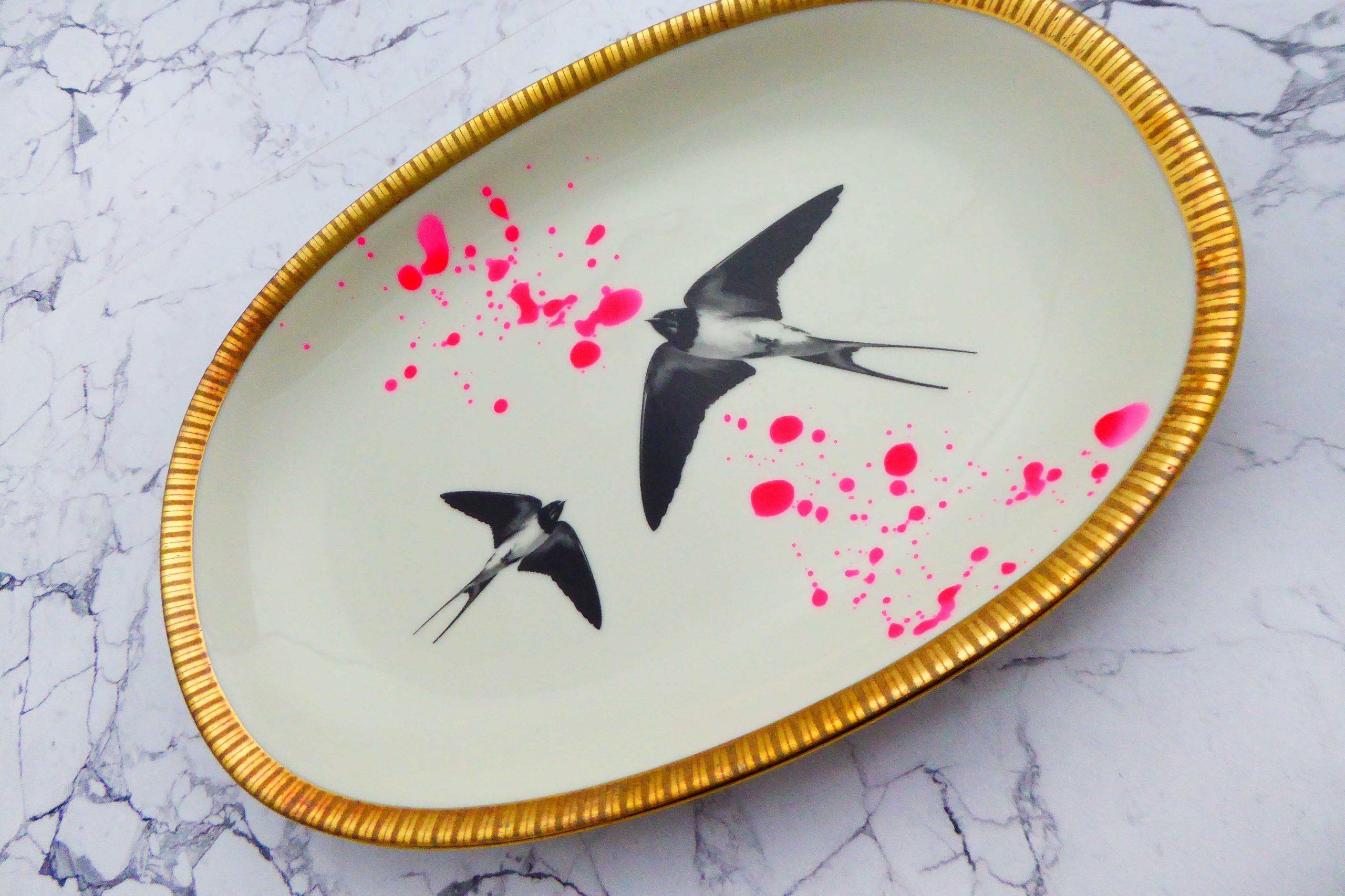 Wandteller Platte Herr Fuchs Schwalbe gold Wohnen 24/17cm neonpink Kleckse vintage
