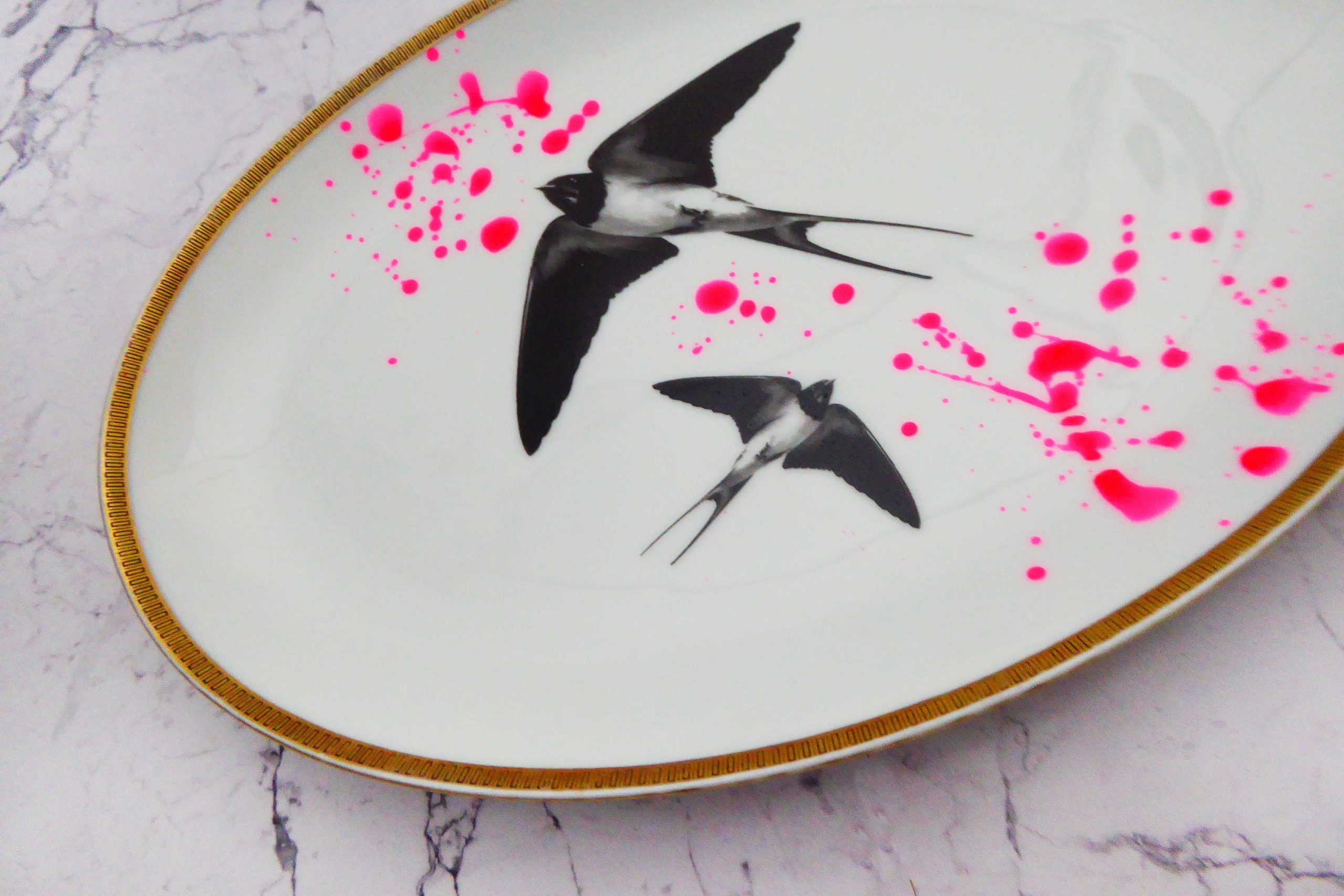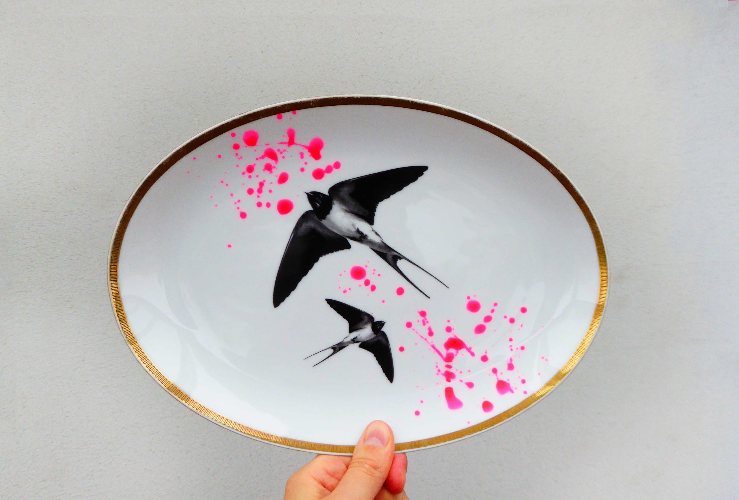 Wandteller Platte Herr Fuchs Schwalbe gold Wohnen 27/20cm neonpink Kleckse vintage
