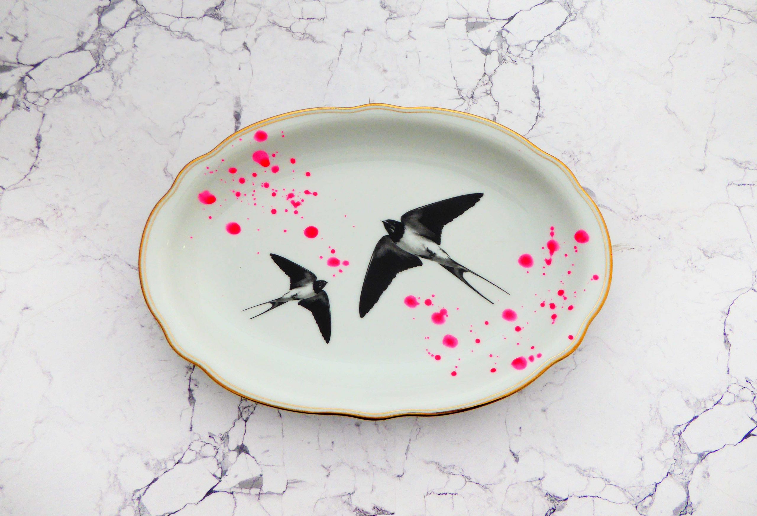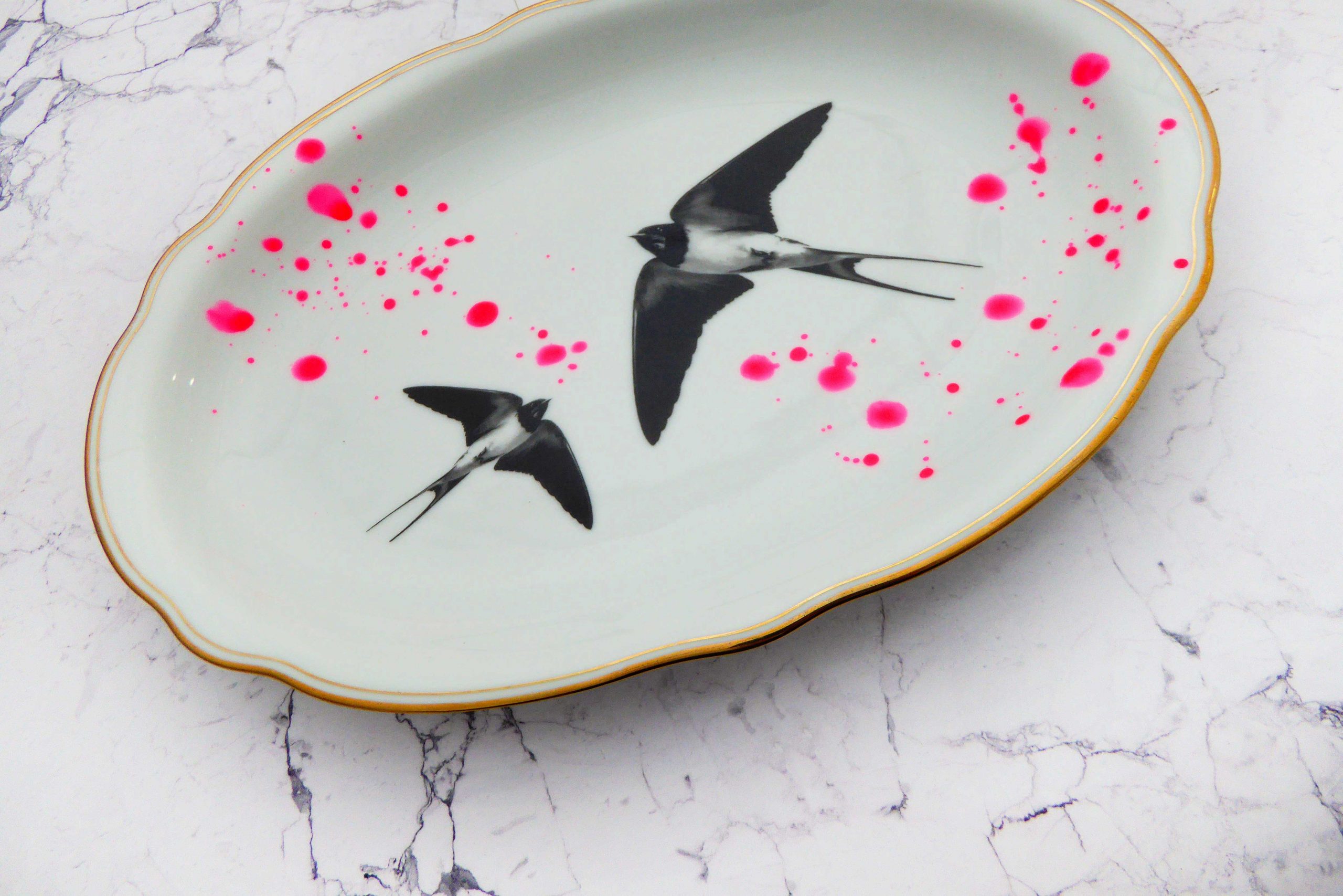 Wandteller Platte Herr Fuchs Schwalbe gold Wohnen 28/18cm neonpink Kleckse vintage Bögen