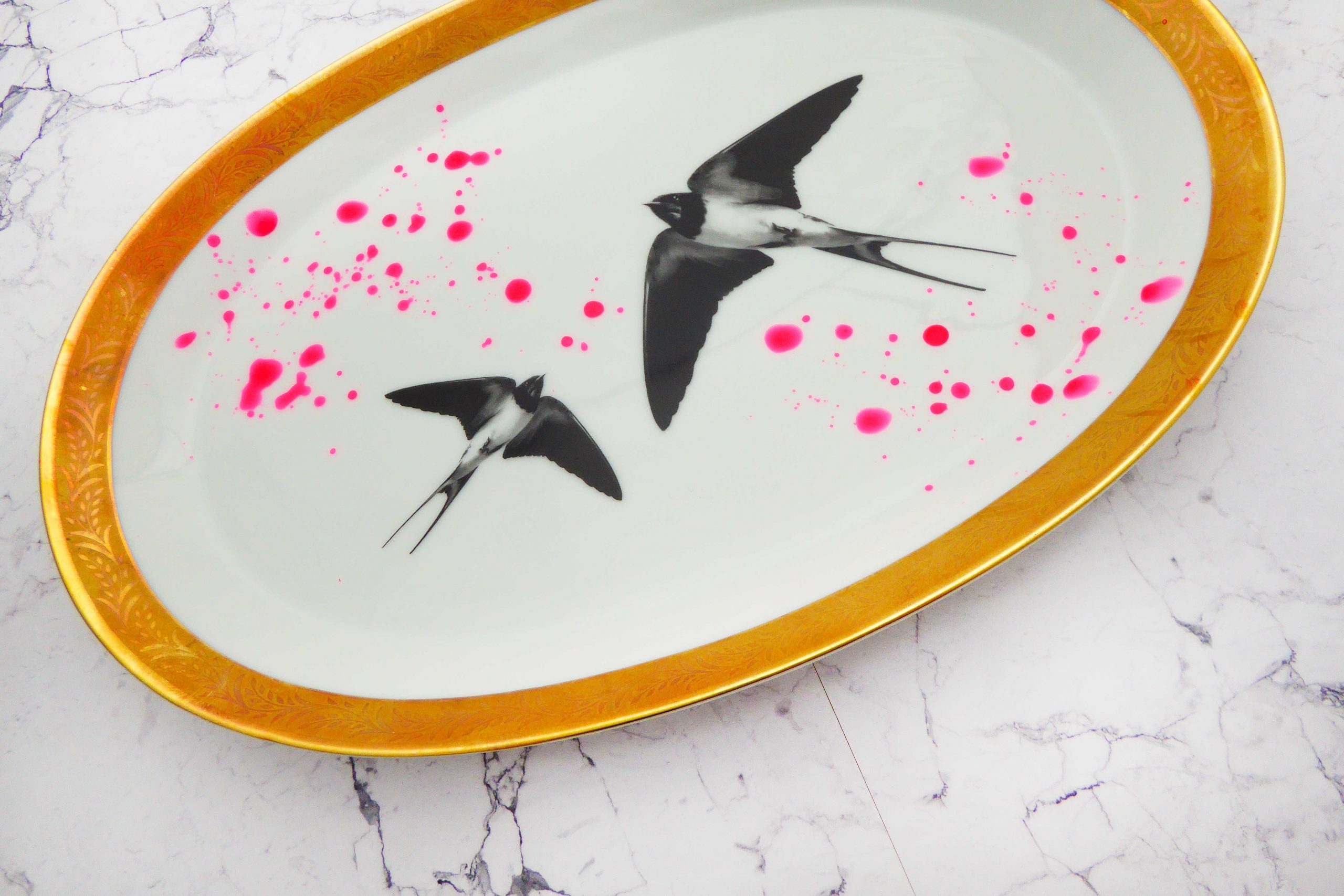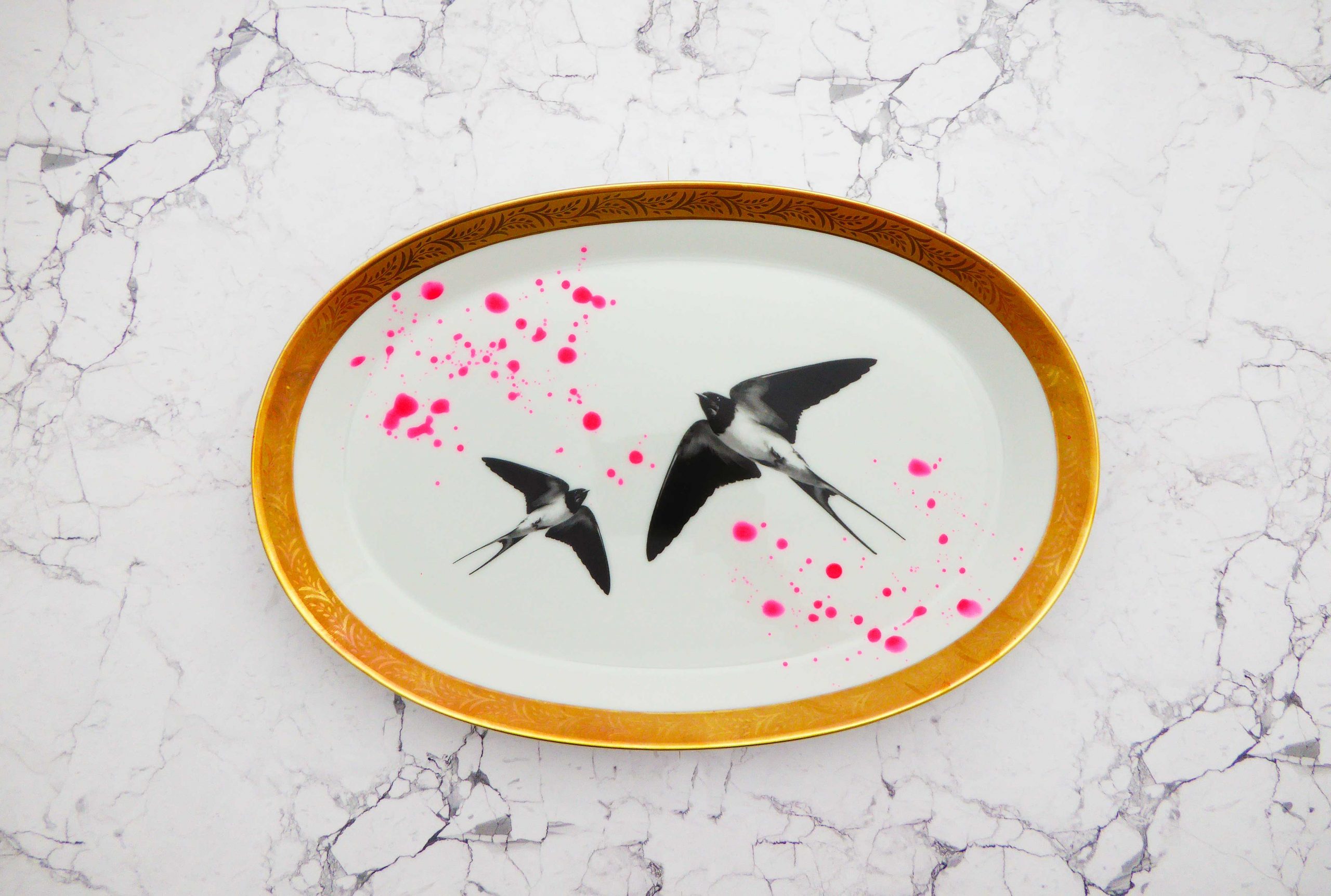 Jeder Wandteller wird handgefertigt und jeder der vintage Teller ist immer wieder ein Einzelstück. Diese Wandplatte ist länglich und hat einen wunderschönen breiten Goldrand, tolle neon Kleckse und mit unserm Motiv Schwalbe kann er für alle Dekozwecke genutz werden.