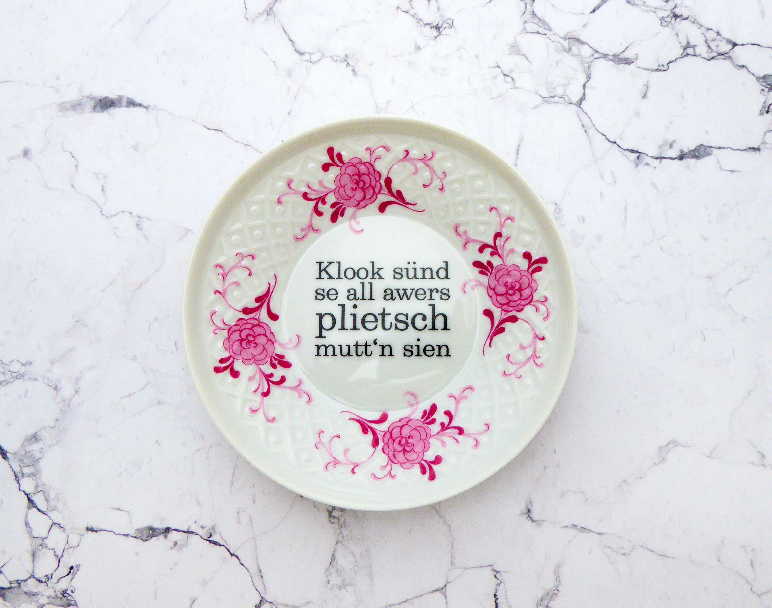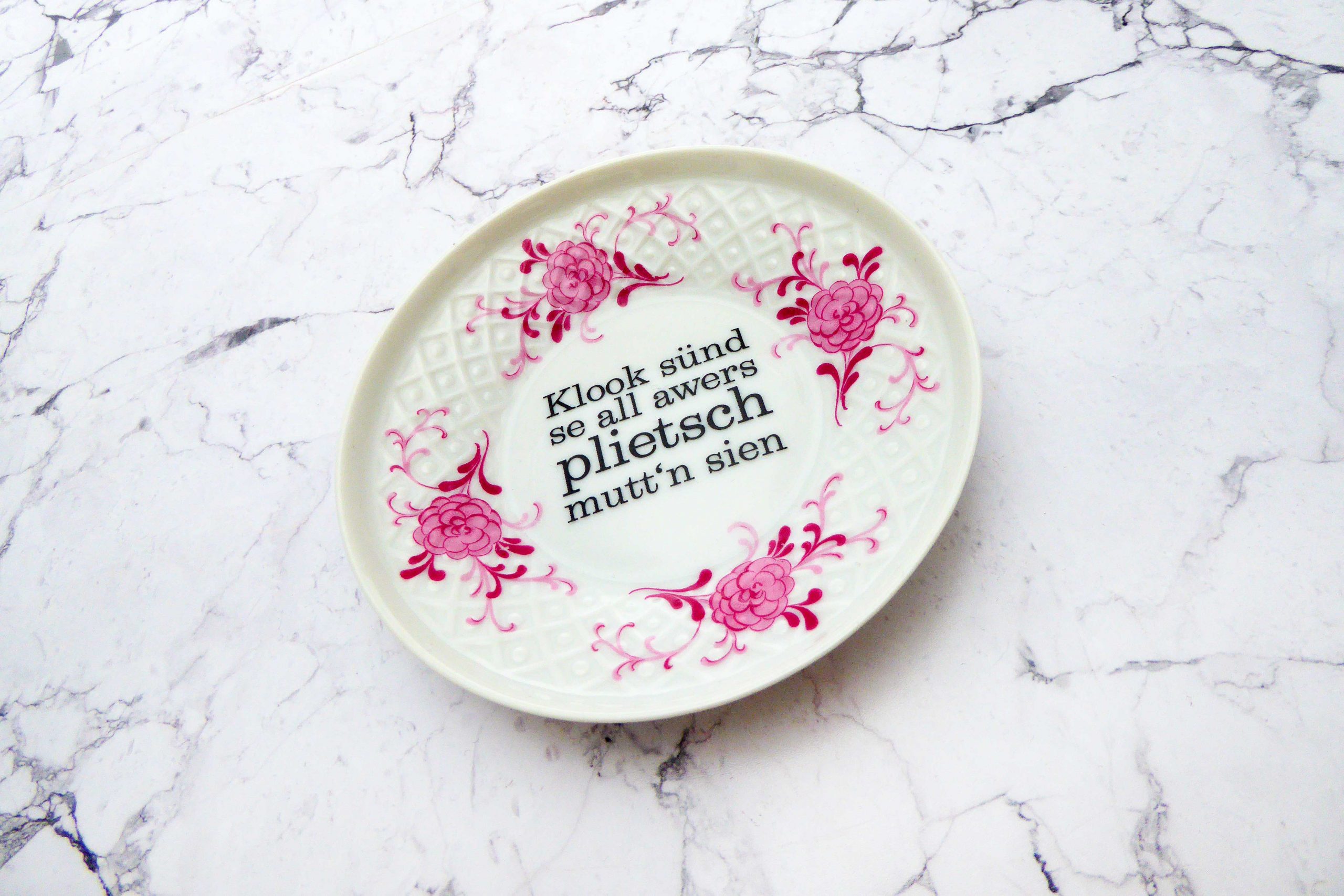 Dieser Wandteller hat ein schönes Decor mit lila/rosa Blumenmuster mit unserer plietsch Typo kann er für alle Dekozwecke genutz werden.