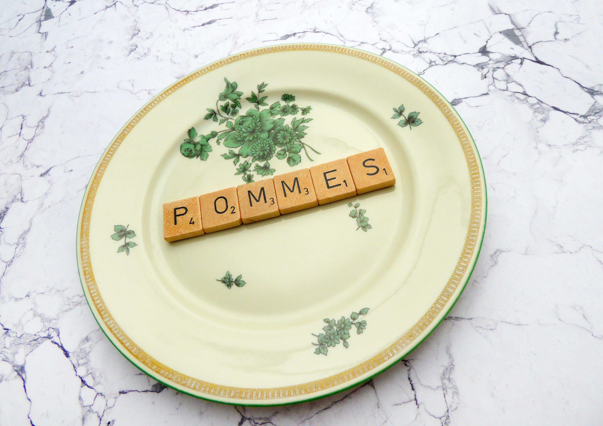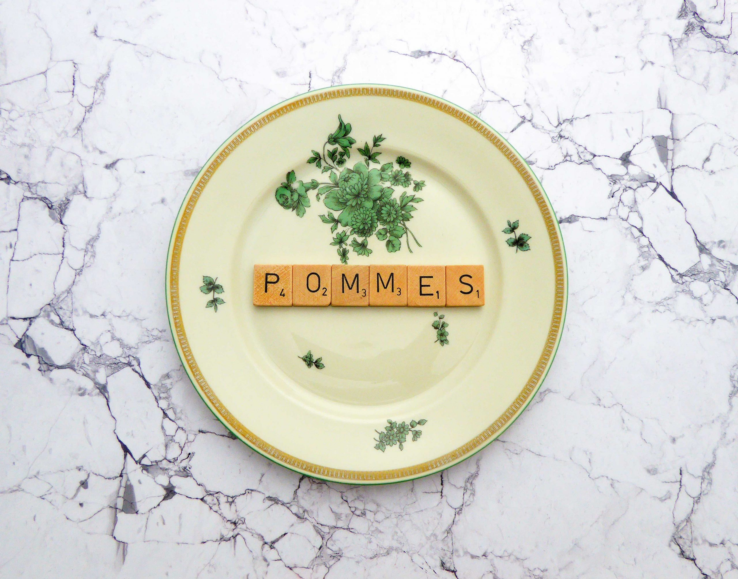 Jeder Wandteller wird handgefertigt und jeder der vintage Teller ist immer wieder ein Einzelstück. Dieser besondere Wandteller hat einen Goldrand, ein wunderschönes grünes Blumendecor und unsere Pommes Decor in Original Scrabble Steinen.