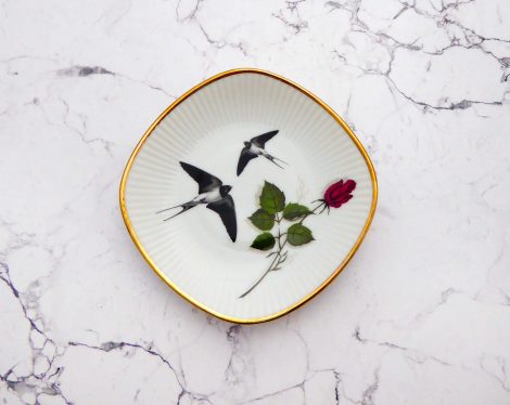 Jeder Wandteller wird handgefertigt und jeder der vintage Teller ist immer wieder ein Einzelstück. Dieser schöne eckige Miniteller ist hat einen schönen Goldrand, ein Streifen Goldecor, schöne Blumen und mit unserer Schwalbe kann er für alle Dekozwecke genutz werden.