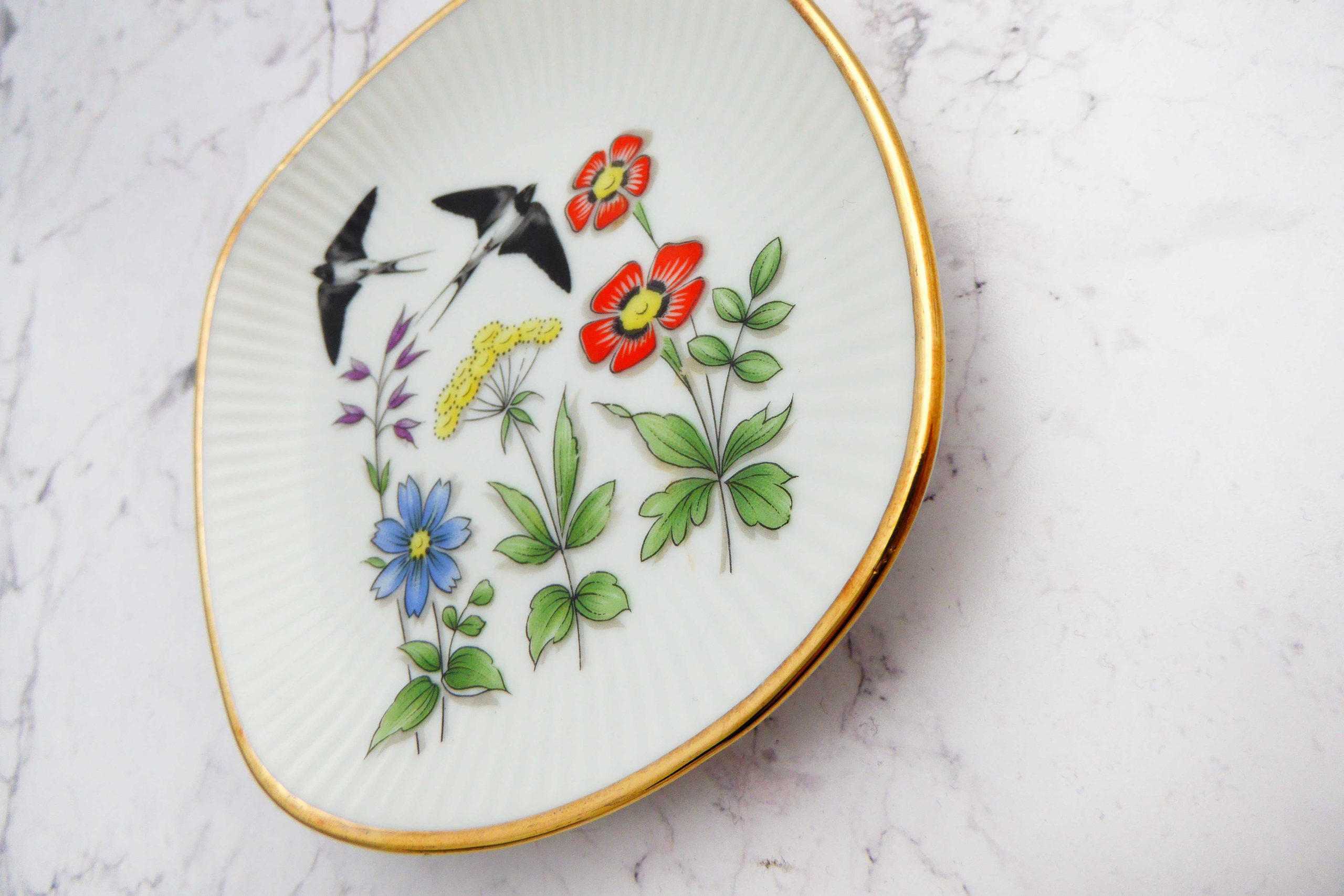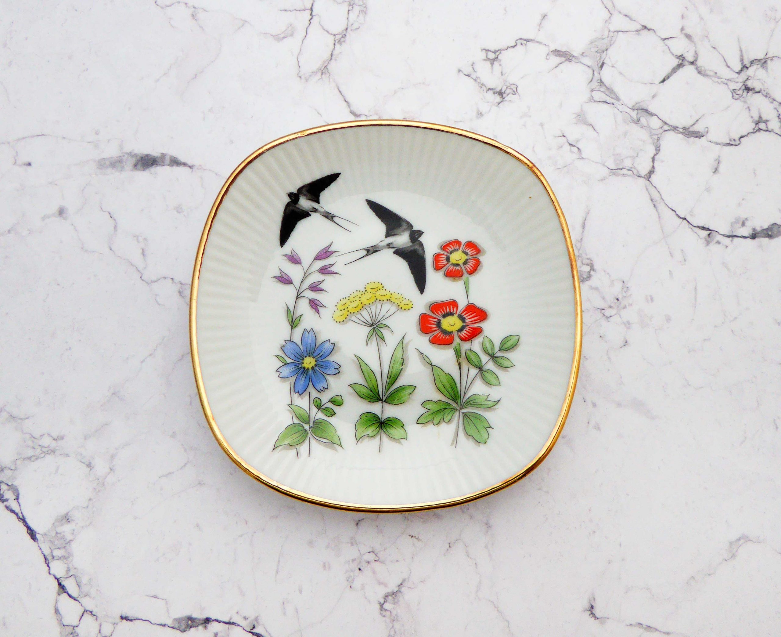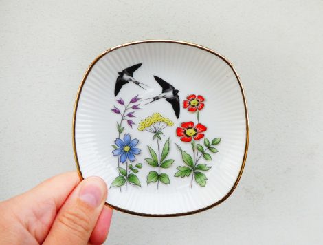 Jeder Wandteller wird handgefertigt und jeder der vintage Teller ist immer wieder ein Einzelstück. Dieser schöne eckige Miniteller ist hat einen schönen Goldrand, Blumen und mit unseren Schwalben kann er für alle Dekozwecke genutz werden.
