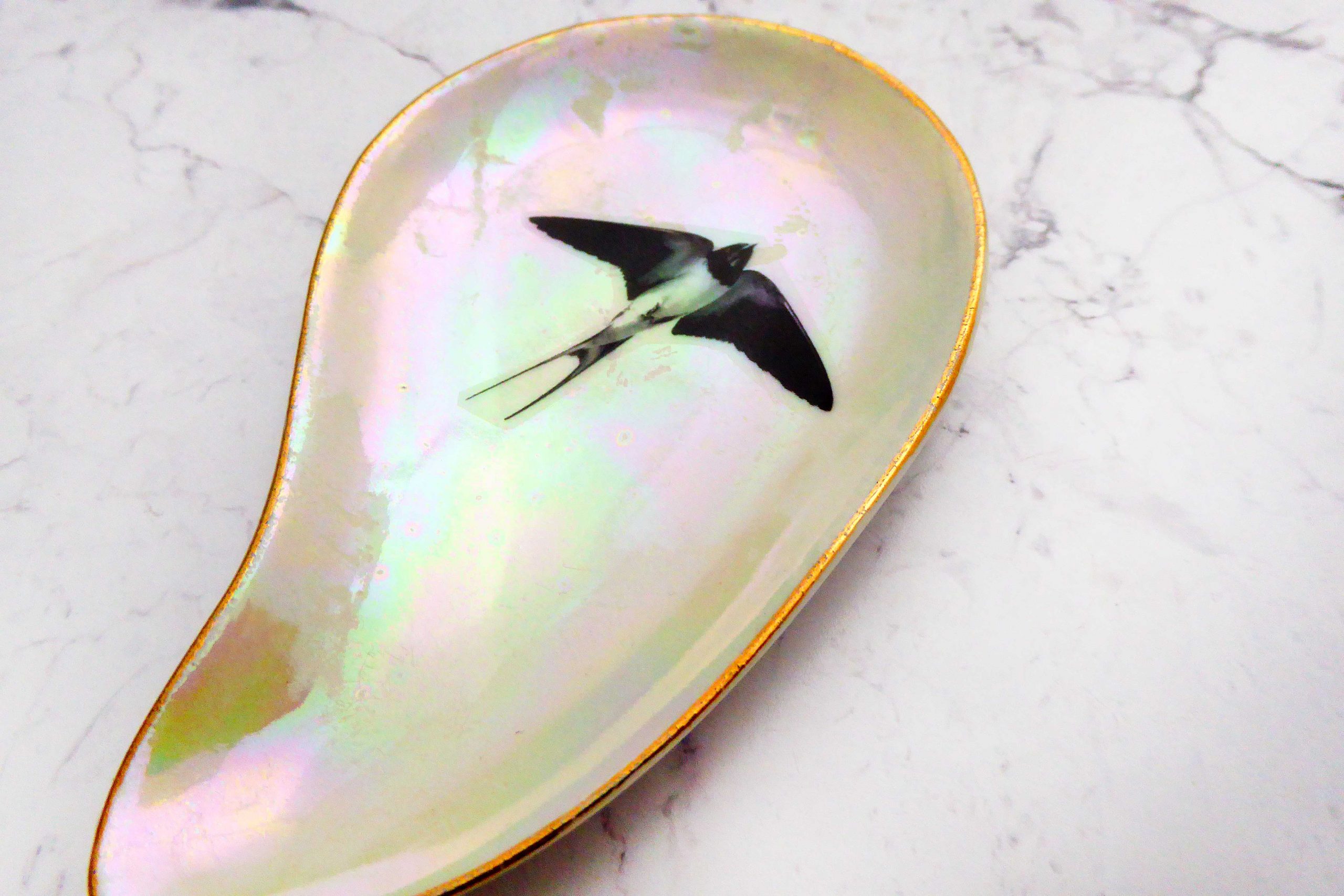 Dieser ovale Wandteller hat ein schönen Goldrand, ein besonderes irisierendes Decor und mit unserem Motiv Schwalbe kann er für alle Dekozwecke genutz werden.