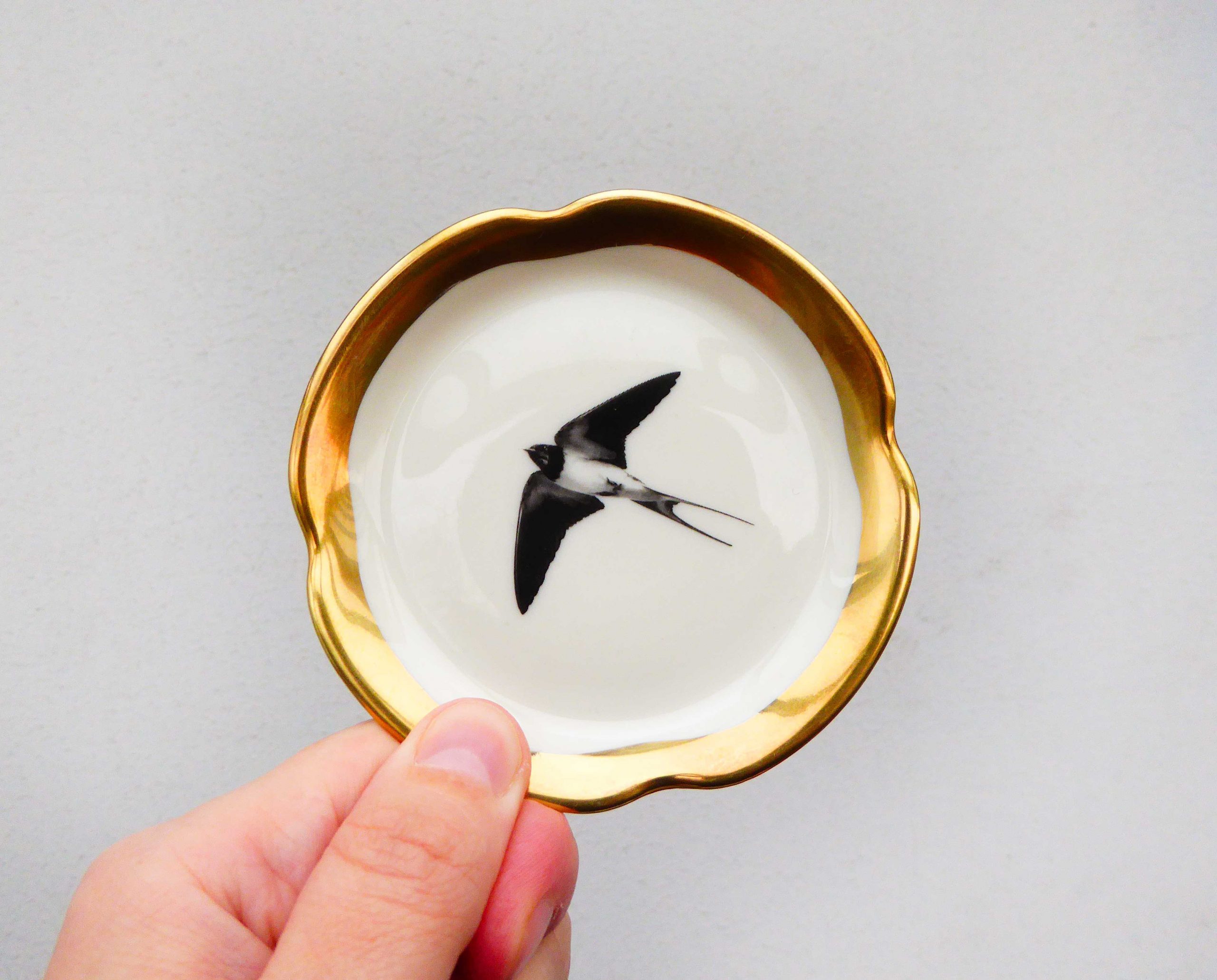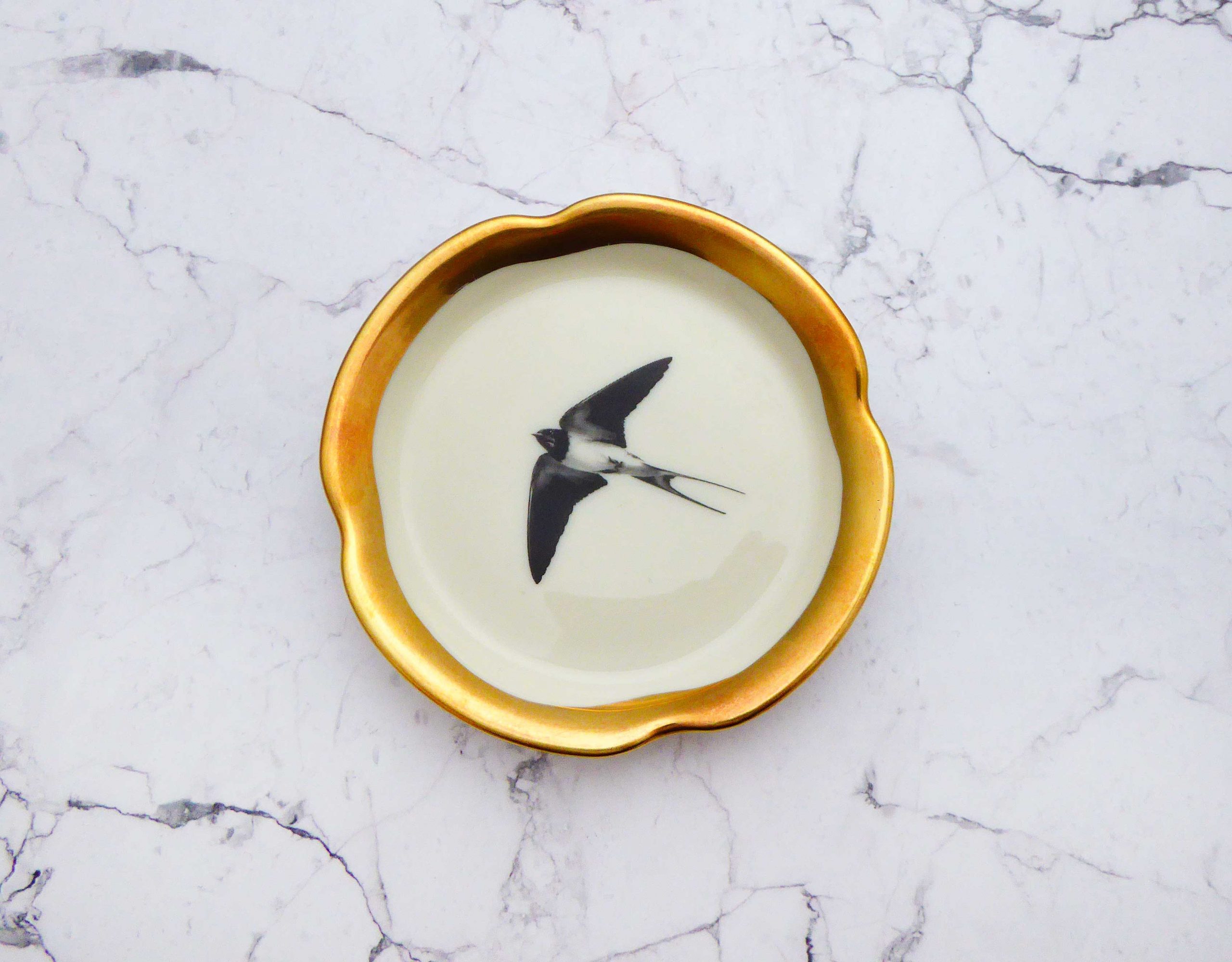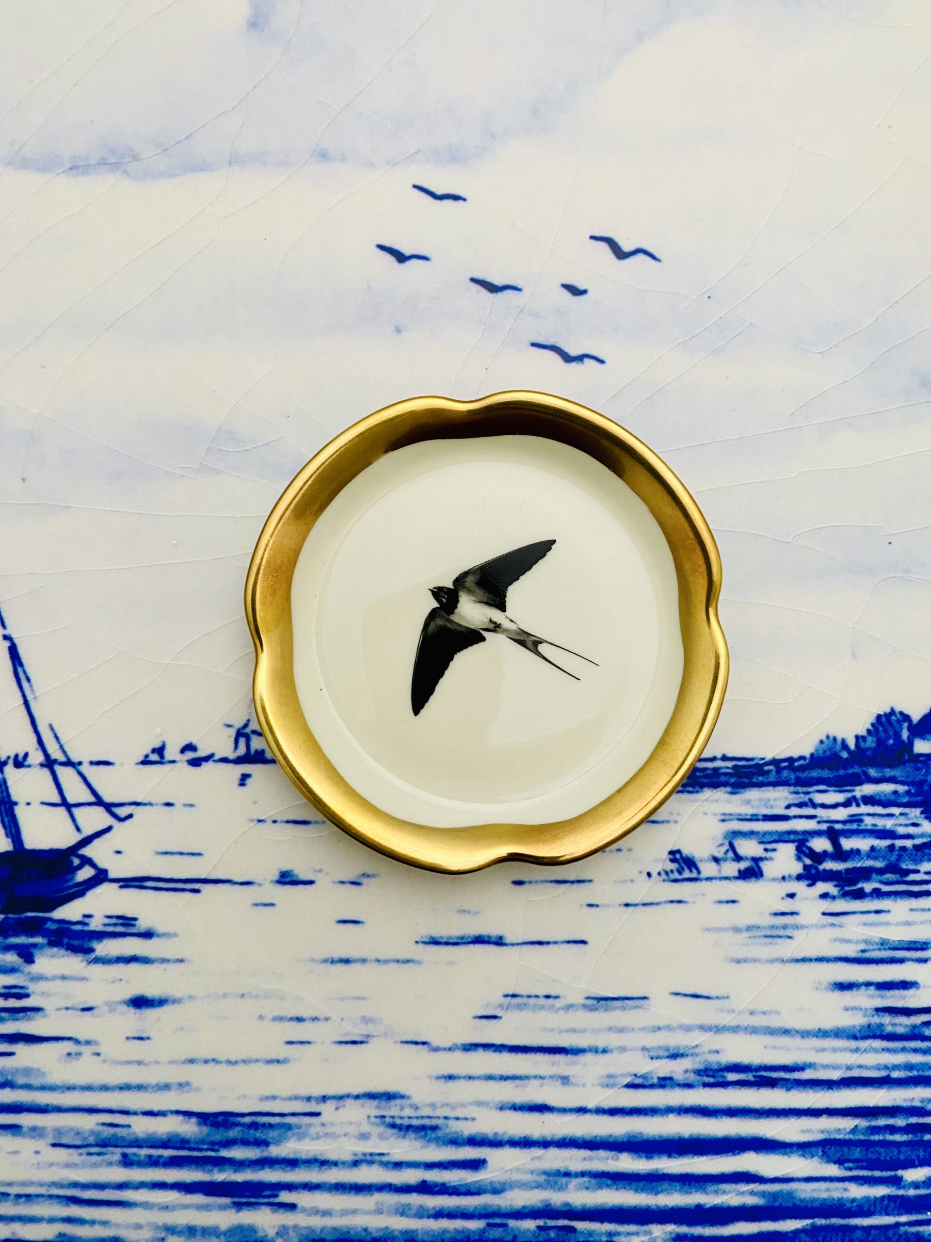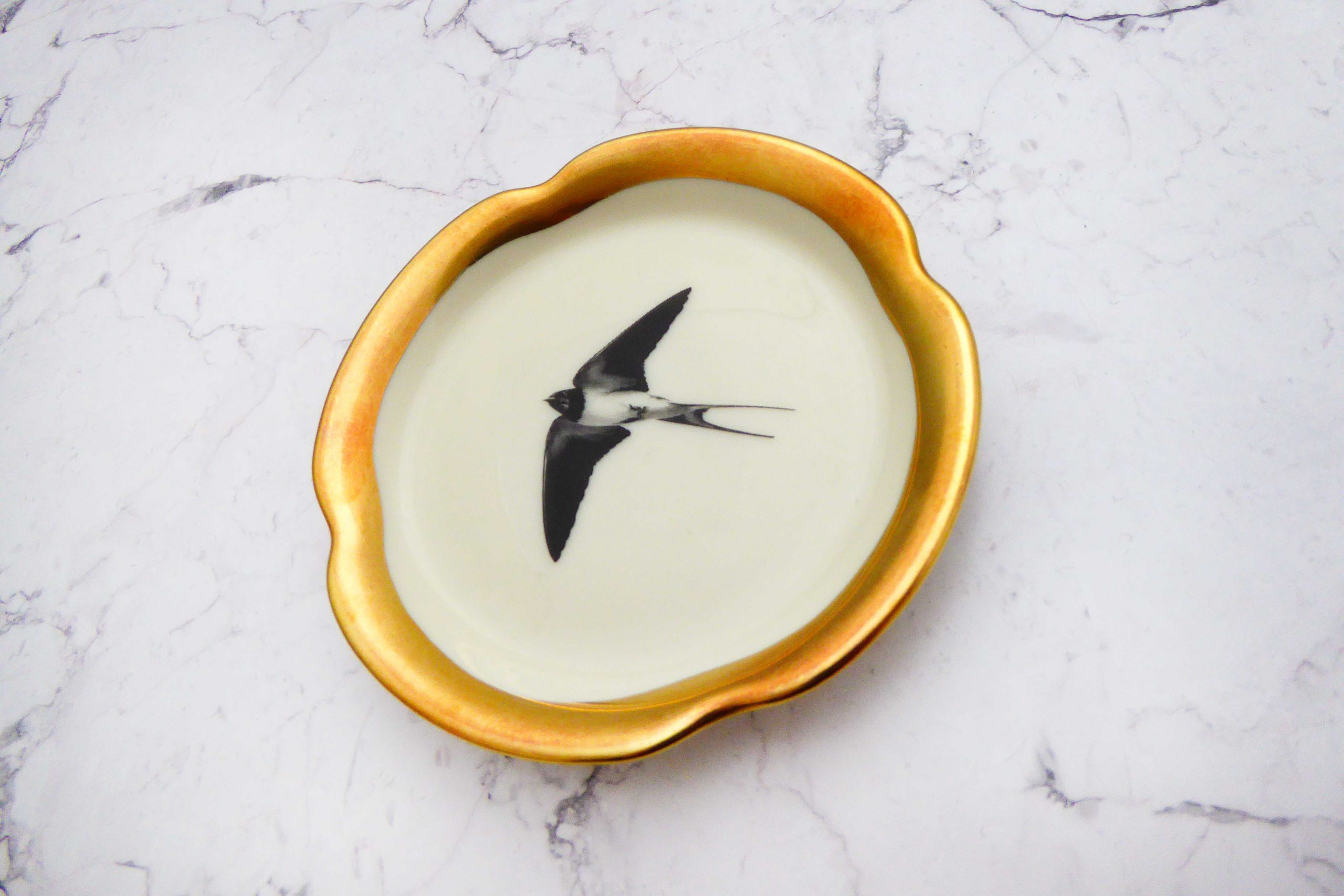 Dieser Wandteller hat ein schönen Goldrand, hat schöne Bögen und mit unserem Motiv Schwalbe kann er für alle Dekozwecke genutz werden.