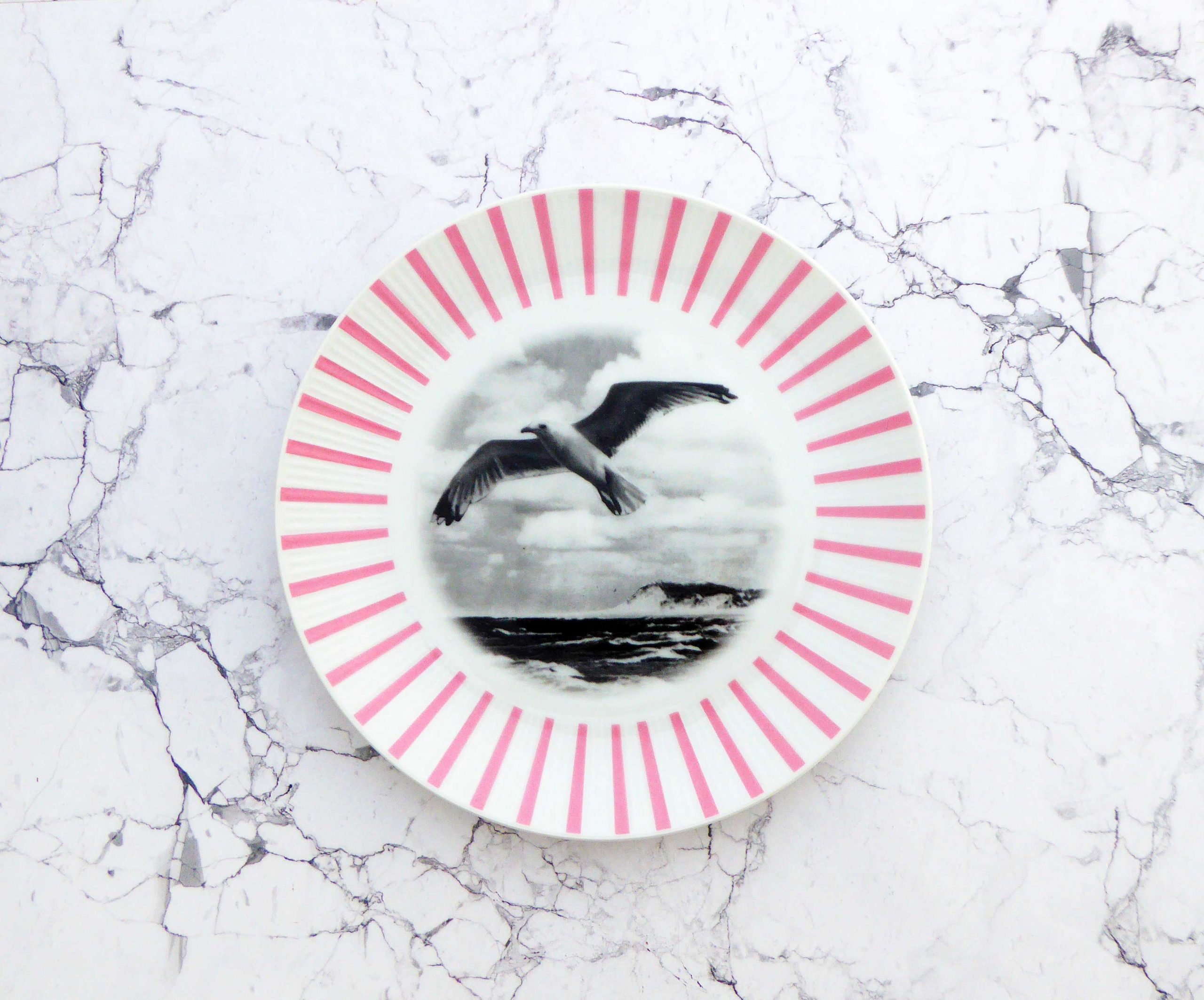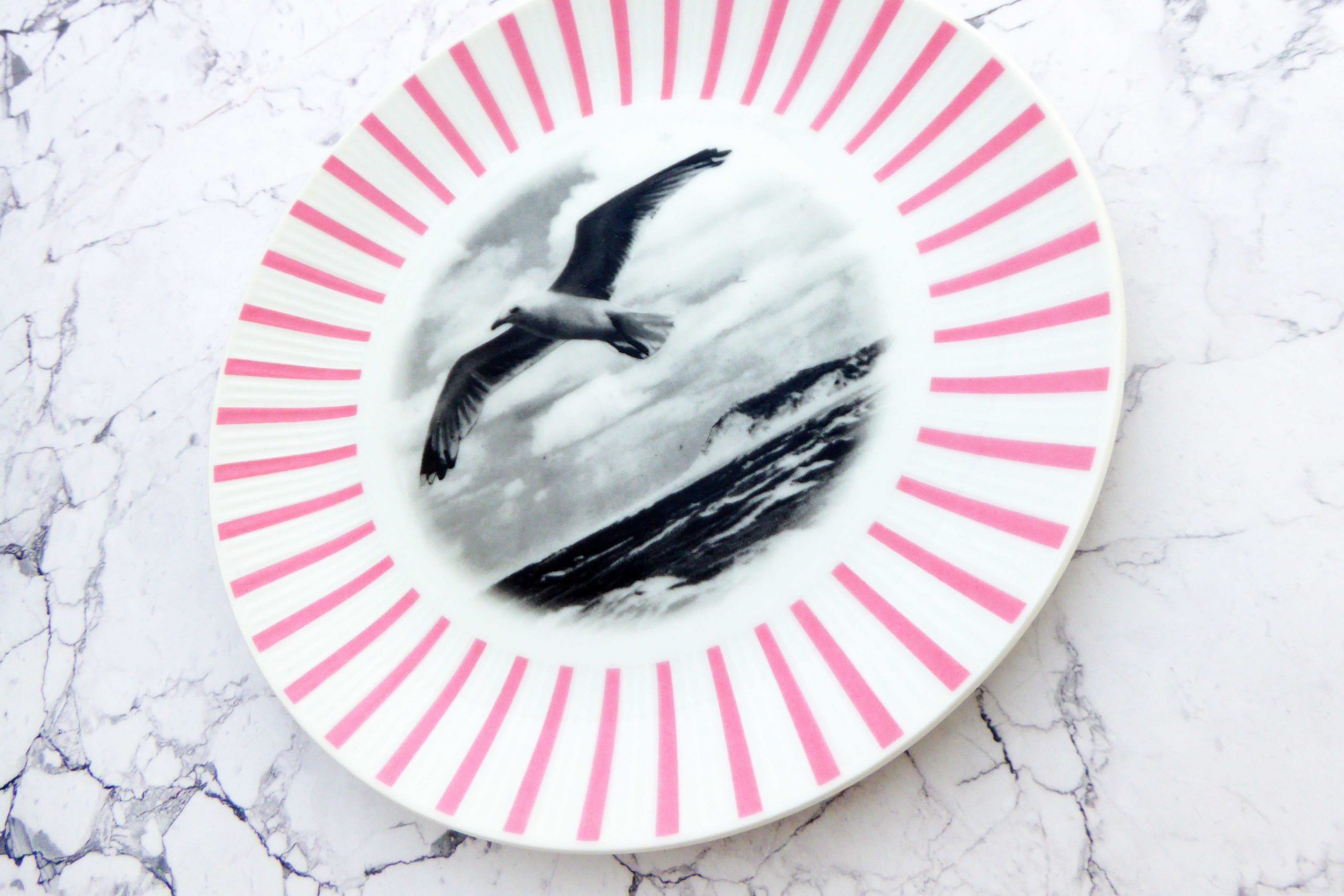 Jeder Wandteller wird handgefertigt und jeder der vintage Teller ist immer wieder ein Einzelstück. Dieser Wandteller hat ein schönes Decor mit rosa Linen Muster und mit unserer Möwe kann er für alle Dekozwecke genutz werden.