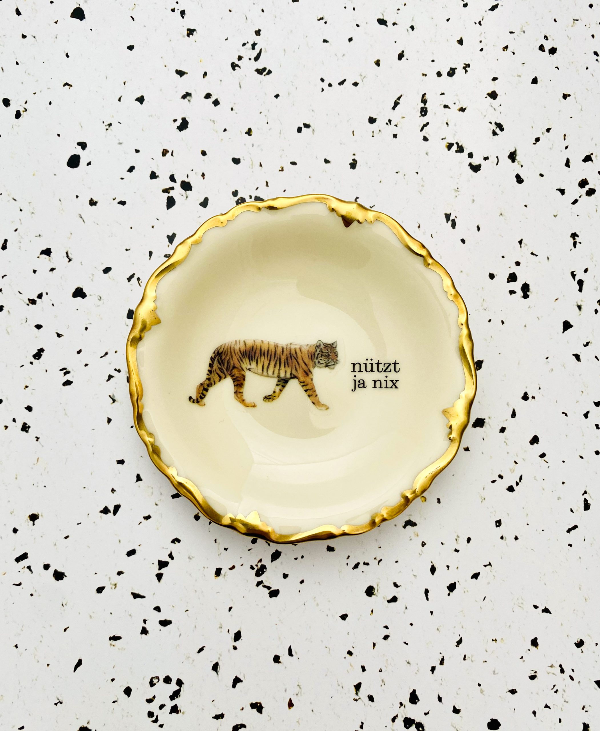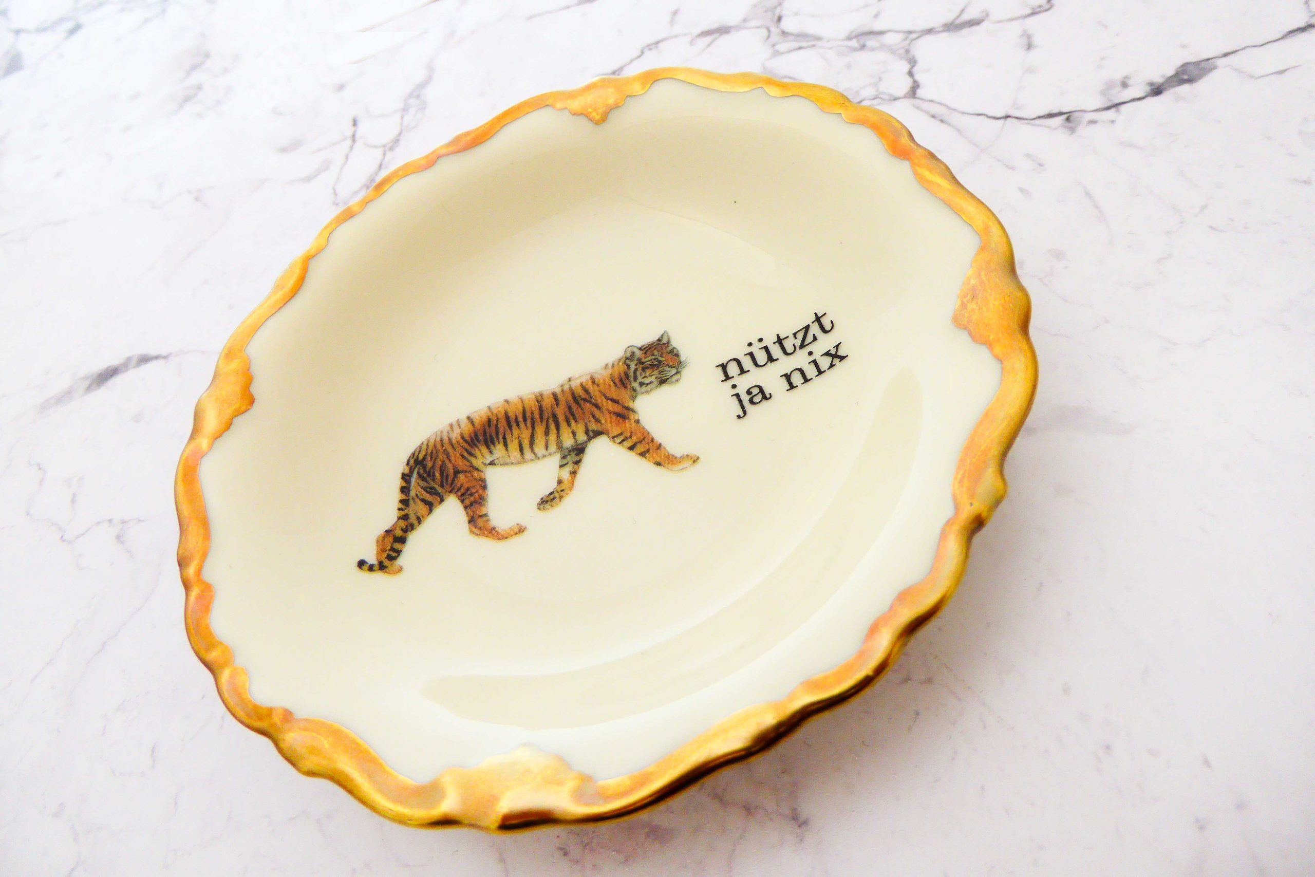 Jeder Wandteller wird handgefertigt und jeder der vintage Teller ist immer wieder ein Einzelstück. Dieser mini Wandteller hat einen besonderes schönem Goldrand mit Bögen, ein super Tiger Decor und mit unser Typo nützt ja nix kann er für alle Dekozwecke genutz werden.