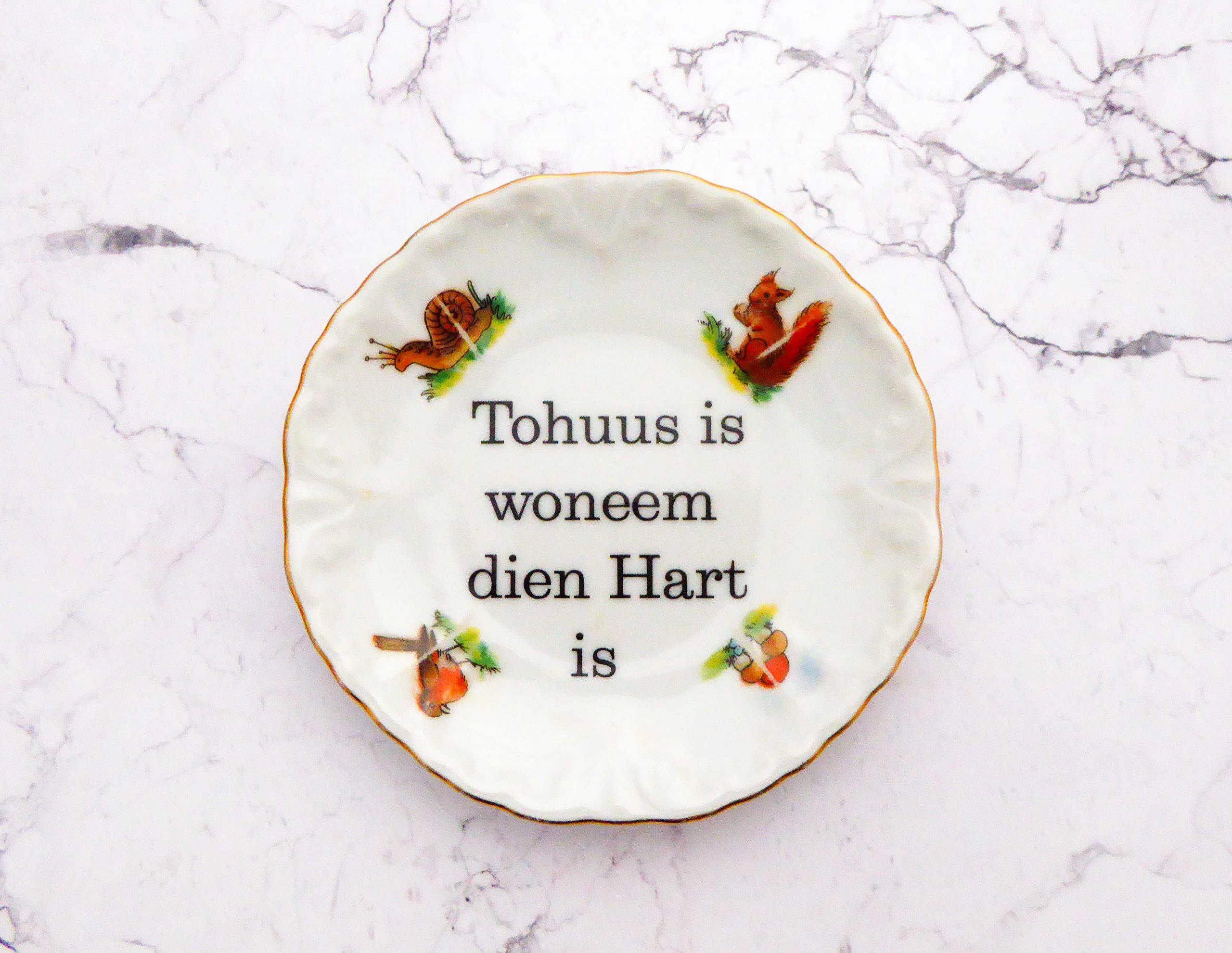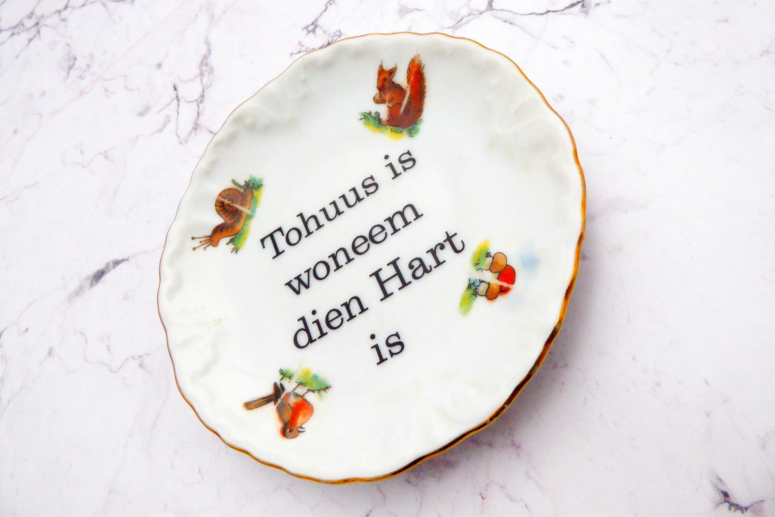 Dieser Wandteller hat ein schönes Tierdecor mit Kindertellermotiven mit Eichhörnchen, Schnecke, Pilz und Vogel und mit unserer Tohuss Typo kann er für alle Dekozwecke genutz werden.