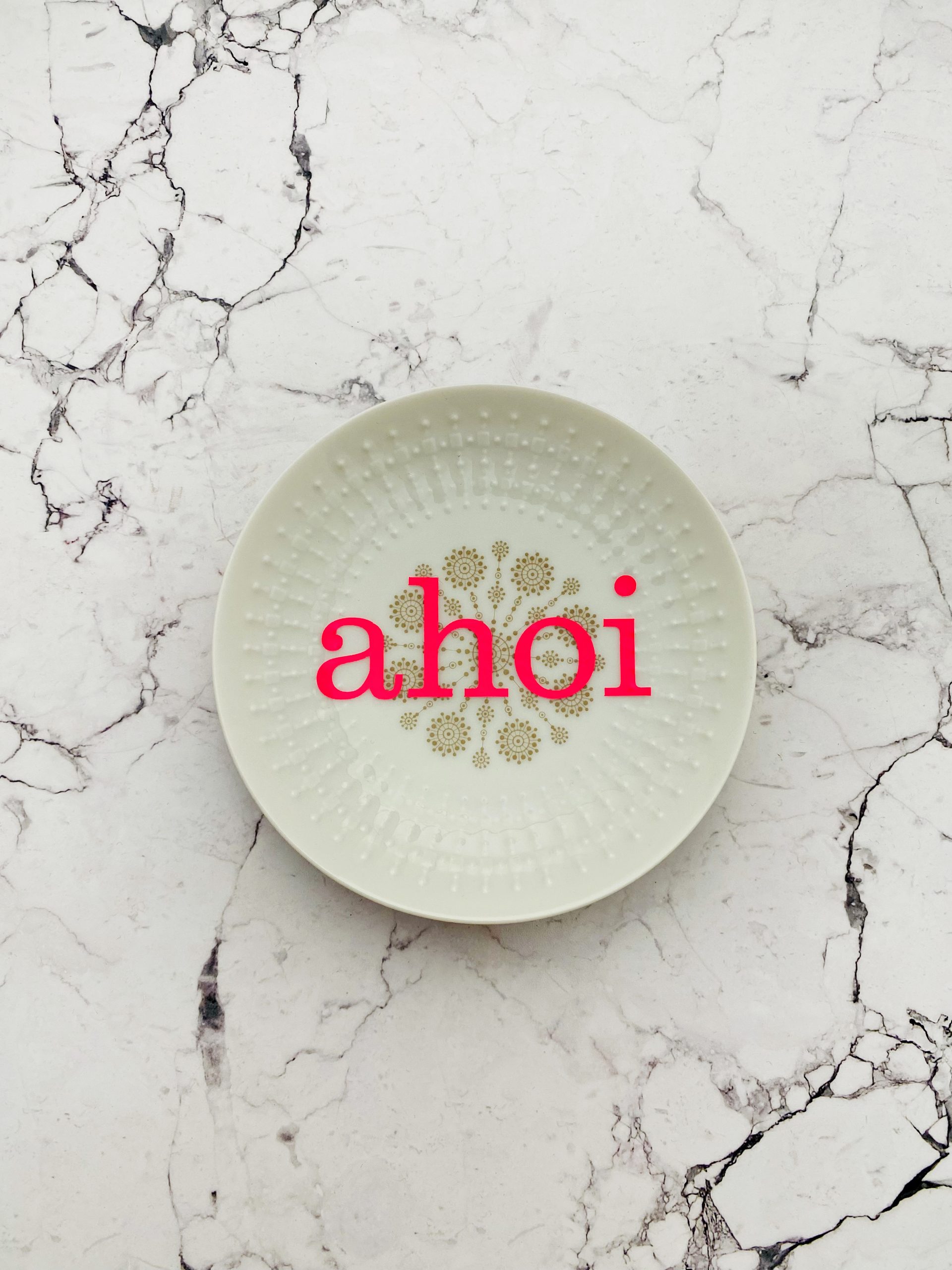 Dieser schöne Wandteller hat ein besonderes Schneeflockendecor und mit unserer ahoi Typo in neonpink ( super knallig, deutlich mehr als wir auf den Fotos abbilden können :)kann er für alle Dekozwecke genutz werden.