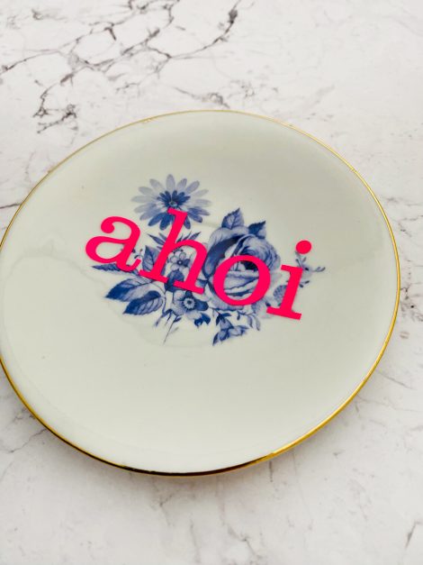 Dieser schöne Wandteller hat ein besonderes blaues Blumendecor und mit unserer ahoi Typo in neonpink ( super knallig, deutlich mehr als wir auf den Fotos abbilden können :)kann er für alle Dekozwecke genutz werden.