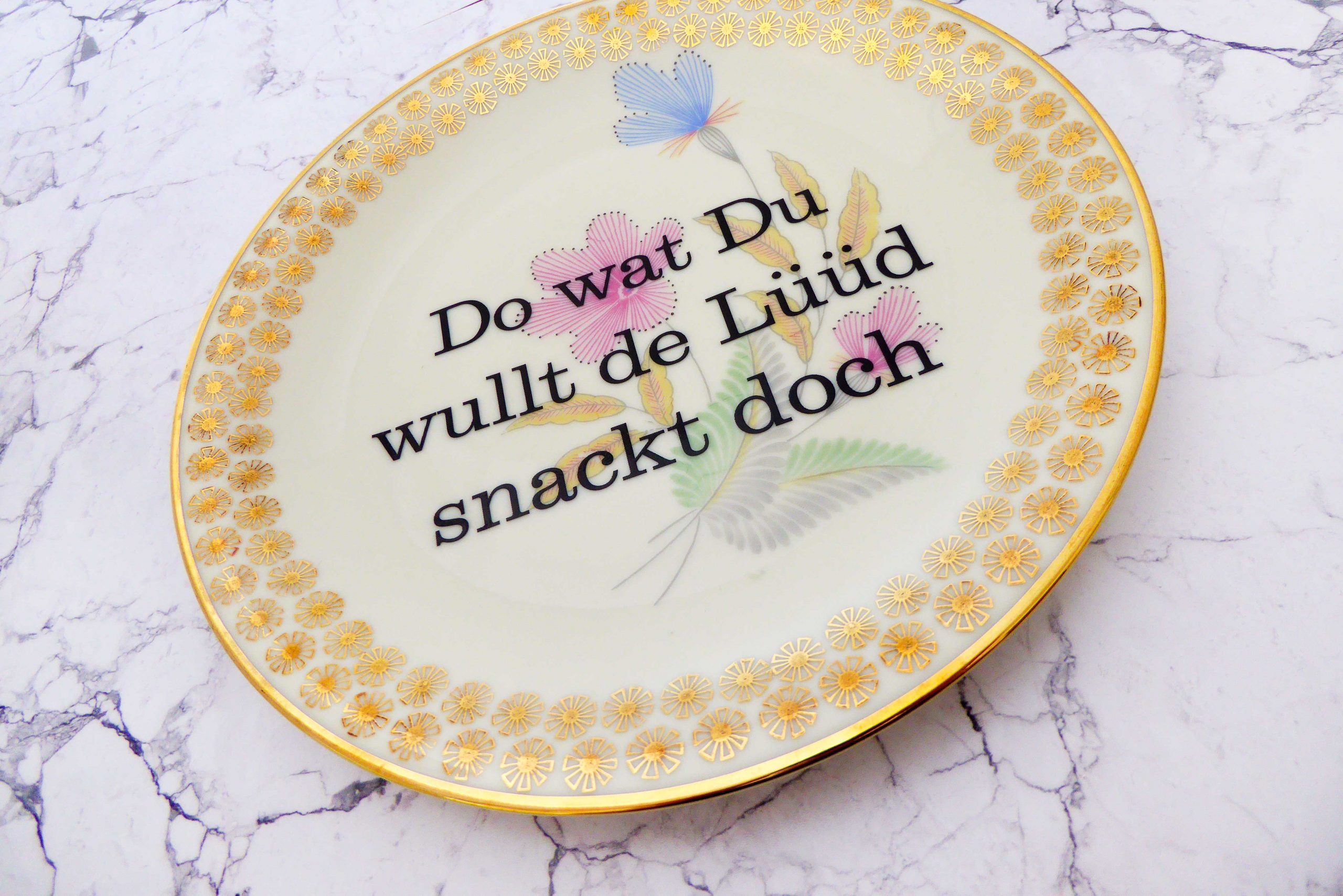 Jeder Wandteller wird handgefertigt und jeder der vintage Teller ist immer wieder ein Einzelstück. Dieser schöne Wandteller hat einen schönen Goldrand, ein Blumen Musterdecor und mit unserer Typo Do wat du wullt kann er für alle Dekozwecke genutz werden.